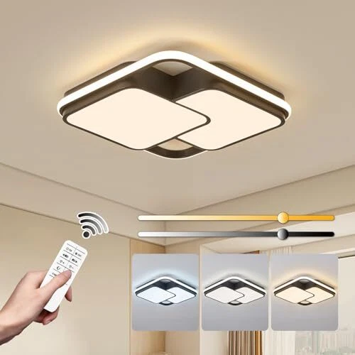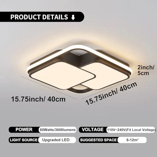 Return Policy Fast Delivery Trusted seller Modern LED Ceiling Light Fixture, 15.7in Dimmable Black Flush Mount LED Ceiling Light with Remote, Upgraded Square Bedroom Ceiling Lamp LED Chandelier for Living Room Kitchen Hallway,60W Product Description ✅【Dimmable with Remote + Various Functions】—Brightness: 10-100%. Color Temperature: 3000-6000K. According to your preference, you can adjust the modern LED ceiling light through the remote. Memory Function & Nightlight Mode can also be achieved via the matched remote.【PS: NOT compatible with wall dimmer switch】 ✅【Upgraded LED Chip + Stable Performance】—Power: 60W. Luminous Flux: 3600lm. (Please watch the display video.) Voltage: 110V-240V (Suitable for local electricity standards). With upgraded LED light source, the semi flush mount LED ceiling light is more efficient and energy-saving, stable and no flicker, soft light protects your family's eyes. The square LED ceiling light has CRI 80+ to capture all natural colors of the objects to get a more comfortable visual experience. ✅【Suitable Size + Widely Used】—Close to ceiling light fixture Length=Width=15.75in/40cm. Fixture Height: 2in/5cm. With its modern design and versatility, this modern LED ceiling lamp is suitable for all interior design styles, can be used in bedroom, living room, kitchen, dining room, hallway, entry way, office, laundry room, porch, hotel,etc.【It can also be installed on sloped ceiling.】 ✅【High Quality Materials + Long Service Life】—This black ceiling light with remote is made of metals and silicone, light transmission over 95%. With exquisite painted craft, the small LED chandeliers ceiling light do not rusts, faded prevention, anti-scratch. Average lifespan: >40,000 hrs. Manufacturers direct source, higher cost performance. ✅【Cost-effective + Easy to Install】—The instructions in the package have detailed steps and legends, you can also scan the QR code to watch the installation video. If you have any questions about the modern light fixtures ceiling, please contact us via the Message Box. Our engineers will reply within 6 hrs. Factory warranty: 2 years. Shipping Returns Payment Shipping Shipping is FREE to all addresses other than APO/PO boxes in the lower 48 states. All our stock ships from US-based warehouses. Shipped via USPS or UPS (depending on location and package weight) Unless stated otherwise, all orders will ship within 24-72 hours of your payment being processed. Check our feedback to see the great reviews of FAST shipping we offer. Returns Seller does not accept returns Payment We currently accept payment via eBay managed payments only. Once payment is cleared, we will dispatch your shipment within 1-3 business days. Please refer to the "Shipping" tab for more information regarding shipping speed to your destination.