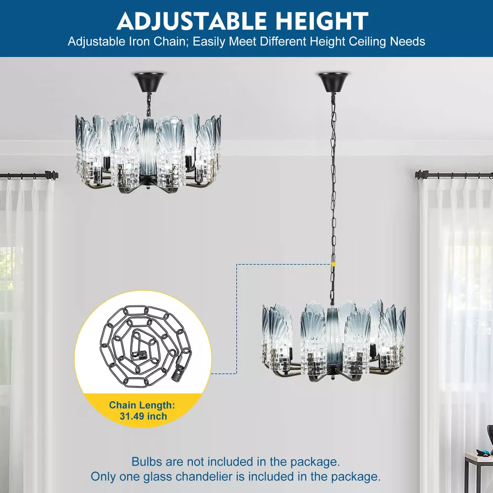Modern Luxury Crystal Glass LED Pendant Lamp Chandelier Ceiling Light Fixture US Description People who like uniqueness and elegance will love this glass chandelier. Its unique and clear glass lampshades make it look more modern, which also can make the light brighter. The ornamental three-dimensional sense will greatly create a gorgeous ambiance for your room, giving you a great surprise. Key Features Standard Lamp Holder: The standard E12 lamp holders can support the use of LED and incandescent bulbs (not included), making it very convenient for you to purchase and replace. Durable and Sturdy: It consists of iron frames with welding and baking paint process, thick glass material lampshades with baking paint process, and an iron chain with cloth cover, making it wear-resistant, rust-resistant, corrosion-resistant, and sturdy. Adjustable Height: The length of 31.49 inches iron chain allows you to easily adjust the height of the chandelier to fit different heights of the ceiling to meet your different needs. Excellent Lighting Effect: The light bulbs (not included) enclose in a circle with a corresponding lampshade, which forms a scattered lighting effect with an area of approximately 161.45-215.27ft² when turned on. You can also purchase adjustable light bulbs to create different atmospheres with different brightness levels. Easy to Clean: The glass lampshades and baking paint iron base allow you to easily remove dust from it with a dry cloth or feather duster. Unique Decoration: The beautiful pattern on each lampshade is combined with the black iron chain above, and the light bulbs (not included) are surrounded in the middle, to bring a unique new Chinese style beauty to your home. Easy Installation: The simple structure, hook design, complete accessories, and detailed instructions allow you or professionals to easily and quickly install this product. Protective Packaging: This product comes in a custom foam board that resists compression and falls to prevent product damage in transit. Details Hanging Plate: It's made of iron with a hook, which can connect the chandelier through the iron chain and fix it on the ceiling with screws easily. Ceiling Plate: It measures 4.72*3.93 inches, increasing the contact area with the ceiling, so that the chandelier body is firmly fixed on the ceiling and not easy to fall. Iron Chain Cover: It's made of soft and high-quality cloth, which can protect the chain from dust and rust. Screw Holes: Each lampshade has two screw holes to fix it on the chandelier frames, offering great stability. Application It is very suitable for corridors, farmhouses, kitchens, nurseries, staircases, dining rooms, bedrooms, living rooms, entrances, foyers, rest areas, reading corners, attics, plant areas, etc. with a height between 8.2-11.5ft, and works well with incandescent or LED bulbs in E12, providing an illumination area about 161.45-215.27ft². How to Install 1. Draw some marks on the ceiling based on the hanging plate holes. 2. Drill the holes based on the marks. 3. Tap the expansion screws into the drilled holes. 4. Fix the hanging plate on the expansion screw and tighten it with nuts. 5. Remove the clear base cover by rotating the circular nut. 6. Insert all light frames into the holes on the base and fix them with nuts. 7. Thread one end of the main wire to the hole of pillar in the middle of the base. 8. Tighten wires of the same color together and put protective covers on. 9. Store all wires in the base and install the base cover well. 10. Install the glass lampshades and place the center hood on the silver pillar in the middle of the base. 11. Install the iron chain. 12. Put on the chain cloth and thread the main wire through the ceiling plate, then fix the other end of the chain to the ceiling plate. 13. Install E12 bulbs (not included). 14. Connect the electrical wires and it can work. 15. Bulbs are not included in the package. Specifications Material: Iron, Glass, Cloth Surface Treatment: Baking Paint, Welding Color: Clear, Blue, Black Shape: Round Style: New Chinese Style Light Fixture Form: Chandelier Control Mode: Switch Type Indoor/Outdoor Usage: Indoor Number of Bulbs: 10PCS (Not Included) Light Source Type: LED, Incandescent Bulb Lamp Holder: E12 Efficiency: E Assembly Required: Yes Power Source: Corded Electric Installation Type: Ceiling Mount Special Feature: Adjustable Height Voltage: 110V Single Bulb Power: 5-16W Illumination Area: 15-20㎡/161.45-215.27ft² Suggested Installation Height: 2.5-3.5m/8.2-11.5ft Chain Length: 80cm/31.49in Ceiling Plate Size(D*H): 12*10cm/4.72*3.93inch Gross Weight: 9kg/19.84lbs Net Weight: 7.55kg/16.64lbs Product Size (D*H): 56.5*33cm/22.24*12.99inch Package Size: 45*45*45cm/17.71*17.71*17.71inch Package Included 1*Glass Chandelier 1*English Manual All Accessories for Assembly Notes Please note that the light bulbs are not included in the package. It can be installed on a horizontal or inclined ceiling. Before installing or cleaning the chandelier, please cut off the power supply first. We suggest that this product be installed by professional personnel. Please allow the slight color difference caused by the shooting light and 1-3cm error due to manual measurement, and make sure you do not mind before you order. Payment Delivery details Terms of sales About us Contact us Payment We accept ebay payment 。 Fees such as import duties, taxes are not included in the item price or shipping costs. These charges are the buyer's responsibility. Delivery details Shipping: 2-9 working days to: USA Terms of sales We maintain high standards of excellence and strive for hundred percent customer satisfaction. Feedback is very important to us. We hope that you contact us immediately before you give neutral or negative feedback, so that we can address your concerns. It is impossible to address issues if we do not know about them! About us Your satis faction is our ultimate goal. We work hard to earn your trust and future business. Our