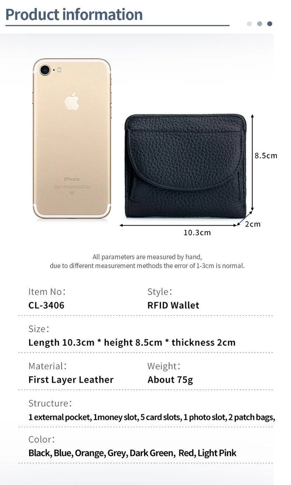 Free and fast shipping , shipping take up 1-7 Business Days 30 Day Return Accepted EASY PAYMENT via PayPal, Credit Card, PayPal Credit, Google Pay... Wallet Credit Card Holder Multicolor Modern Leather Gift Women's Solid Small Product information: 100% brand new and high quality. Size: 10.3x2x8.5CM Color: Multicolor Material: Genuine Leather ItemType: Portable Card Holder Packing: 1PCS Portable Card Holder Note: The dimensions are all manually measured, there may be an error of 1-2 cm, which is a normal phenomenon. REVIEWS The product came very well packaged. I'm very happy. thank you for everything. Seller strongly recommended. This is great! I definitely recommend! Product looks amazing Delivery was fast. Excellent seller, great communication. I advise everyone to buy it!