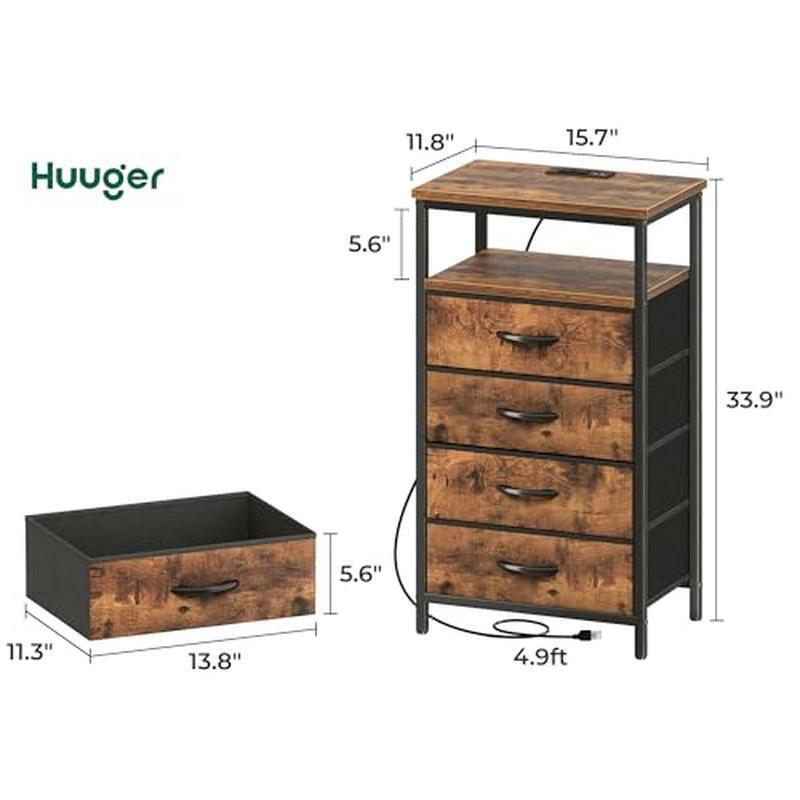 About this item 【Nightstand with Charger Station】More close charging spots, more handy uses. Equipped with 2 USB ports and 2 AC outlets on the tabletop, this fabric dresser allows you to effortlessly charge your devices or lamps overnight, ensuring you wake up worry-free with no low battery concerns. Plus: Contain patent pending drawer slide 【4 Drawer Night Stand】Size: 10. 2''D x 14''W x 5. 6''H. With 4 roomy fabric drawers, this chest of drawers offers plenty of space to stow away your books, clothing, toys, and more. Collapsible, breathable and sturdy, these fabric drawers ensure your belongings are well-preserved and easy accsess. You'll find extra space on the open shelf and tabletop for added storage 【Versatile Placement】This tall dresser utilizes vertical storage. Whether place it in your walk-in closet for growing clothes, set 2 in the entryway as a console cabinet, or in the living room, or bedroom for storage, this end storage table keeps your space clutter-free with style. This kid dresser is also a great addition to a child's room for organizing toys and essentials 【Sturdy and Safe】Crafted with particle board and a robust metal frame, this bedroom dresser with drawers ensures durability and longevity. Secure it to the wall with anti-tip device to prevent items from falling or protect kids when in use. Also, the adjustable feet ensure more stability on the floor and protect against floor scratches 【Quick and Easy Setup】With numbered components, included tools, and clear instructions, this closet storage organizer can be ready in no time, no need to waste your time on tedious assembly. This sleek nightstand with smooth lines and drawer will easily add state in your home space › product details Brand:Huuger Product Dimensions:11. 8"D x 15. 7"W x 33. 9"H Color:Rustic Brown Product Care Instructions:Wipe with Damp Cloth Shape:Rectangular Frame Material:Metal Top Material Type:Engineered Wood You may also like Airtight Stackable Pet Food Storage Container Heavy Duty Dry Dog Food Lockable 35.05 USD 36.89 USD Free shipping 5% off Freeze Dried Emergency Food Raspberries Camping Meals All Natural 10 Can 8 oz US 44.64 USD 46.99 USD Free shipping 5% off Pistol Grip Handgun Sprayer Wand Adjustable Nozzle ATV Spot Trailer 300 psi New 27.78 USD 29.24 USD Free shipping 5% off Crystal Cat Litter Tray Refills 3 Pack Odor Control Leak Protection Durable Home 86.3 USD 90.84 USD Free shipping 5% off Turf Saver Lawn Garden Tire 18X9.50 8 Load Range A Traction All Season Black New 85.95 USD 90.47 USD Free shipping 5% off Dogg Catcher 2 Electronic Predator Call Remote Coyote Fox Sounds 3851,Multi New 74.63 USD 78.56 USD Free shipping 5% off 30 Cans 24 L Electric Cooler Thermoelectric Car Cooler Portable Car Travel Grey 95.53 USD 100.56 USD Free shipping 5% off Mobile Tool Storage Stack System Tool Box W/ Dividers Organizer Durable Plastic 32.78 USD 34.51 USD Free shipping 5% off Polyethylene Shrink Wrap 7mil 14ft X 50ft Boat Film Heat Gun Use Storage Durable 180.21 USD 189.69 USD Free shipping 5% off Locking 4-Bike Hitch Rack 2 Inch Receiver Quick Install Secure Carrier 140lbs US 291.55 USD 306.9 USD Free shipping 5% off Kettle Cooked Potato Chips Variety Pack 40 Single Serve Bags Snacks On-the-Go US 27.61 USD 29.06 USD Free shipping 5% off 8Ft Extendable Tailgate Table Foldable Camping Outdoor Canopy Not Included White 82.46 USD 86.8 USD Free shipping 5% off