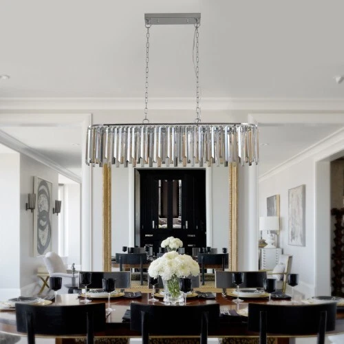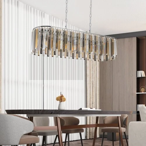 Description The clever combination of metal and crystal, the simple shape is full of artistic atmosphere, can decorate the whole room and make the whole room bright.Ideal decor Luxurious, elegant, modern industrial retro design to add a pop of color to your space.This crystal lamp is the best element to create a relaxing and peaceful mind atmosphere, put it in the room and you will get an amazing romantic and charming atmosphere.(Composed of stainless steel and K9 crystal.The hanging chain with a 39 -inch suspension can adjust the height according to your layer height.It needs 8 E12, 60 -watt candlelight bulb.This product does not contain a light source.) Features High -end K9 crystal -made of exquisitely -cut cubic patterns, with transparent, amber, gray crystal strips, can reflect light exquisitely. High quality - Made of a high-quality metal frame, first-class crystal, processed with excellent technology, safe, durable, anti-corrosion, and non-fading. Great light transmission - With an anti-glare shade, the chrome crystal chandelier has the best light transmission, light can be refracted to the ceiling, making the lighting full of beauty. Easy to install, non-professionals can easily install.