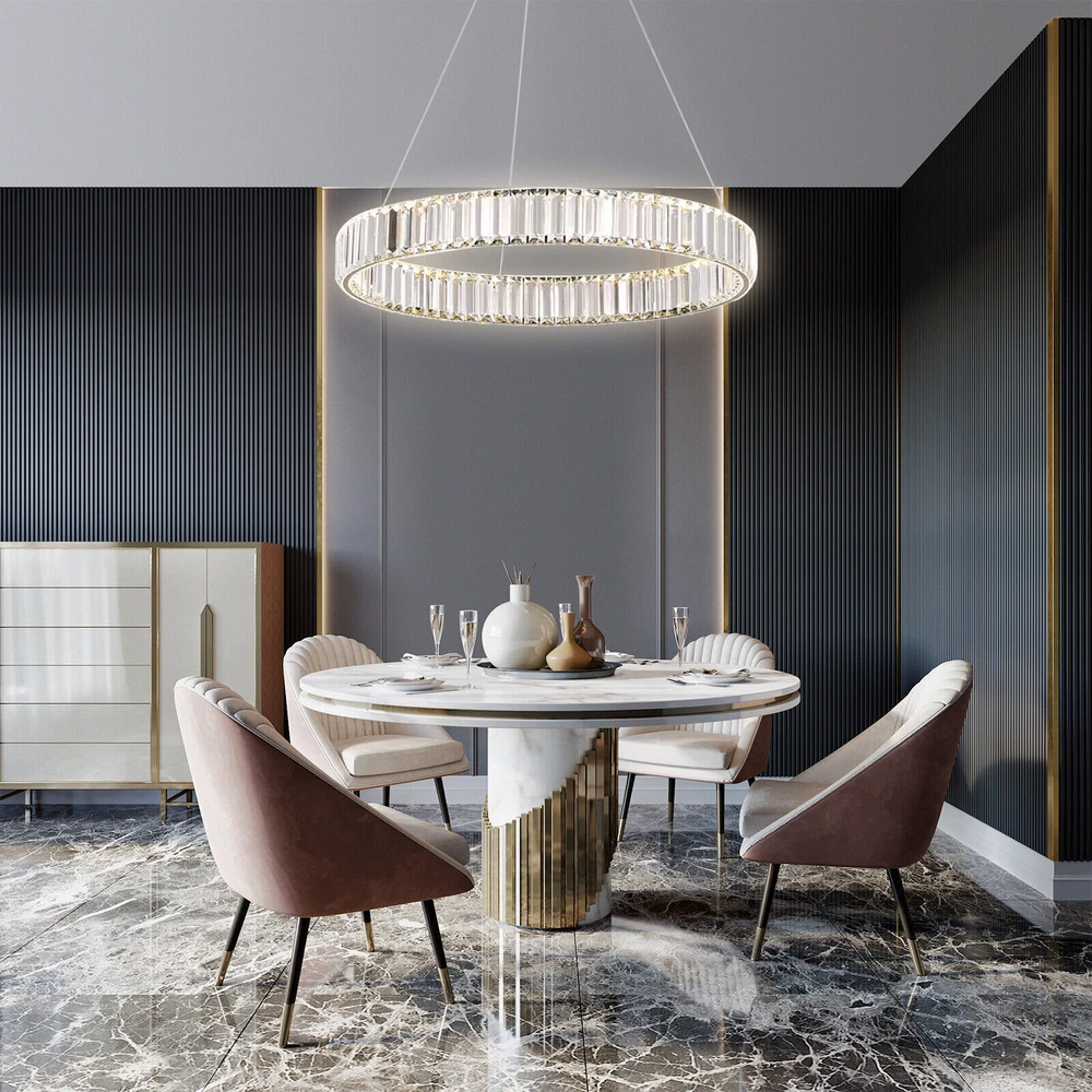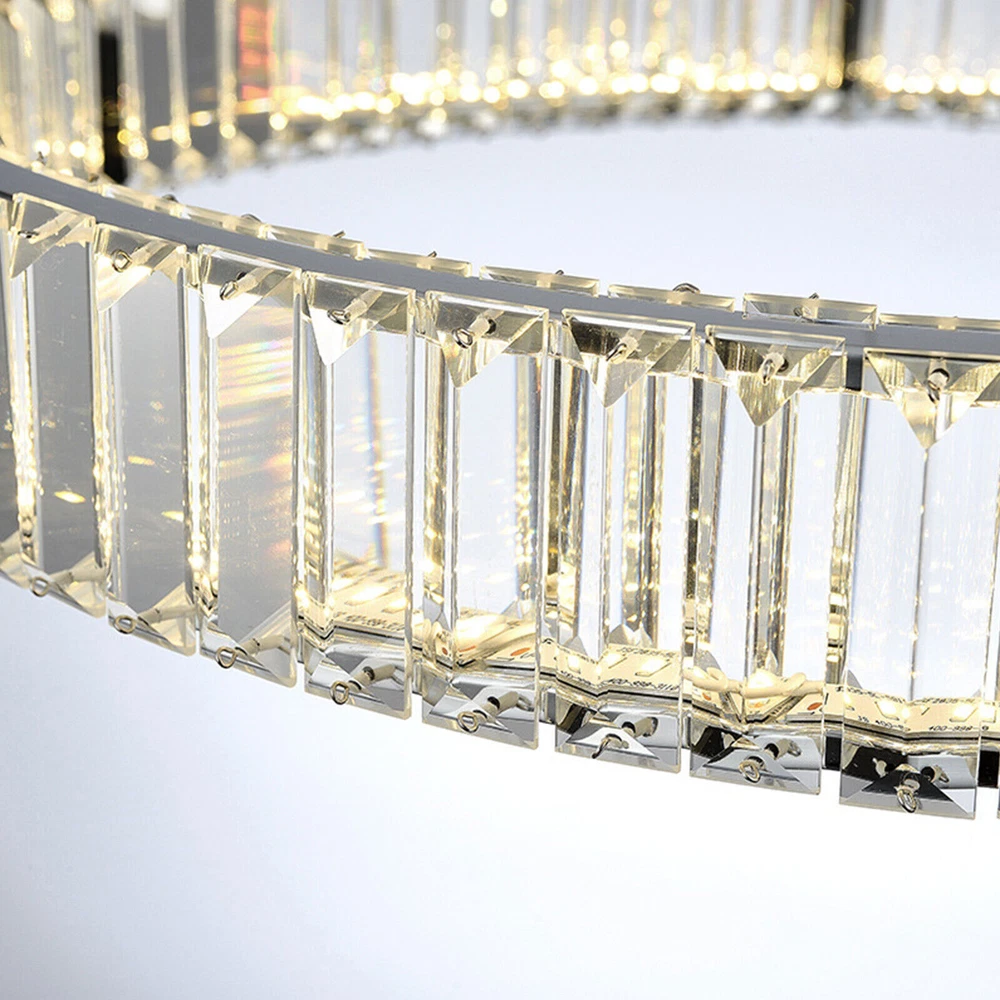 Modern Round Crystal Chandelier Pendant LED Lamp Ceiling Lighting Light Fixture About this item * HIGH QUALITY MATERIAL: LED pendant lights with the polish stainless steel and glass crystals, the sparking crystal glass prisms will create a glamour and brilliant room for you. * SPECIFICATION: Ring size: diameter31.5 inches, The strings are 39.3" Long adjustable, you can adjust the height of the ring easily by using the cable locking pins; Perfectly fit the height of your ceiling * DIMMABLE : Dimmable with traditional dimmer switches, 5%-100% dimming range. Dimmer switch is excluded. * ENERGY SAVING: 25W modern chandeliers, Voltage=85-265V, Light Source: LED chips, Light Color: 3000K-4500K-6000K(Warm light-Warm White- White), perfect for living room ,bedroom,dining room ,restaurant,porch etc. Please check the farmhouse chandelier lighting fixtures ceiling size before buying. The luminaire does not include a dimmer. Specifications: LED pendant light size: Diameter 31.5 inches × Height39.3 inches Power: 25Watt Working voltage: 110-120V 50/60Hz Lumens:1500 lumens Light color:3000K-4500K-6000K(Warm light-Warm White- White), Material: Stainless steel + Crystal Glass Light Body Color: Chrome finish Light Source: SMD2835 led chip, above CRI 80 index Feature of modern chandelier : 1. Energy saving: SMD2835 LED light source, which is 90% high-effective than traditional incandescent bulbs, will save a lot on your power bill. 2. Long lifespan: Better heat dissipation, can be used over 30000 hours. 3. Adjustable height: The lighting fixtures hanging string wires are adjustable, you can adjust the height of the wire easily by using the cable locking pins. 4. Wide applications: Modern and elegant design rustic chandelier, ideal for pendant lights in living room, kitchen island lighting, bedroom mini chandelier, study room hanging light fixtures, foyer small chandelier, etc. 5.You can dim the brightness of the chandelier light fixture according to your needs. Tips: · We recommend installing by professionals · -When installing and cleaning light, youmust cut off the power supply. Payment Delivery details Terms of sales About us Contact us Payment We accept ebay payment 。 Fees such as import duties, taxes are not included in the item price or shipping costs. These charges are the buyer's responsibility. Delivery details Shipping: 2-9 working days to: USA Terms of sales We maintain high standards of excellence and strive for hundred percent customer satisfaction. Feedback is very important to us. We hope that you contact us immediately before you give neutral or negative feedback, so that we can address your concerns. It is impossible to address issues if we do not know about them! About us Your satis faction is our ultimate goal. We work hard to earn your trust and future business. Our certified technicians have tested each item before shipping. The unit comes with 1 year limited warranty on all manufacturing defects. a) If you receive a defective item, you may return it or ask for a discount. Please contact us within 14 days after you receive the package. b) What you returned must be intact and in its original packaging as re? u. Customer is responsible for shipping costs of the returned item. c) We will cover the cost of shipping back t with the shipping rate indicated in the registration page. We will send you a new unit or refund the full payment you paid. Thank you. Contact us Business Hour Business Hour: Monday To Friday: 8:30 AM to 5:00 PM (Beijing China time) Due to time zones, our reply to your questions may not be immediately. But within above working time, we will reply your email within 24 hours. If it's non-workdays, please kindly be patient and wait till Monday. Please contact us with ebay message. Please feel free to contact us if you have any questions. Monday To Friday: 8:30 AM to 5:00 PM (Beijing China time) Due to time zones, our reply to your questions may not be immediately. But within above working time, we will reply your email within 24 hours. If it's non-workdays, please kindly be patient and wait till Monday. Please contact us with ebay message. Please feel free to contact us if you have any questions.