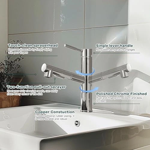 Menu 1. We require immediate payment. 2. We currently accept payment via eBay managed payments only. 3. Once payment is cleared, we will dispatch your shipment within 1-3 business days. Please refer to the "Shipping" tab for more information regarding shipping speed to your destination. Kitchen Faucets, Chrome Kitchen Faucet with Pull Down Sprayer, Modern Stainless Steel Kitchen Sink Faucet Commercial RV Kitchen Faucet with Deck Plate 2 Modes Spray Spot Resist Product description SIMPLE AND STYLISH DESIGN: With a body height of 8.9 inches, the chrome kitchen faucet is both aesthetically pleg and space-saving unlike traditional high arc faucets, and fits most sinks, single or double. With a pull-out length of 19 inches, both adults and children can easily complete tasks such as filling containers and cleaning all corners of the sink. NO WATER LEAKAGE: The pull out kitchen faucet main body and internal piping are made of solid brass with tight joints that won't leak. The rv kitchen faucet can save 30% water. Two SPRAY MODES : The pull-out sprayer on the kitchen sink faucet with TWO spray setting modes (STREAM and SPRAY) for a steady, gentle, splash-free water flow, both of which can be used for different washing requirements. DURABLE FINISH: Our stainless steel kitchen faucet have a 5-layer surface coating that is rust and fingerprint resistant and easy to clean, simply scrub the pull down kitchen faucet with a damp cloth for a clear and neat look. AFTER SALE SERVICE: Feel free to contact us if you have any questions about our kitchen faucet with pull down sprayer, we will solve the problem perfect. PLEASE MESSAGE US IF YOU HAVE ANY OTHER QUESTIONS, AND MANY THANKS FOR READING ALL OF THIS. Copyright ©#. All Rights Reserved.