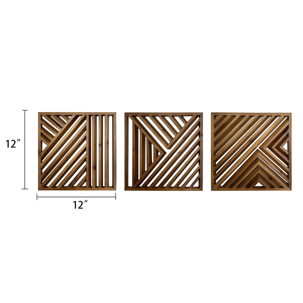 this geometric set of 3 wall sculptures can transform any natural setting background into an artistic display. This item ships in 1 carton. nails and screws not included. Suitable for indoor use only. This item ships fully assembled in one piece. This brown colored wood wall sculptures comes as a set of 3. The size is 12x0.75x12 inches Home wall decoration gifts:This wooden home decor can be a nice housewarming gift on birthdays, wedding days, anniversaries, holidays, Valentine's Day, Christmas for your friends and family. Practical and Durable: Our wooden decorative pieces are not only visually appealing, but they also have a long life span thanks to the sturdy fir wood material used in their construction. You can enjoy their aesthetic appeal for years to come. Set includes: 3pieces of rustic Minimalist Wooden Decoration with a solid wood border that is sturdy and reliable. Wide Applications: abstract and attractive, our geometry wood wall art can be applied in many places, such as living rooms, bathrooms, kitchens, bedrooms, study rooms, offices, porches, hallways and more, enhancing your room decoration from details Stylish Wall Decor: Measuring approximately 12x0.75x12 inches, our wooden decorations make for visually appealing hanging and wall adornments that add an elegant touch to any room.