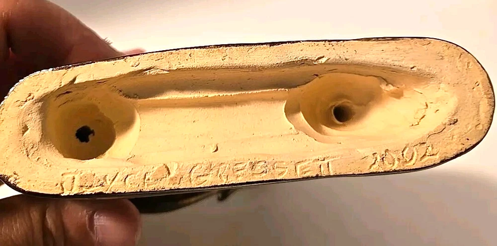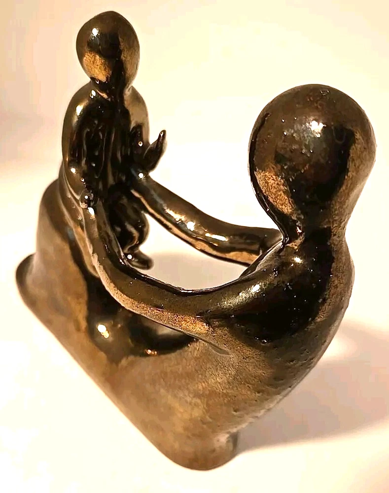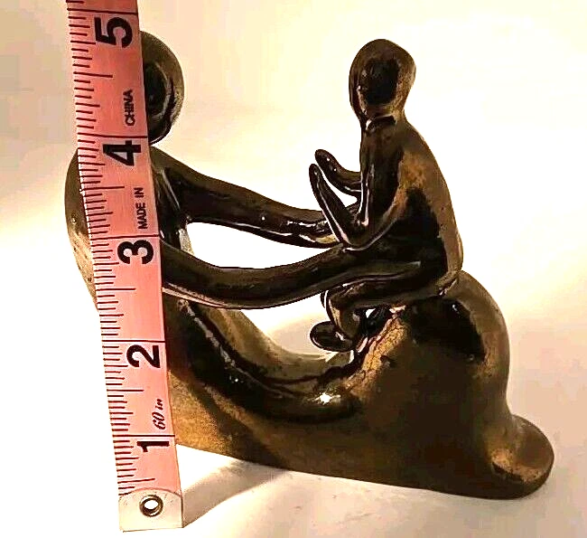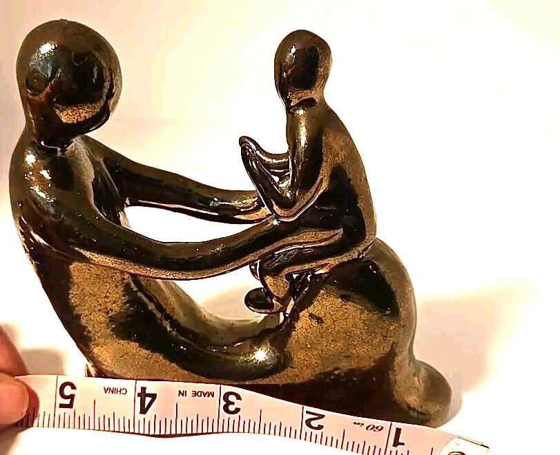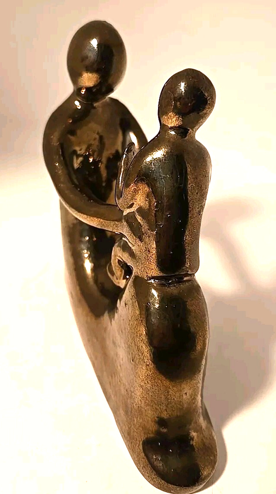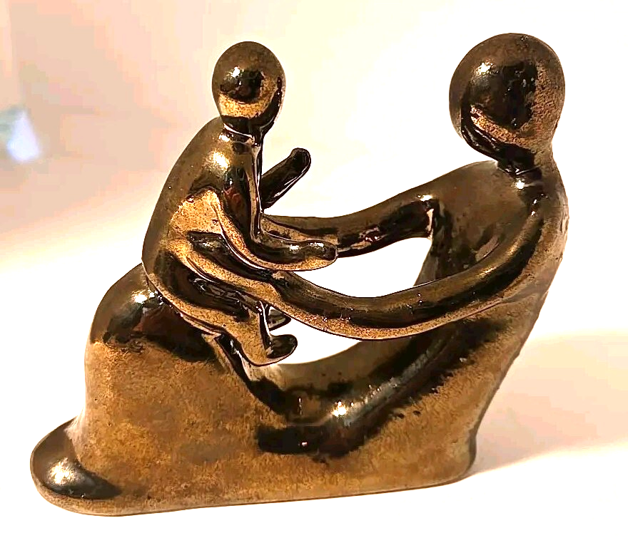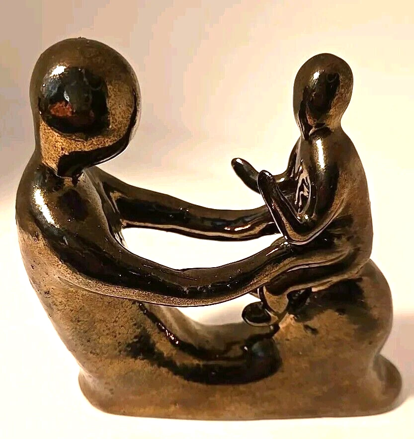 This exquisite sculpture depicts a modernist mother and child engaged in a playful activity. Crafted from bronze and clay, this handmade piece is signed by the artist Joyce Gressett and stands at 5 inches in height and width. The sculpture is an original production from 2002 and is perfect for any contemporary art enthusiast. The sculpture features a minimalist and abstract design that is consistent with modernist art principles. It is a perfect addition to any art collection and can be placed on a table or any other surface. This piece is a must-have for anyone who appreciates the beauty and complexity of contemporary art.