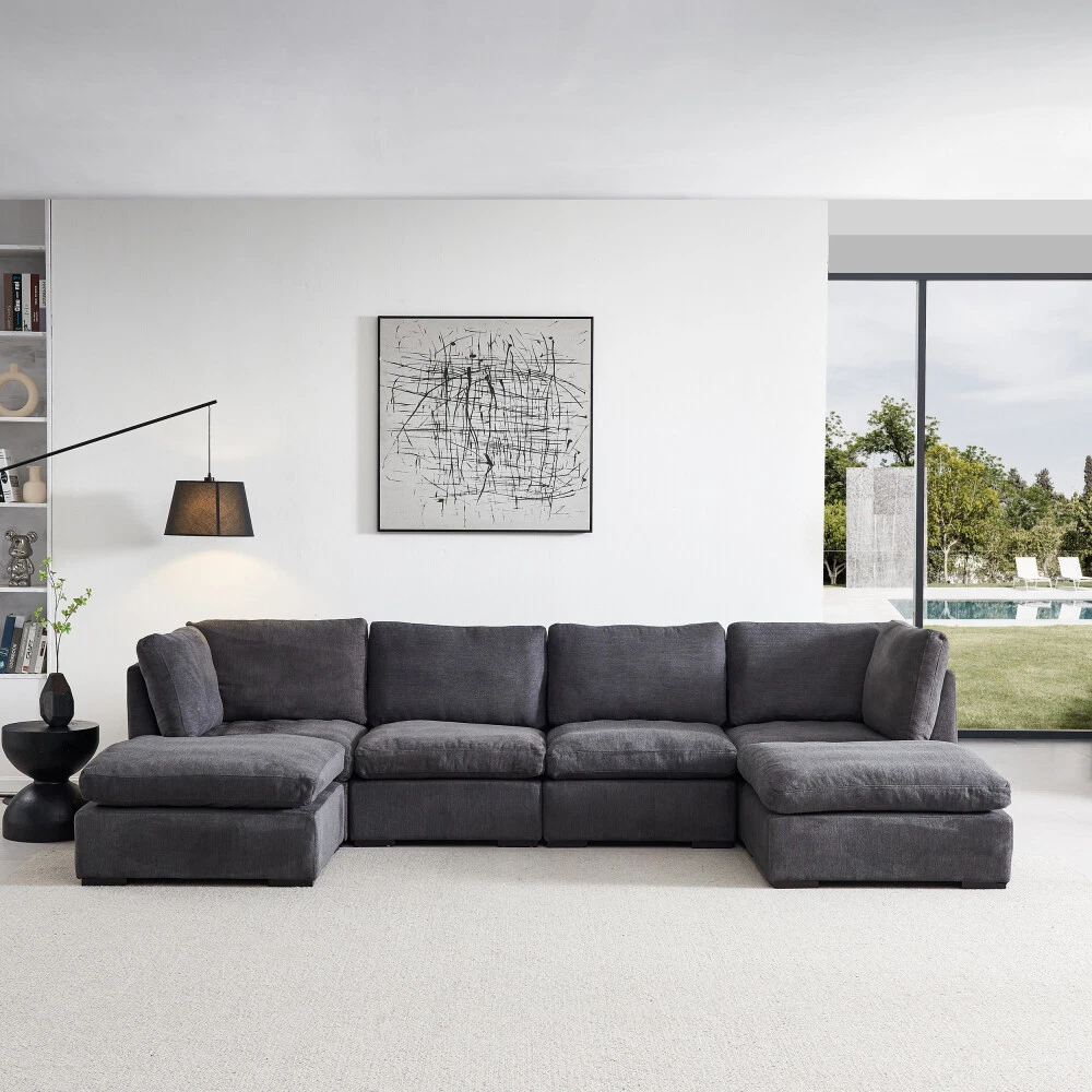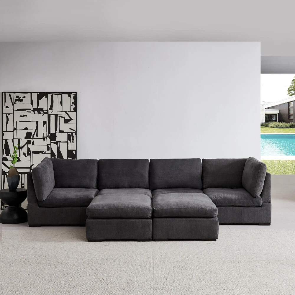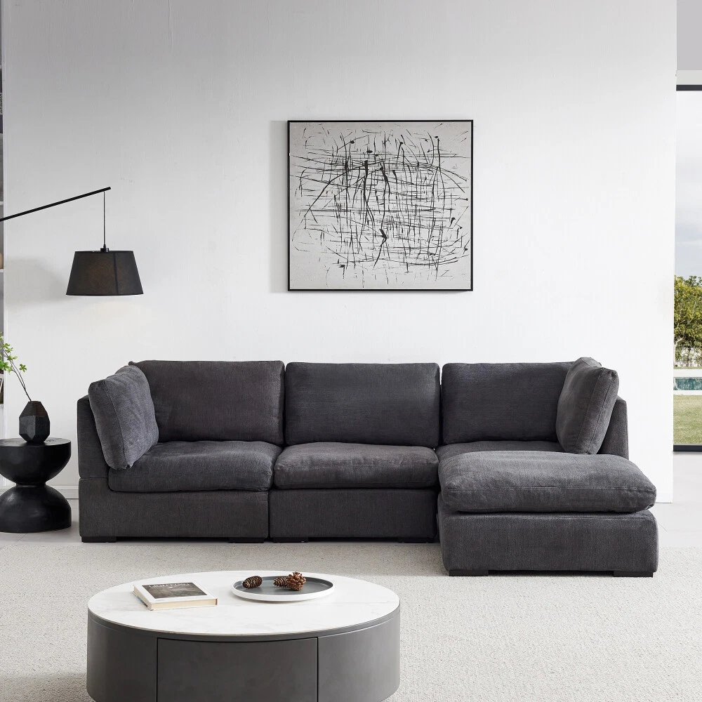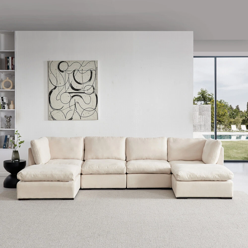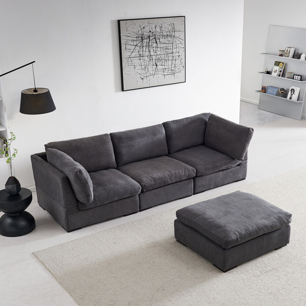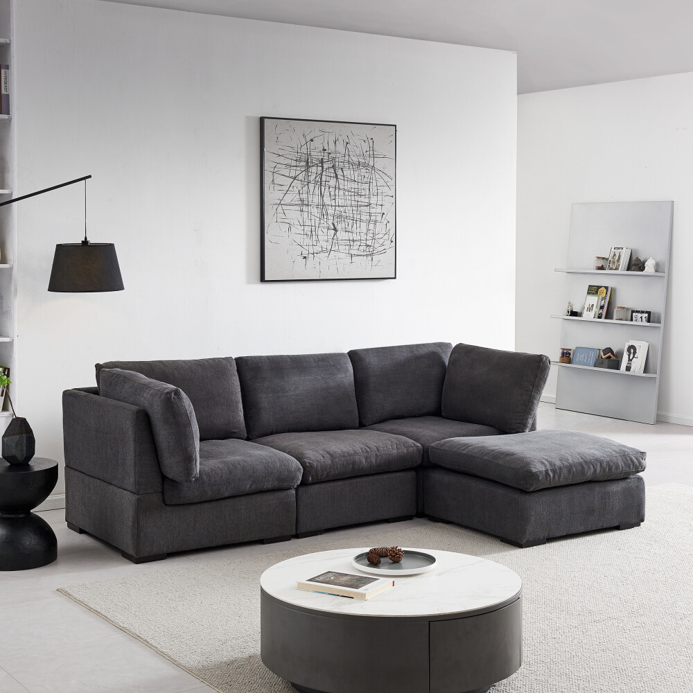 Modular Down-Filled Sofa with Ottoman in Soft Linen Fabric