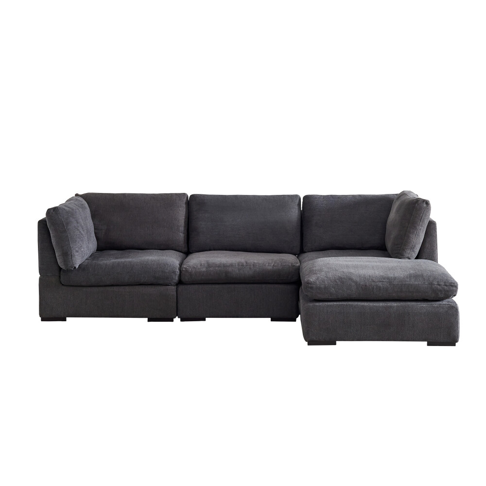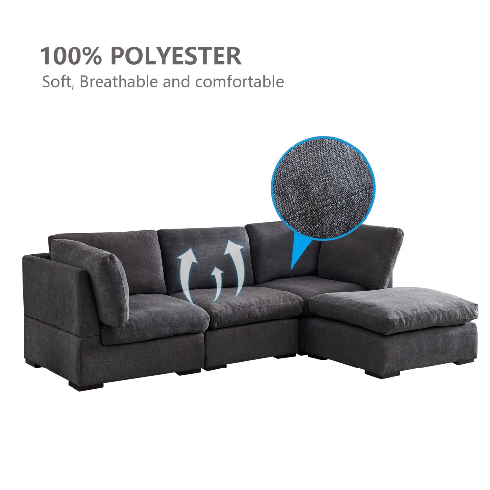 MODULAR SOFA:Each seat of the modular sofa can be moved freely or fixed with screws from the bottom,so that it can be meet with your different needs. COMFORTABLE:The sofa frame is made of solid wood, springs, and high elasticity sponge, making it not too hard and elastic for you to sit on. In addition, the soft and skin friendly fabric and down filling cushion make you feel very comfortable. HIGH QUALITY MATERIAL: The sofa fabric is 100% polyester, with a soft and skin friendly texture, and the sofa legs are solid wood.Seat cushion is filled with down and polyester, providing a very comfortable sitting experience. Sitting on them after a tiring day will make you feel incredibly relaxed. Whether for leisure or relaxation, this sofa is a perfect choice. ASSEMBLY: Assembly is needed. All the tools are included which is hidden in the bottom of each seat.An adult can finish assembling within 30 minutes. SEVERAL PACKAGE DELIVERY:The whole set L shape sofa would be shipped in four separated boxes,we ship them on the same day but the carrier may deliver to your address on different days,if so,please wait patiently and make sure you get all boxes.Any questions,don't hesitate to contact with us. Product Specification Product Type L Shape Modular Sofa(Three Single Seat+One Ottoman) Overall Dimension 99"L x 68.9"W x 31.5"H Overall Product Weight 195.8lbs Number of combined pieces 4 Seating Capacity 4 Upholstery Material Component 100% Polyester Seat Cushion Fill Material Down+Polyester Back Cushion Fill Material Polyester Frame Material Solid Wood+Plywood+Spring Wood species Eucalyptus Leg Material Solid Wood(Rubber wood) Leg Color Dark brown Seat Construction Sinuous Springs Foam Density 1.7lbs./cu.ft. Arm Type Oblique Toss Pillows No Removable Cushion Cover Yes Reversible Cushions No Storage No Weight Capacity 300lbs each seat On Mar 6, 2025 at 22:58:38 PST, seller added the following information:
