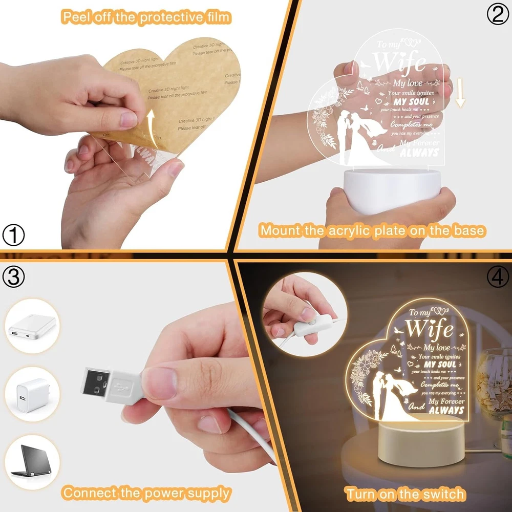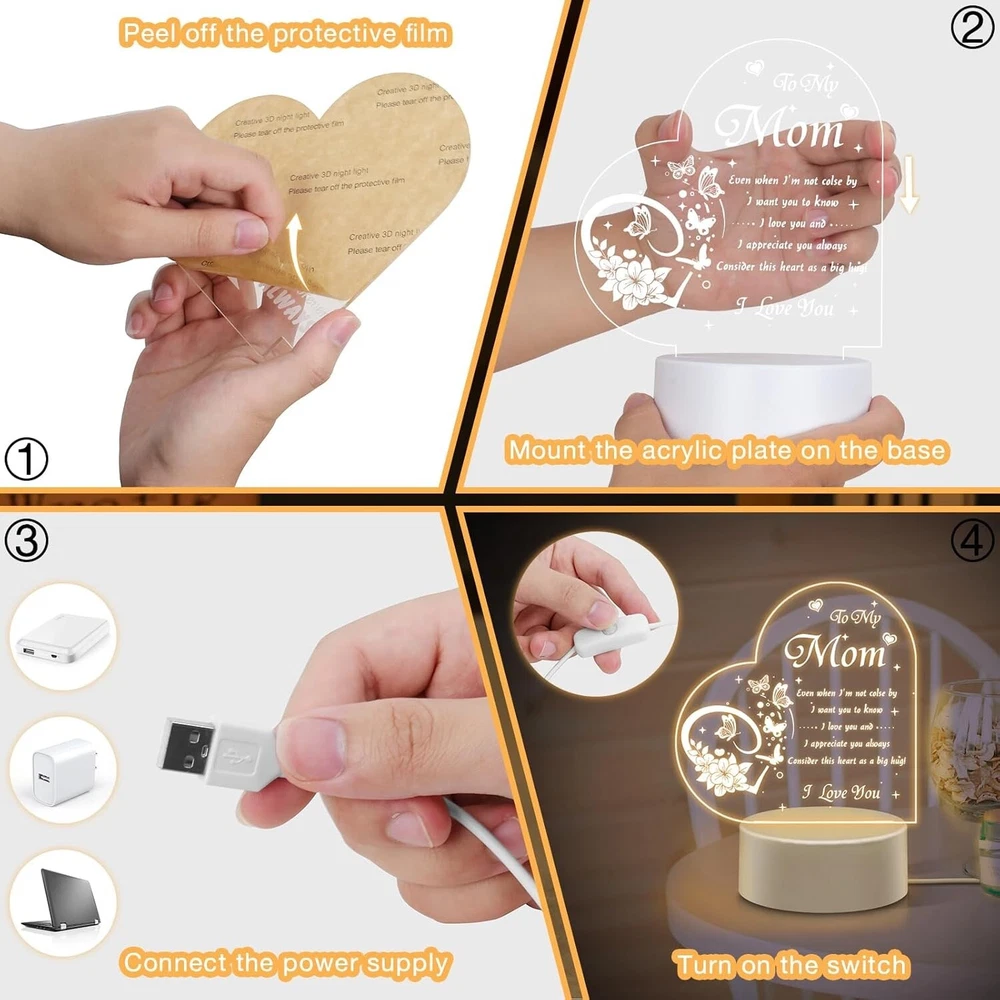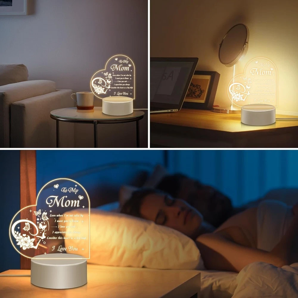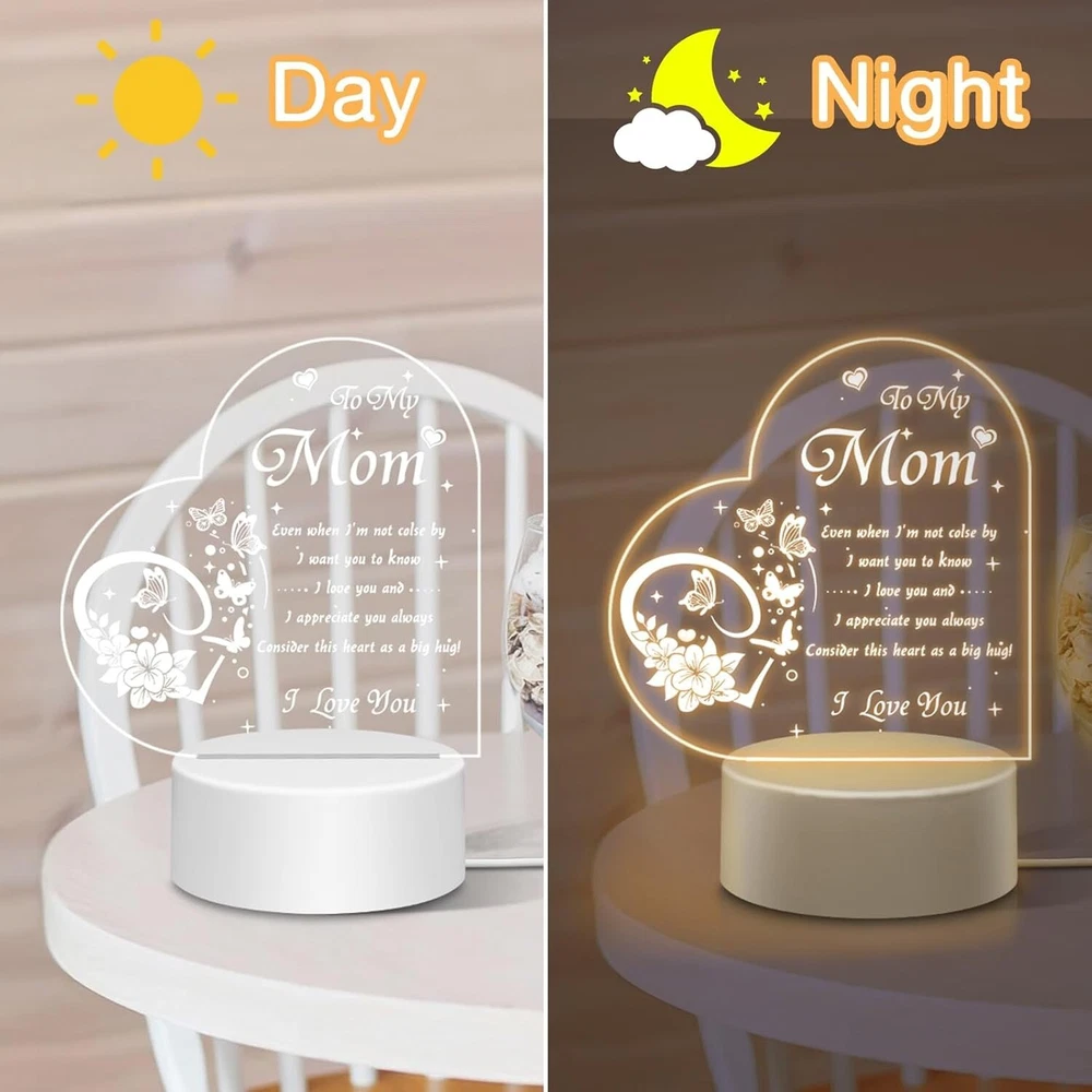 Mother: 【Gifts for Mom】 This personalized night light is engraved with heartwarming words -"Even when I'm not colse by I want you to know I Love you and I appreciate you always consider this heart as a big hug! I Love you"; This night lamp present to express your love for your mother, mom is a great woman that we are most thankful. 【Mom Birthday Gifts Ideas】The night light is made of acrylic and a base, with acrylic light guide plate to bring you a soft lighting effect, the light will not be too strong or too weak, non-flickering and non-glaring, even if you wake up in the middle night, it won’t be dazzling and create the ideal sleep environment for your family. Expressing sincere gratitude for her. USB charging port for PC, charger and mobile devices, et 【Gifts Birthday Gifts For Mom】When you receive the goods, you will find that there is a protective film on the night light. You need to tear it off before use. Be careful not to leave fingerprints when installing. if you are not careful, you can wipe it off to achieve the best visual effect. This LED lamp is great gifted for different special occasions. 【Happy Gifts for Mom 】Every time mom sees this night light engraved with heart-warming words, she will feel strong love. This is a surprise and amazing gift to your Mom.This mom night light for women is the choice. Wife: 【Gifts For Wife 】This personalized night light is engraved with heartwarming words - "To my Wife My Love Your smile ignites MY SOUL your touch heals me and your presence Completer me you are my everying My Forever and ALWAYS". This night light present to express your love for your wife. 【Mothers Day Gifts For Wife 】The night light is made of acrylic and a base, with acrylic light guide plate to bring you a soft lighting effect, the light will not be too strong or too weak, non-flickering and non-glaring, even if you wake up in the middle night, it won’t be dazzling and create the ideal sleep environment for your family. Expressing sincere gratitude for her. USB charging port for PC, charger and mobile devices, et. 【Wife Gifts 】When you receive the goods, you will find that there is a protective film on the night light. You need to tear it off before use. Be careful not to leave fingerprints when installing. if you are not careful, you can wipe it off to achieve the best visual effect. This LED lamp is great gifted for different special occasions. The night lamp marriage will bring wife lucky and happiness. Let your wife know that she will always be in your heart. Let your wife know how important she means to you. 【Birthday Gifts For Wife】Every time sister sees this night light engraved with heart-warming words, she will feel strong love from her sisterhood . This is a surprise and amazing to your sister. She will love it. Suitable to apply as home decoration in your bedroom, living room, dining room, etc.