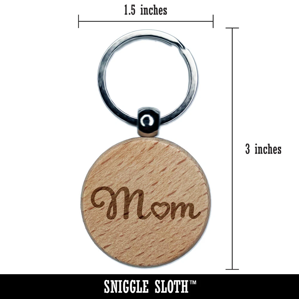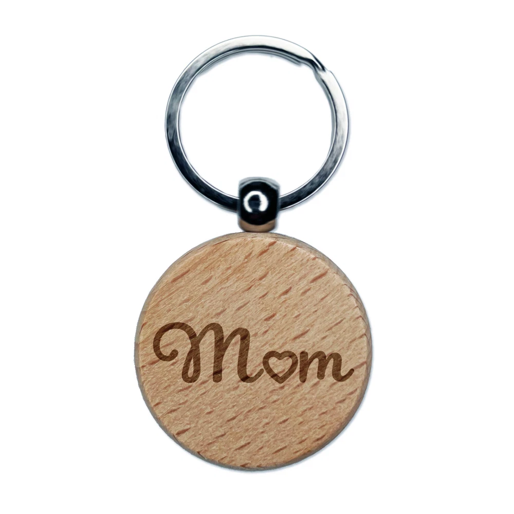 Mom with Heart Engraved Wood Round Keychain Tag Charm