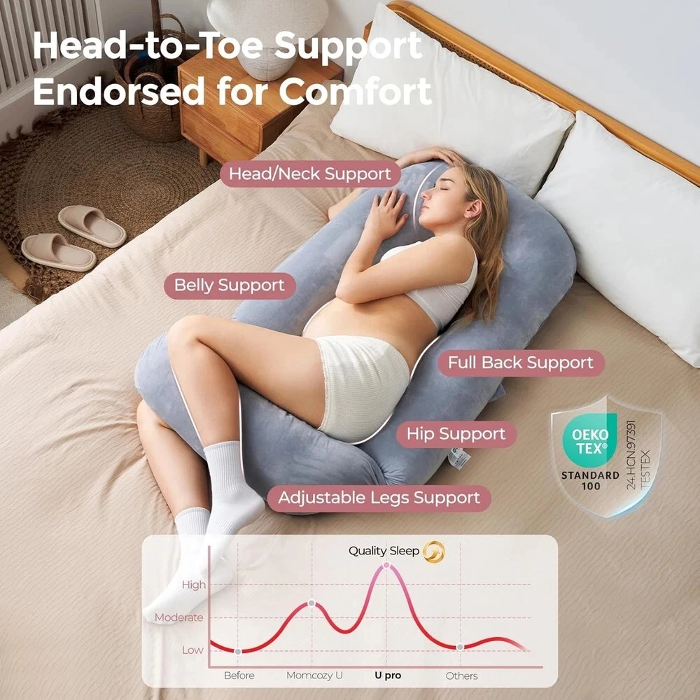 About this item Pioneering Upgraded - Upgraded from traditional U-shaped pillows, Momcozy U Pro maternity pillow's innovative slide leg pillow allows you to customize angle or collapse for effortless nighttime movement, eliminating the need to climb over fixed barriers. Ergonomic Full-Body Support - Designed with 5-point contouring to cradle your head, back, belly, hips, and legs in optimal alignment. This pregnancy body pillow adapts to your body’s pressure points, promoting blood circulation, reducing back pain and hip strain while maintaining natural spinal alignment for deeper, restorative sleep. Safe & Durable for Lasting Comfort - Crafted with OEKO-TEX certified fabric, this pillow ensures safe contact for sensitive skin. Filled with premium polyester, retains its shape after weight is placed on it night after night. Just enjoy uninterrupted sleep with Momcozy full body pillow, even during third-trimester restlessness. Multi-Purpose Use - Momcozy pillow is quite flexible so that you can change it in various positions, such as watching TV, or reading, or change the places on your body you want to support. Universal Comfort for Every Body - Extend this versatile pillow from 50" to 72" with its adjustable leg section to fit all body types, from petite to taller. Ideal for side/back sleepers, pregnancy recovery, or chronic pain relief (sciatica, fibromyalgia, reflux). A thoughtful gift for expectant moms, post-surgery recovery, or anyone prioritizing sleep.