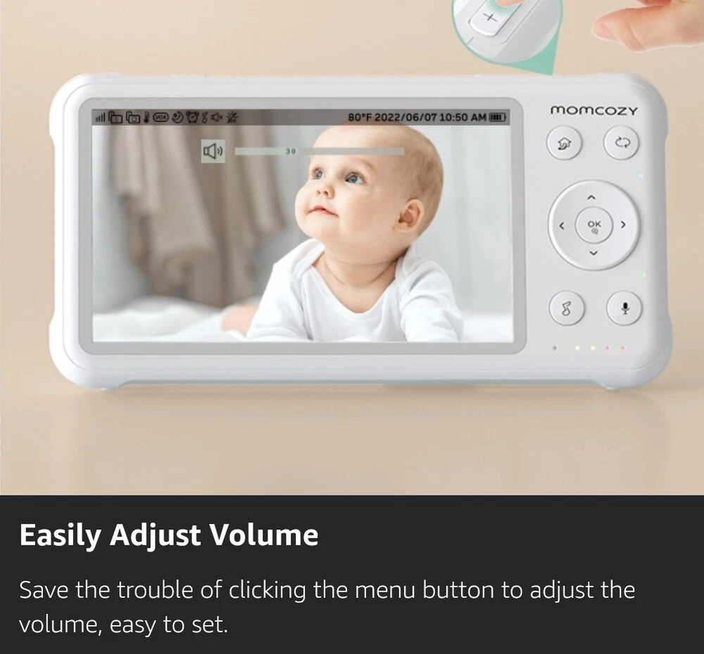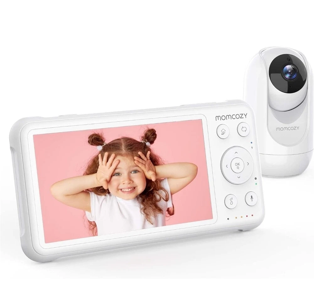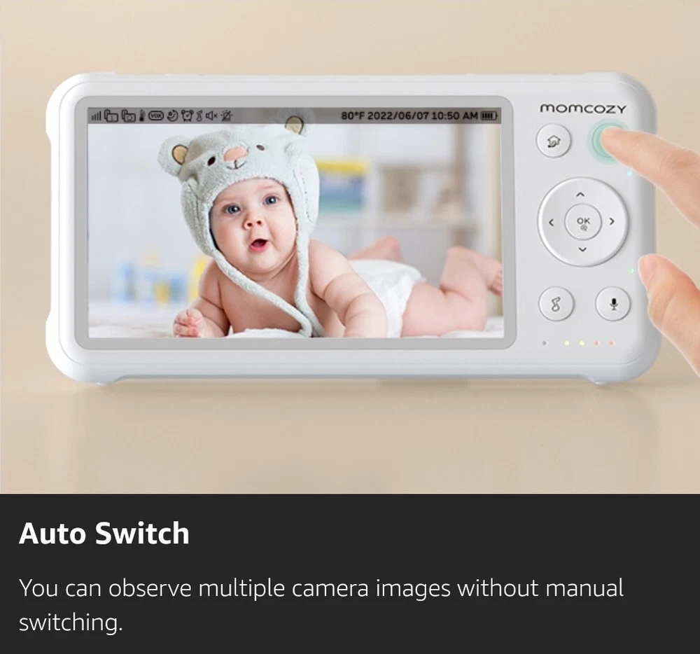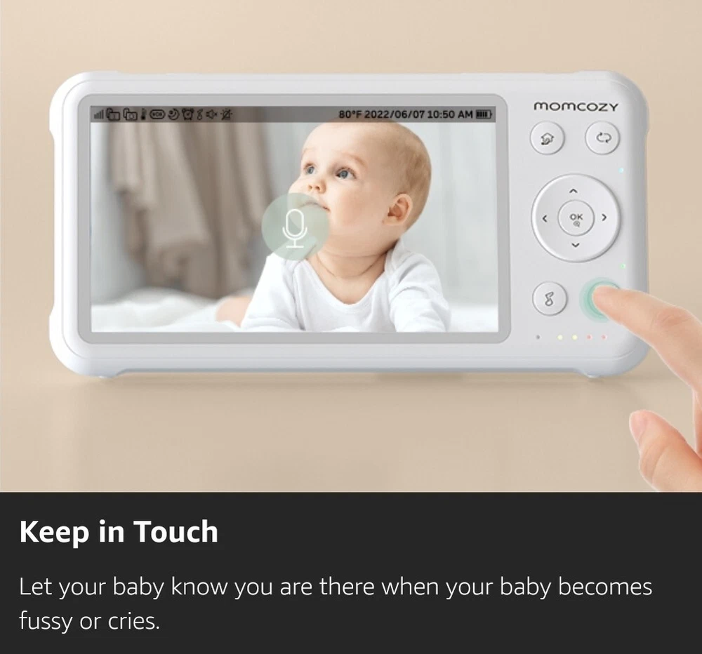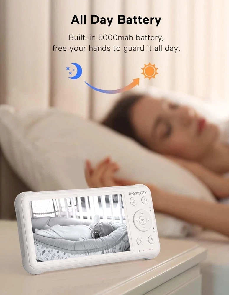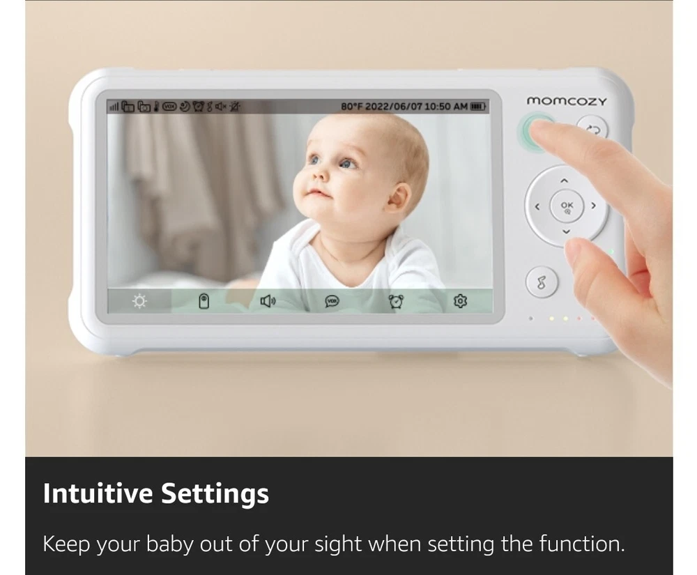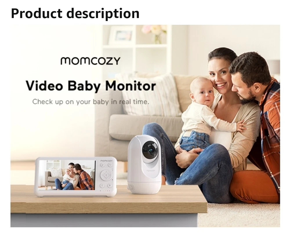 #887 Momcozy Video Baby Monitor, 1080P 5" HD Baby Monitor with Camera, Clear Video Image, Ideal Sound Quality, Sound Detection, Two-Way Talk, New Mom's Choice Top highlights Recommended Uses For Product: Indoor Security Brand: Momcozy Connectivity Technology: FHSS Special Feature: Easy to Install Compatible Devices: 4 Power Source: Battery Powered 【Experience Peaceful Nighttime Monitoring】- Rest assured knowing that the infrared night vision feature provides clear visibility even in complete darkness. The 5000mAh rechargeable battery ensures that the baby monitor with camera and audio can last throughout the night, with a battery life of up to 11.5 hours, allowing you to stay informed about your baby without any concerns. 【Feel Assured, not Uncertain】- The 1080p HD camera and 5'' large display will continuously monitor your baby, making you feel as if you are right there with them. Whether you are working, doing chores, exercising, or simply relaxing, a quick glance at the screen will bring a sense of peace and reassurance. 【Be Responsive to Your Baby's Needs】- Instantly hear your baby if they become fussy or cry, with the screen lighting up automatically when VOX is activated. This enables you to attend to your baby promptly whenever they require your attention. Whether soothing them with a lullaby or communicating through the screen, it provides a secure and comforting sense of connection. 【Secure Local Video Transmission】- By using a 2.4GHz FHSS connection, there is no need for wifi or an app, ensuring that hackers cannot remotely access your camera. Our baby monitors operate on a closed loop system, providing you with a secure and private connection where only you can view and listen. 【Simple Setup and Easy Operation】- Just plug in the camera and turn on the monitor for an instant connection with no pairing required. The monitor is ready to use, eliminating the need to read through extensive instructions.