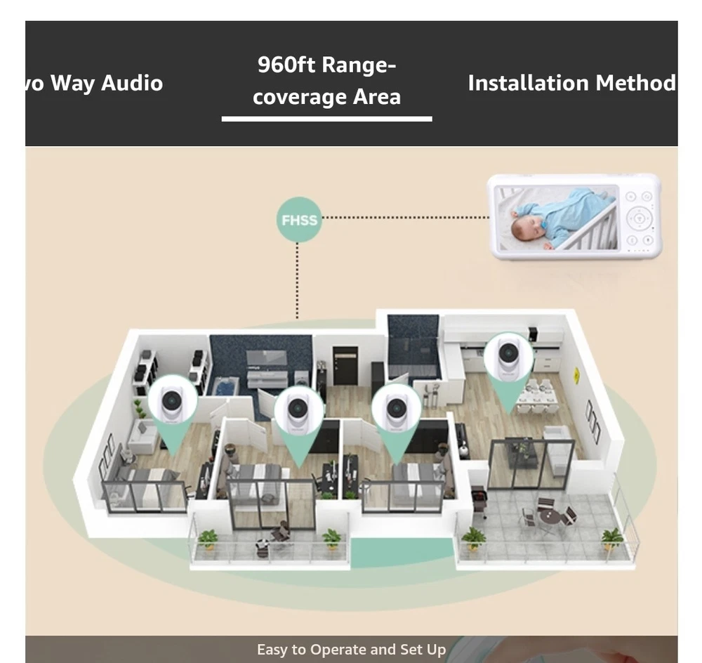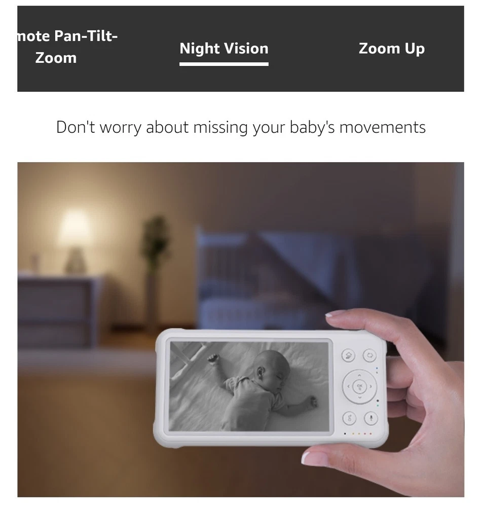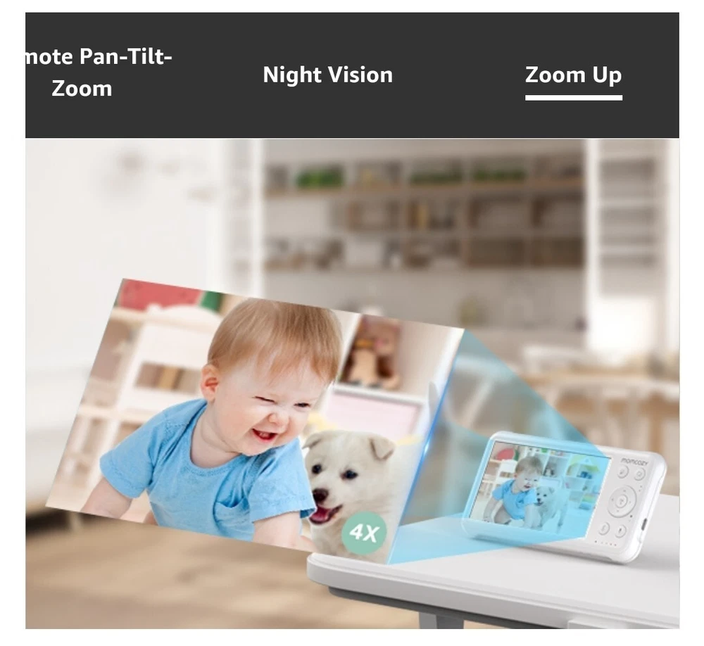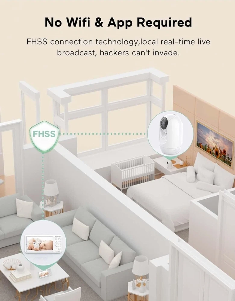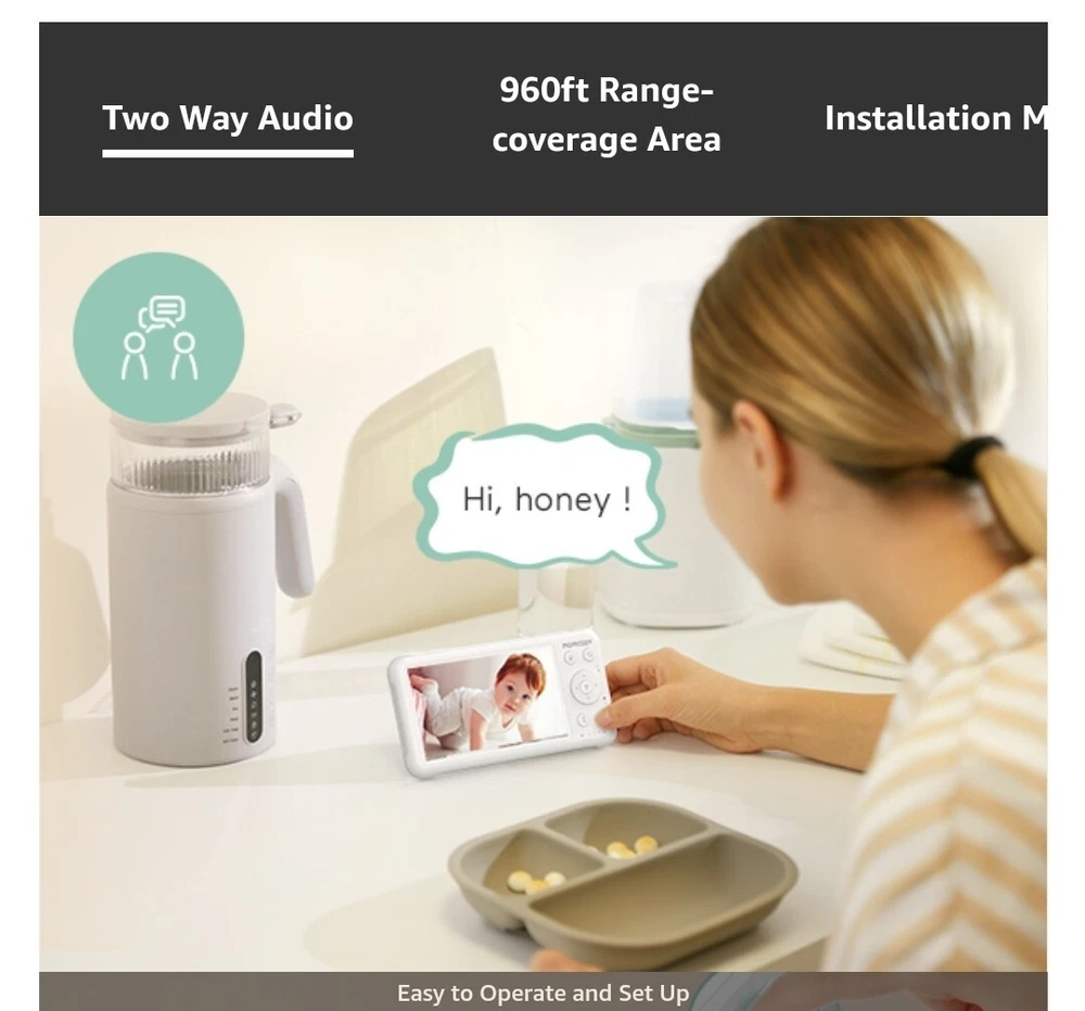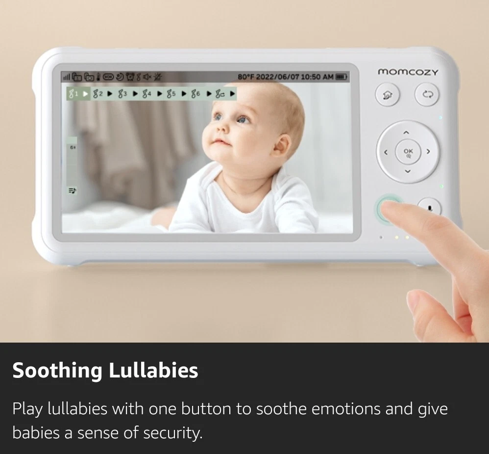 #887 Momcozy Video Baby Monitor, 1080P 5" HD Baby Monitor with Camera, Clear Video Image, Ideal Sound Quality, Sound Detection, Two-Way Talk, New Mom's Choice Top highlights Recommended Uses For Product: Indoor Security Brand: Momcozy Connectivity Technology: FHSS Special Feature: Easy to Install Compatible Devices: 4 Power Source: Battery Powered 【Experience Peaceful Nighttime Monitoring】- Rest assured knowing that the infrared night vision feature provides clear visibility even in complete darkness. The 5000mAh rechargeable battery ensures that the baby monitor with camera and audio can last throughout the night, with a battery life of up to 11.5 hours, allowing you to stay informed about your baby without any concerns. 【Feel Assured, not Uncertain】- The 1080p HD camera and 5'' large display will continuously monitor your baby, making you feel as if you are right there with them. Whether you are working, doing chores, exercising, or simply relaxing, a quick glance at the screen will bring a sense of peace and reassurance. 【Be Responsive to Your Baby's Needs】- Instantly hear your baby if they become fussy or cry, with the screen lighting up automatically when VOX is activated. This enables you to attend to your baby promptly whenever they require your attention. Whether soothing them with a lullaby or communicating through the screen, it provides a secure and comforting sense of connection. 【Secure Local Video Transmission】- By using a 2.4GHz FHSS connection, there is no need for wifi or an app, ensuring that hackers cannot remotely access your camera. Our baby monitors operate on a closed loop system, providing you with a secure and private connection where only you can view and listen. 【Simple Setup and Easy Operation】- Just plug in the camera and turn on the monitor for an instant connection with no pairing required. The monitor is ready to use, eliminating the need to read through extensive instructions.