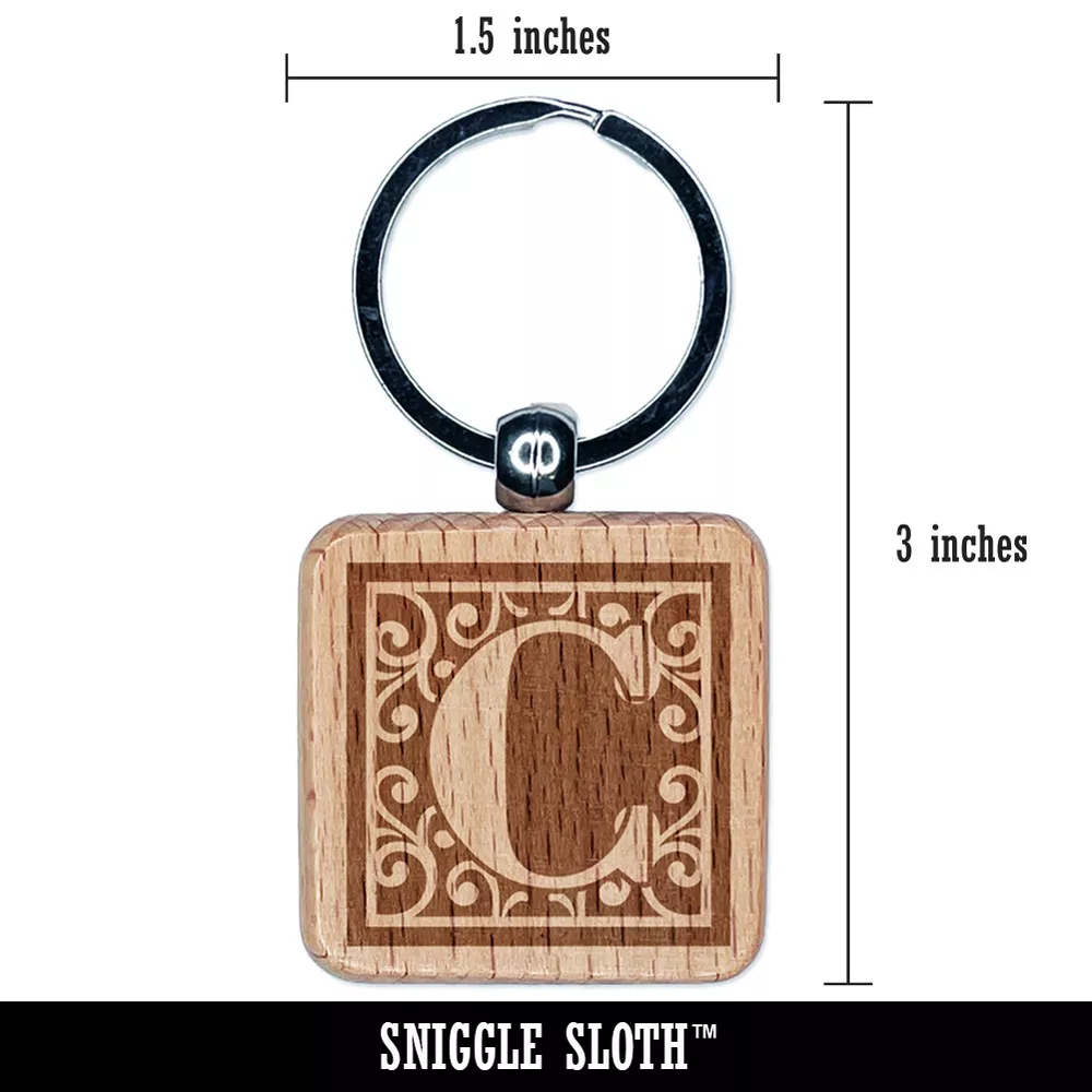 Monogram Swirls Capital Letter C Engraved Wood Square Keychain Tag Charm