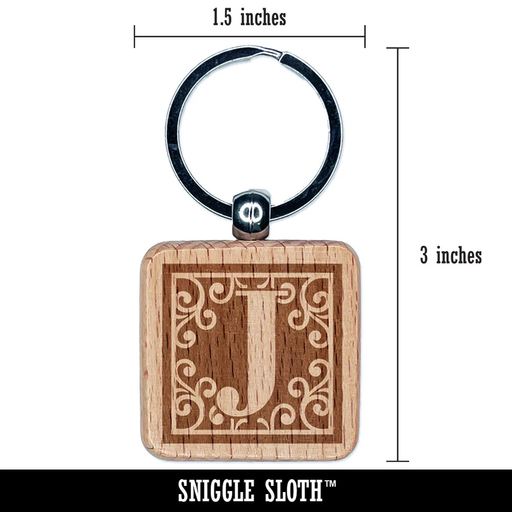 Monogram Swirls Capital Letter J Engraved Wood Square Keychain Tag Charm