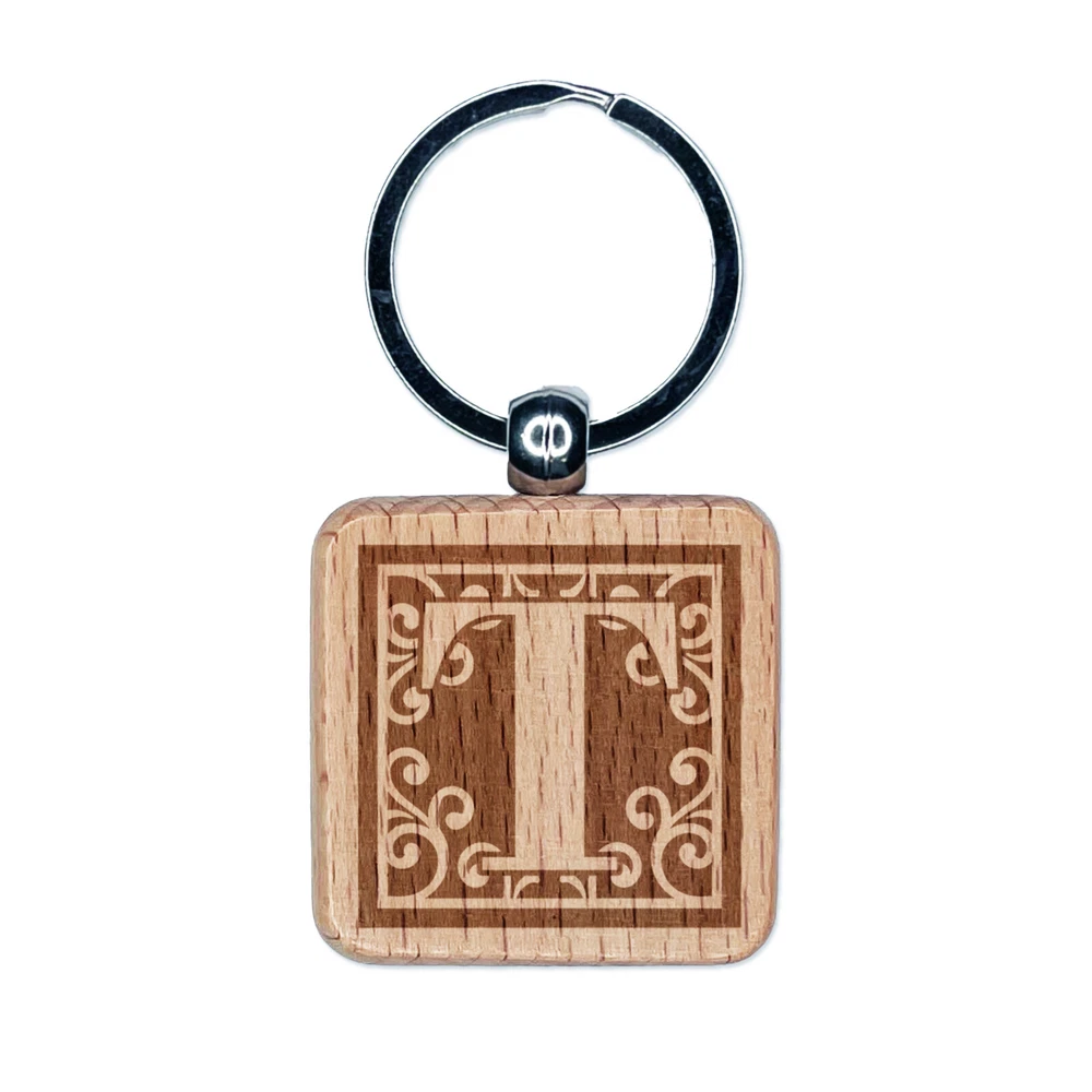 Monogram Swirls Capital Letter T Engraved Wood Square Keychain Tag Charm