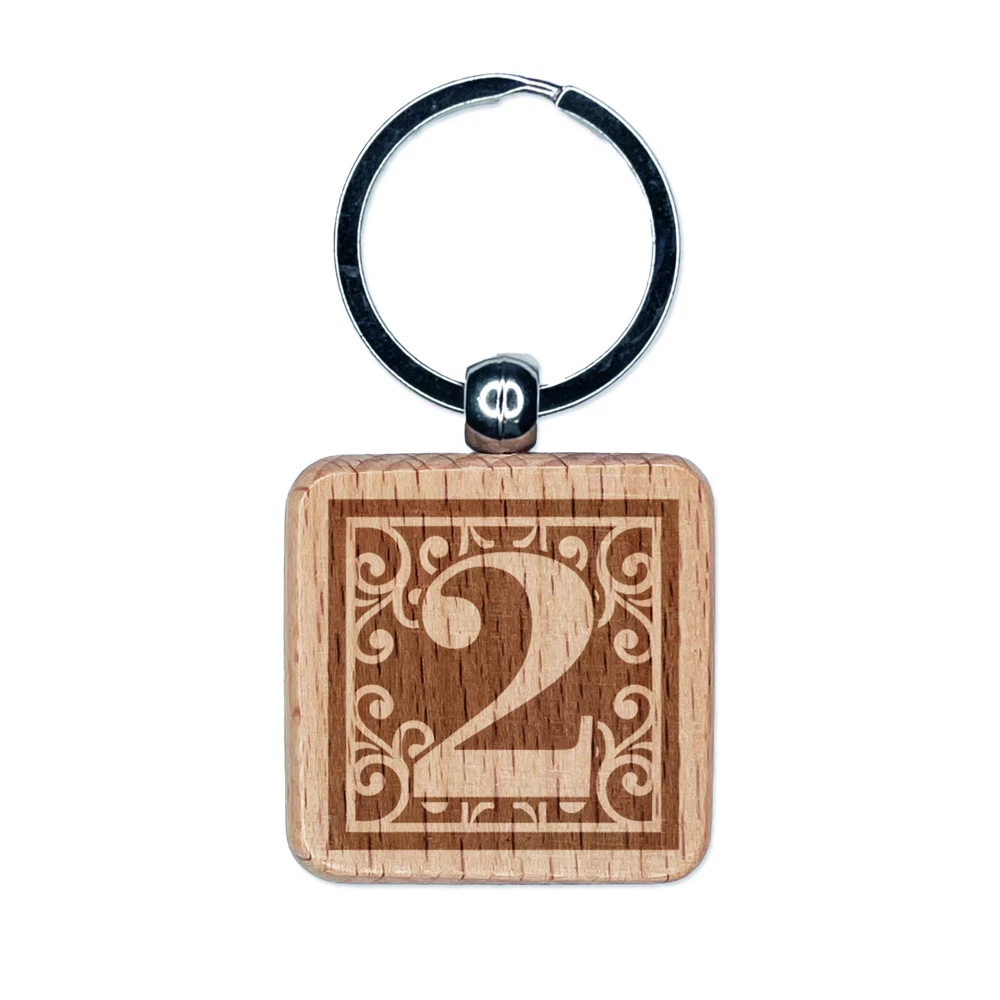 Monogram Swirls Number 2 Two Engraved Wood Square Keychain Tag Charm