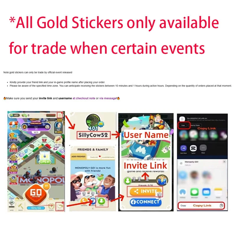 The Next Gold Raid December 24st,2024 Stickers will be sent out after the event starts ( December 24st ) Description: After purchasing, please send us your link and username from the Monopoly GO game directly or in the buyer's notes. Important: If you need stickers immediately after the event begins, please message us before completing your order so I can ensure timely shipping. Please note the specified time zone. During business hours, you can expect to receive stickers between 5 minutes and 1 hour after the event begins. This depends on the number of orders at the time, if there are a lot of orders we will reply to the email to send out the goods in the order in which they were placed! For out-of-hours or high volume orders, stickers will be sent out as soon as we have time or within a maximum of 8 hours. The latest party will be sent before the end of the event, if it is not sent, please do not open a dispute first, first email us, we will give you a full refund, or replace the other card you need. On Dec 17, 2024 at 00:05:37 PST, seller added the following information: On Dec 17, 2024 at 19:47:27 PST, seller added the following information: