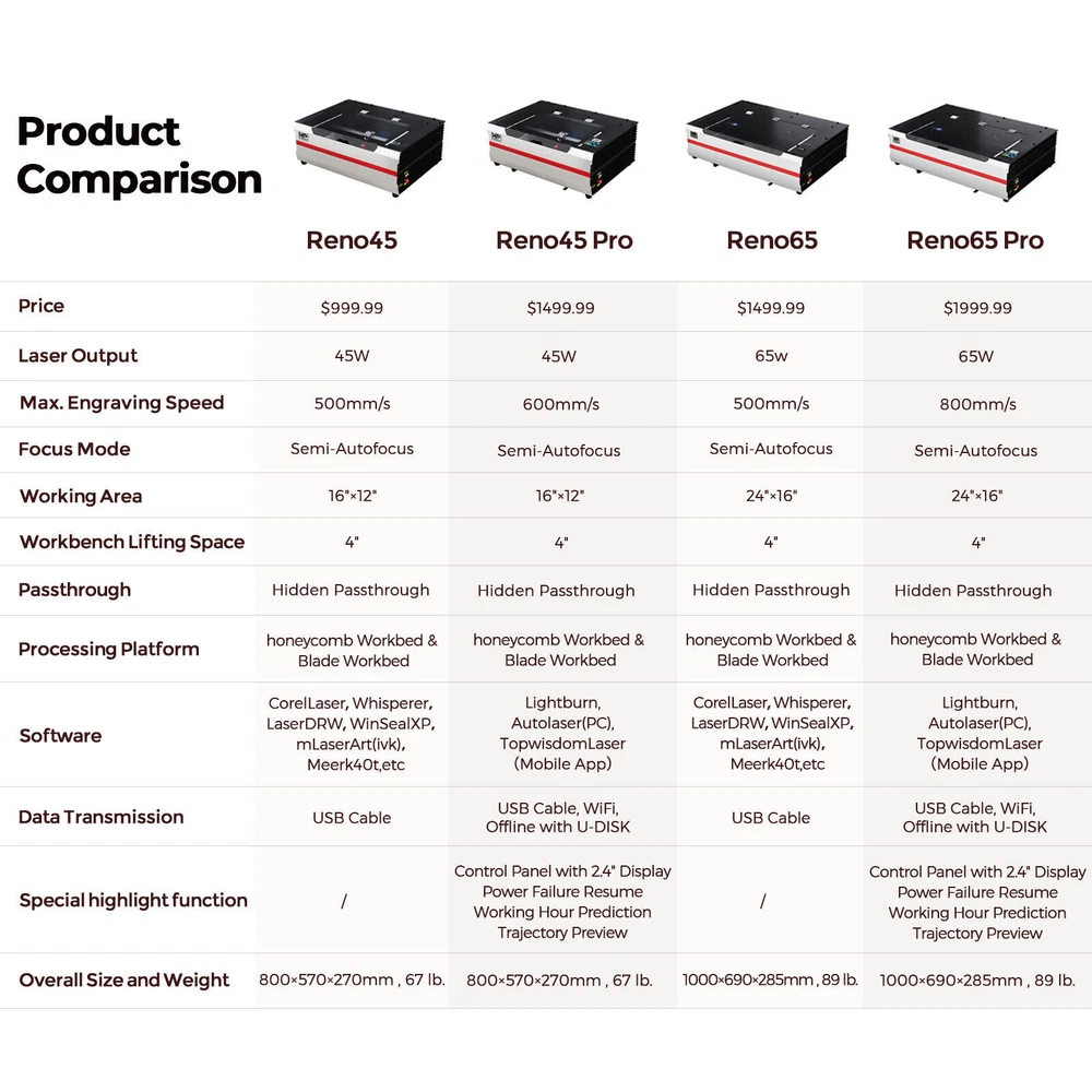 Monport Reno65 65W Desktop CO2 Laser Engraver Cutter (24" X 16") Semi-Autofocus New Official Monport Reno65 65W Desktop CO2 Laser Engraver & Cutter (24" X 16") with Brand New Semi-Autofocus Dimension & Specifications Working Dimension: 600 x 400mm Machine Dimension: 1000 x 690 x 285mm Product Weight:64kg Z-Axis Movement: 4''(100mm) Max. Engraving Speed: 500mm/s(19.7ips) Focus: Semi-Autofocus Compatible Software: CorelLaser, Whisperer, LaserDRW, WinSealXP, mLaserArt(ivk), Meerk40t Compatible Material: Rubber, acrylic, coated metal, tin, special steel, anodized aluminum, cork, cardboard, glass, leather, marble, plastics, wood and more Reno65 CO2 Laser Features 【REVOLUTIONARY BRAND-NEW LASER CUTTER & ENGRAVER】 It took 18 months for Monport to develop the Reno series products, which are suitable for most enthusiasts and professionals.Referring to the shortcomings of desktop product in the market, Monport continuously innovates and improves products , ultimately achieving high performance and easy to use while ensuring a reasonable price. 【TRULY POWERFUL】 Compared to the Reno45, the Reno65 has a more powerful 65W laser power while still maintaining a compact body size(600 * 400mm working area, 2 times Reno45, 4 times K40).Of course, with the support of high-quality reflective and focusing lenses, Reno65's cutting ability is further enhanced, and it can easily cut through 20mm acrylic at once. 【TRULY EFFICIENT】 Why can the Reno65 achieve a processing speed of 500mm/s, comparable to top products in the industry? Because Monport has independently designed a brand new mechanism, including lightweight design, high-precision slides and customized motors. This is what makes the Reno65 so efficient and stable. 【OUTSTANDING SPATIAL PERFORMANCE】 Considering the processing limitations of desktop products on the market, Monport has achieved a working area of 600 * 400mm (2 times Reno45, 4 times K40) while maintaining a small body size. At the same time,the Z-axis has a maximum adjustment range of 100mm (none of the existing desktop products on the market have this feature), and additional dual working platforms are provided: blade flat platform and honeycomb; Finally, there is a hidden front passthrough design. All of this is to give Reno stronger processing space. 【INDUSTRY EXCLUSIVE SEMI-AUTOFOCUS】 The engineers at Monport have designed an extremely clever focusing method that is efficient, convenient, and maintains high cost-effectiveness.Even if you are a beginner, you can complete focusing in just a few seconds.Magnetic feedback makes you love it once you use it. 【ADJUSTABLE AIR ASSIST】 Usually, carving or cutting different materials requires different air blowing amounts to ensure optimal results, but the air assist amount of all desktop products on the market cannot be adjusted, resulting in yellowing of the carving or inability to cut through the thick material. Therefore, Monport has upgraded its air assist system to achieve adjustable airflow, allowing carving or cutting to achieve the most ideal results. 【MULTIPLE OPERATING SOFTWARE OPTIONS AVAILABLE】 Considering most users who have been using K40 for a long time, Reno65 also chose the easy-to-use Lihuiyu M3 motherboard; It is compatible with many free carving software on the market, including K40 Whisperer, LaserDRW, WinSealXP, Meerk40t, CorelLaser, and more. There is always one that suits you. Finally, Monport has always believed that technology shouldn't be superior, but serves the public. Monport will publicly disclose all Reno series patents for free to peers, accelerating the progress of the laser industry and eliminating all unreasonable product premiums. Package Contents 1x 65W CO2 Laser Engraver 1x Water Pump 1x Exhaust Pipe(2 meters) 2x Pipe Clamp 1x USB Cable(2 meters) 1x Power Cord(1.5 meters) 1x USB Flash Drive 1x Focus Strip 1x Hexagonal T-shaped Wrench 1x User Manual 1x Protective Glasses 1x Roll of Dimming Paper 1x Wrench Set 1x Dongle Warranty & Certifications 2-Year Warranty (6 Months for Parts) CE, FDA, IEC60825-1(SGS) Product Unique Features TRULY POWERFUL Compared to the Reno45, the Reno65 has a more powerful 65W laser power while still maintaining a compact body size(600 * 400mm working area, 2 times Reno45, 4 times K40).Of course, with the support of high-quality reflective and focusing lenses, Reno65's cutting ability is further enhanced, and it can easily cut through 20mm acrylic at once. Outstanding Spatial Performance Considering the processing limitations of desktop products on the market, Monport has achieved a working area of 600 * 400mm (2 times Reno45, 4 times K40) while maintaining a small body size. At the same time, the Z-axis has a maximum adjustment range of 100mm (none of the existing desktop products on the market have this feature), and additional dual working platforms are provided: blade flat platform and honeycomb; Finally, there is a hidden front passthrough design. All of this is to give Reno stronger processing space. Truly Efficient(processing speed of 500mm/s) Why can the Reno65 achieve a processing speed of 500mm/s, comparable to top products in the industry? Because Monport has independently designed a brand new mechanism, including lightweight design, high-precision slides and customized motors. This is what makes the Reno65 so efficient and stable. Industry Exclusive Semi-autofocus The engineers at Monport have designed an extremely clever focusing method that is efficient, convenient, and maintains high cost-effectiveness.Even if you are a beginner, you can complete focusing in just a few seconds.Magnetic feedback makes you love it once you use it. Unique Z-direction Adjustable Platform Hidden Pass Through 130mm Maximum Rotary Engraving Shipping Policy Shipping will always be Fast & Free. Whereas any payment upon the item was made, your item will be very well packed and sent within 1 to 3 business days (It's usually 1, and we put 3 just in case) , and it should be