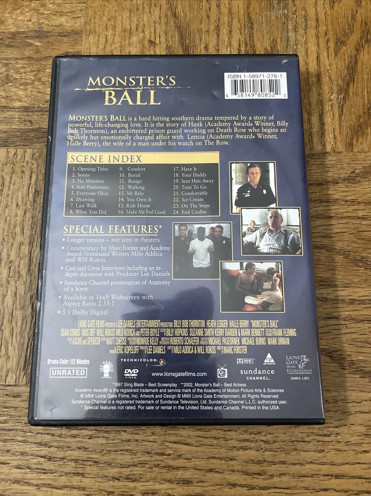 This is the perfect addition to your movie collection. The Monster's Ball DVD, directed by Marc Forster, features an extended non-theatrical version of the signature series. This R-rated drama is a must-watch for fans of the genre. With its exceptional picture and sound quality, this DVD format ensures an enjoyable viewing experience. This edition of Monster's Ball is perfect for movie enthusiasts, collectors, or anyone who appreciates a well-made film. So, don't miss out on this incredible opportunity to own this masterpiece. Box mw3301