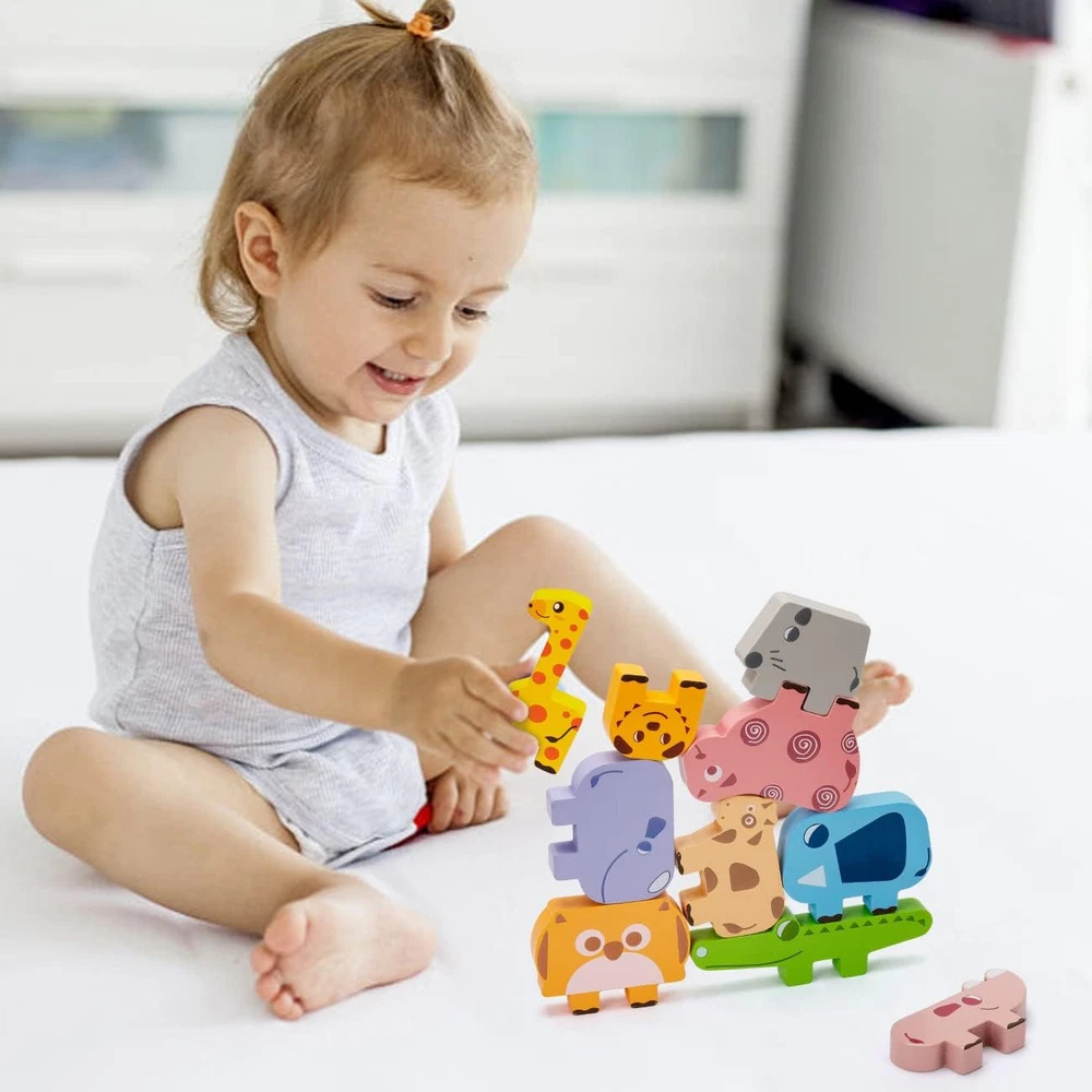 ANIMAL BLOCKS SET (10 Pieces) -- This stacking block set includes 10 chunky blocks, 10 double-sided challenge cards with three different levels of real challenge. WITTY AND CUTE -- This set of blocks presents a different kind of witty cuteness. There are 10 different shaped blocks with simple lines on the blocks to outline different animals: giraffe, sheep, puppy, cow, crocodile, hippo, elephant, mouse and rhino. START BRAIN GAMES -- Stack, pattern and multicolor shapes, but don’t be fooled by these endlessly enjoyable blocks mean fine motor skills and brain-boosting business. Whether it's a horizontal challenge or free stacking, it's all in the children's play! CHUNKY AND SAFE -- The chunky design makes it easier for young children to grasp. It is made of high quality wood and coated with an environmentally friendly water-based paint that is safe for your child. GIVE THE GIFT OF LEARNING -- Whether you’re shopping for holidays, birthdays, Uyogos , or just because. Bambilo toys is ideal gift for Halloween, Christmas, Easter or even for Homeschool. Product Description
