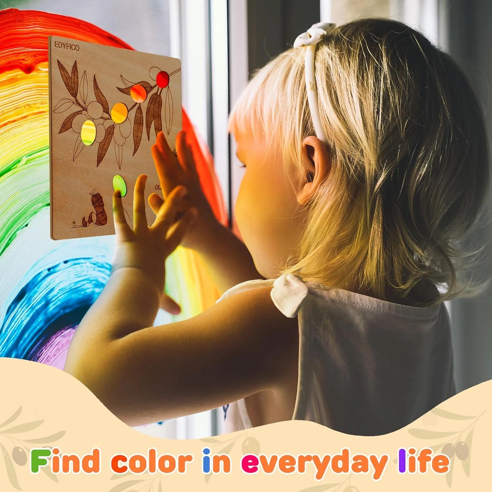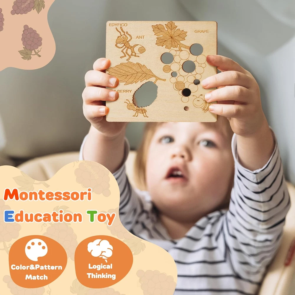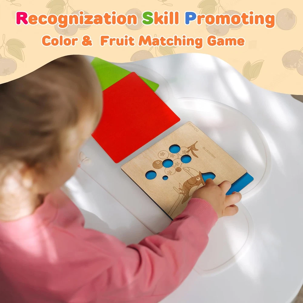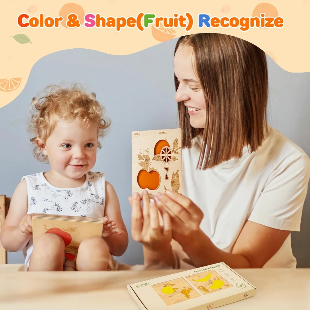 2-IN-1 EARLY CHILDHOOD MONTESSORI TOYS -These montessori toys for 2 year old include 12 smooth, polished wooden boards, each printed with 20 common fruit patterns and cute little animals, along with 3 colorful cardboard pieces. These colorful sensory toys will help children learn to recognize fruits and match colors during play! MULTIPLE DIY FUN -With the wooden shape color sorter, kids can engage in simple matching of fruit patterns and color cards. They can also utilize the unique hollow design of the wooden boards to explore the fun of light and shadow. Additionally, kids can use a paintbrush at home to trace the fruits and draw their favorites, or enjoy DIY painting to color the fruits with their favorite hues! TODDLER'S FRUIT PARADISE -The fruit-themed learning toys feature 20 common fruits found in daily life, such as apples, bananas, blueberries, oranges, strawberries, and mangoes. The open ended toys can fully capture children's attention, and parents can interact with their children to find colors in everyday life, promoting the relationship and communication between parents and children FUNNY OUTDOOR TOYS -Designed for playing and learning color recognition, shapes, classification, and analysis both indoors and outdoors, whether at home or on the go. This set of travel toys is suitable for children aged 1 to 3 years old. The set is small and lightweight, making it easy to carry and store, so children can enjoy it anywhere—perfect for home, school, parks, or travel BUY WITH CONFIDENCE -Made with non-toxic, high-quality materials, featuring rounded corners and a smooth, burr-free finish. Our STEM toys offer exceptional quality for your toddler's early education! Matching instructions and game ideas are always available via the QR code in the instruction booklet Product Description