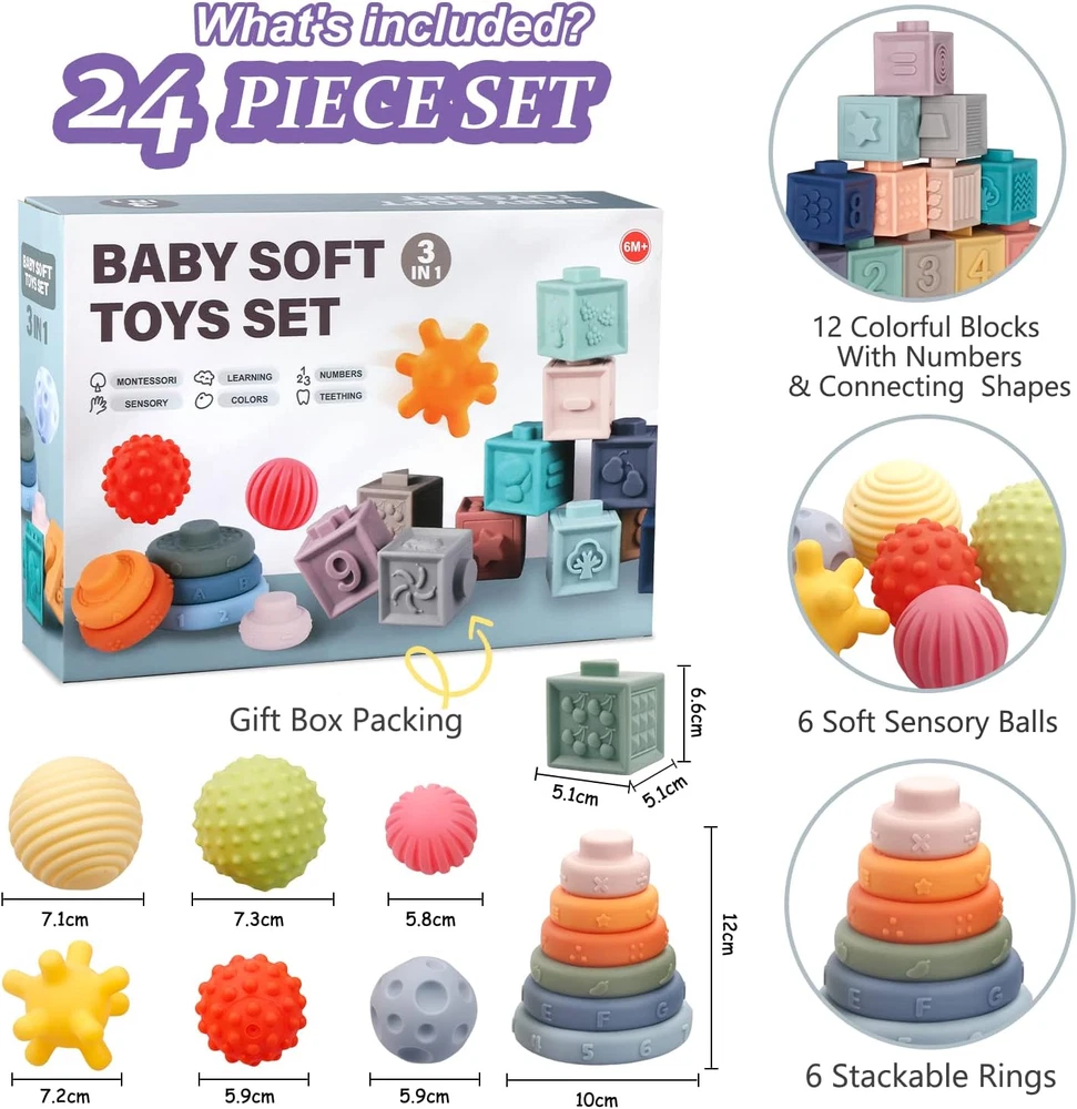 Store New Arrivals Add to Favorite View Feedback Contact Montessori Toys for Babies,Soft Stacking Building Blocks Rings Balls Sets,3 in 1 Baby Toys Bundle,Sensory Toys for 6-12 Months, Soft Teething Toys for Babies,Baby Toys Gifts for Boy Girl Description Item model number BT0076 Style 3 IN 1 Set-2 Product Dimensions 12.6 x 3.78 x 9.84 inches Item Weight 2 pounds Manufacturer recommended age 6 months and up Department Unisex Baby Manufacturer IFLOVE BABY SAFETY PRIORITY - Our Montessori toys for babie 6-12 months are made of high-quality food-grade materials, highly durable food-grade silicone, being 100% BPA-free, safe, non-toxic,and the excellent quality of the products is passed the certification,suitable for baby WHAT’S INCLUDED - Our 24 pieces of baby and infant toys includes 12 different colored blocks,6 soft stacking rings and 6 squishy and sensory toy balls,perfect 3 in 1 baby toys bring countless hours of fun EARLY LEARNING TOYS - Our baby toys come in different colors, animals, numbers ,fruits,and shapes, which are helpful for children's balance, fine motor skills, hand-eye coordination and problem-solving ability. They are good tools to help children learn SOFT TEETHING TOYS - Our baby toy is very soft,multiple textures with the comfortable feeling enhances the baby's sensory stimulation and help the development of baby’s matching skills,it will be a great gift for baby THE BEST CHOICE FOR YOUR BABY - Those learning toys can help your baby boy or baby girl naturally develop their problem-solving abilities and cognitive skills,this is a perfect choice for your baby Product Description ABOUT US We offer the best prices around on high quality products. Our E-store includes media such as books, movies, music and games while offering electronics, toys, sporting apparel, clothing, tools, general home, garden items and more. SHIPPING We are always working hard to ensure your package arrives as soon as possible. Please understand that some factors like weather, high postal traffic, and the performance of shipping companies are outside of our control. We offer free shipping to the lower 48 states and ship within 2 business days of payment, usually sooner. We do not accept P.O. Boxes. Please provide a physical address. RETURNS We offer a 30-Day Return Policy on items which you are not completely satisfied with. You have the option for a full-refund or an exchange of the item. No returns are available on items shipped outside of the USA. PAYMENT We accept PayPal. CONTACT US This page content is yet to come Please ad us to your favorite seller and visit again later Thank You CUSTOMER SATISFACTION We try our very best to make sure every customer is completely satisfied. If there's a problem, message us! We're happy to help.