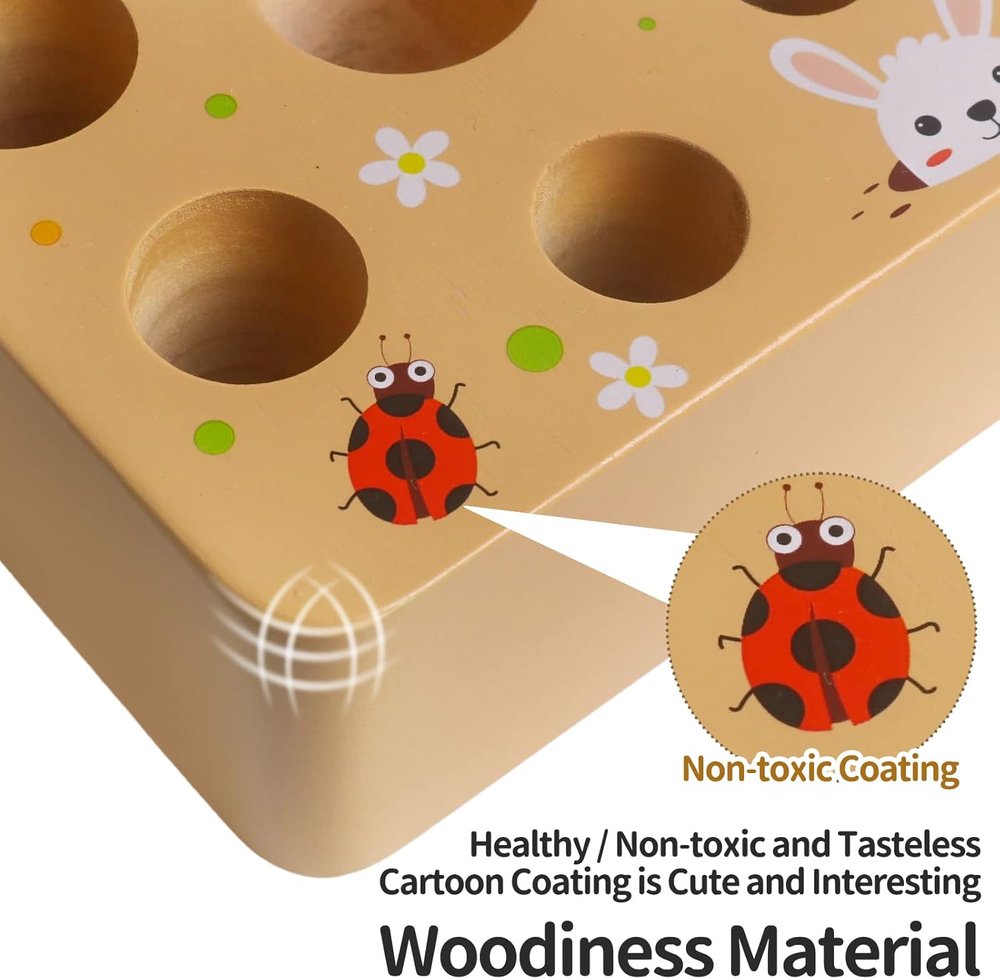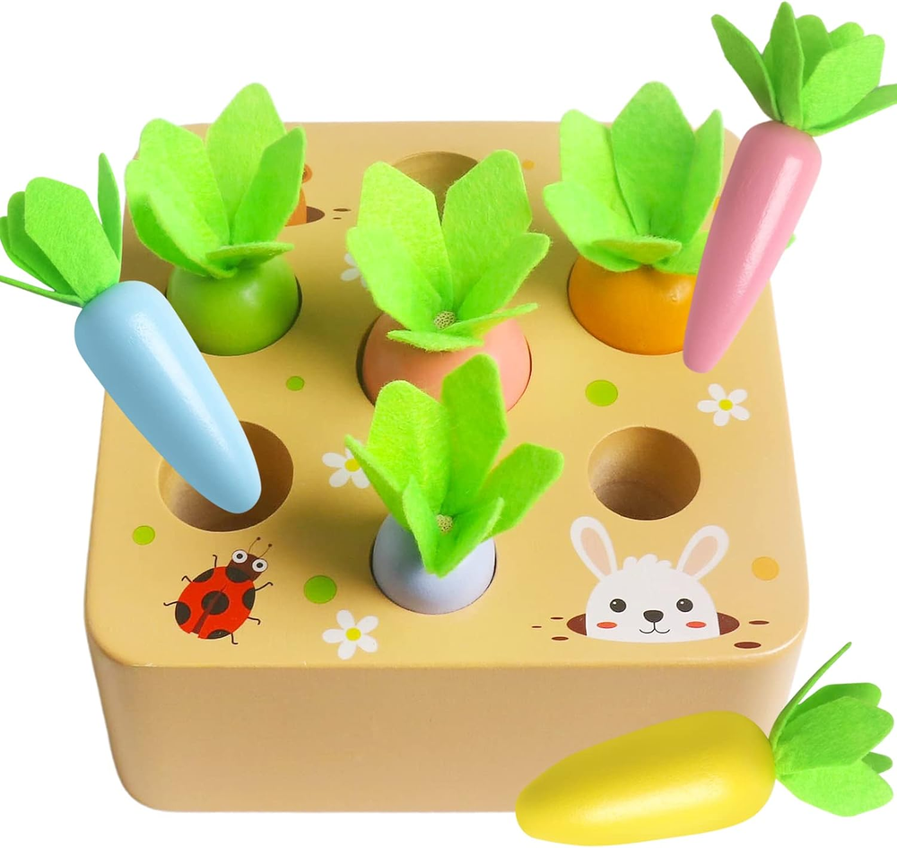 Safe Material of Sorting Carrots: The wooden carrot toys is made of wood, dyed with water-based paint. Colorful printed pattern with rounded corners and smooth edges and will not harm the baby's skin. It can ensure that your boys and girls play safety. Wooden Carrot Harvest Game: The Montessori Toys is a new kind of learning toy for toddlers. Develop your children's sorting skills through carrot sorting wooden toys. 7 different sizes of cute carrots of different sizes to match with holes for your child to explore, help your child exercise his intelligence and size exercise, and put it into the correct size slot. Help build strong fine motor skills and hand-eye collaboration. Educational Montessori Learning Toy: Carrots are very cute and easily arouse toddlers' interest. By playing with carrot sorting toys, you can develop good motor skills, hand-eye coordination, shape recognition, size and concentration. Very suitable for proficient in motor skills, sizing and finishing. It is a great toy for preschool learning and training personal skills. Cute and Realistic Design: Take the wooden carrots out of the holes, try to reinsert them into the correct slots, or plant them, harvest, etc. Lovely farm landscape with cute rabbits and bugs on it to make them look more real. Use these carrots in the imaginative game of the garden/farmer market, or in the pretend kitchen. Toddler Festival Gift: The carrot harvest game is a great fun and educational montessori toy, the cute design will always catch babies' eyes, suitable for your baby boy and girl. The perfect ultimate gift idea as a Christmas/birthday/holiday toy for baby boys and girls 1 2 3 years old. Product Description Carrot Harvest Wooden Matching Puzzle, Shape & Size Sorting Game for Developing Fine Motor Skill, Montessori Preschool STEM Educational Toys for Kids Toddlers Boys Girls ADVANCED FEATURES Improve your intelligence Improve the hand-eye combination Improve your thinking IQ level Improve color perception It‘s a good item to get the children off the video games. FUN SORTING GAME The Montessori Toys is a new kind of learning toy for toddlers. The wooden toys have 7 different size carrot and 1 base which has 7 different holes to match carrots. Size: 5.1*5.1*3.1 inches, Weight: 15.87 oz. EDUCATIONAL MONTESSORI LEARNING TOY Carrot harvest matching toy helps developing memory skills, hand-eye coordination , size, shape recognition and concentration. Perfect for preschoolers, kindergarten, toddlers and older kids. Let kids trying how to match the carrots to the correct sized holes. helping build strong fine and gross motor skills. HIGH QUALITY&SAFETY MATERIAL Montessori wooden toys with vironmental and high quality wood, Non-toxic water-based paint. The edges of the Montessori wooden toys for toddlers are smooth and won't hurt the baby's skin. Suitable blocks size, large enough to avoid accident swallow. CARROT HARVEST MATCHING Chunky carrots make it easy for baby to grasp, simply put the carrot into the hole. each an features a different, pair with size and shape, let your kids love the challenge of finding where the carrot fit. GREAT GIFT CHOICE Chunky carrots make it easy for baby to grasp, simply put the carrot into the hole. each an features a different, pair with size and shape, let your kids love the challenge of finding where the carrot fit.