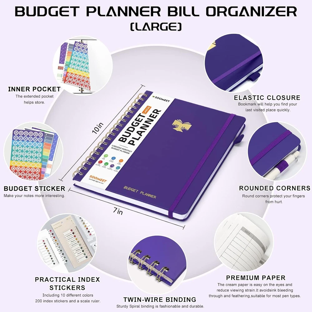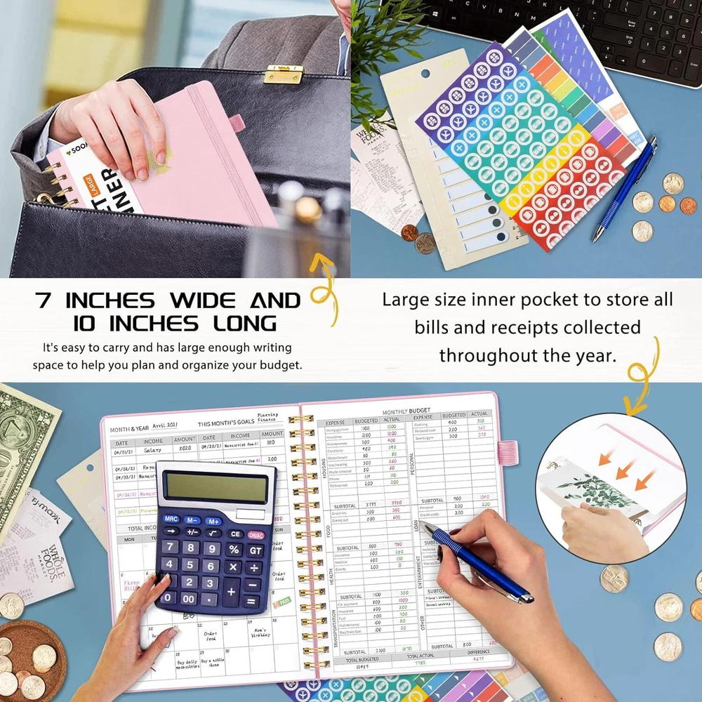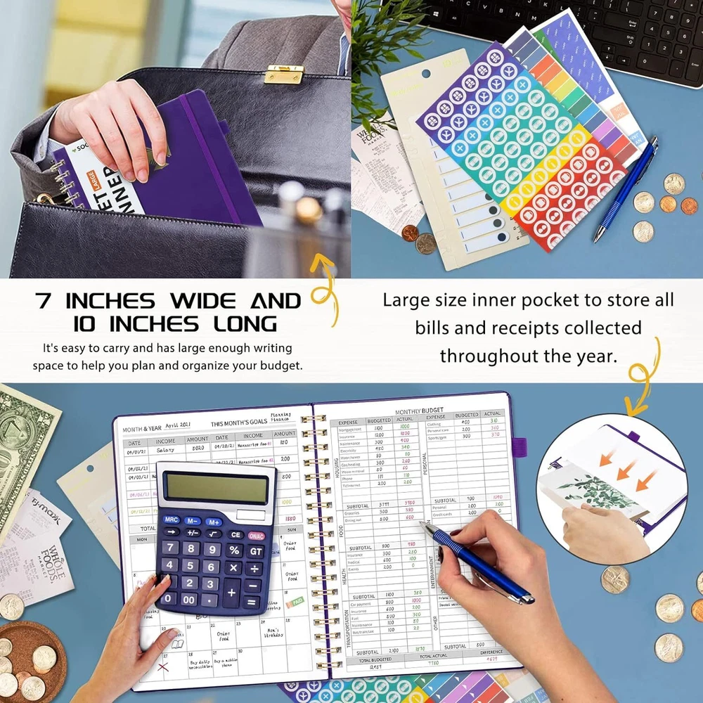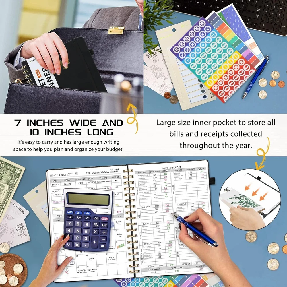 About this item MANAGE YOUR MONEY EFFECTIVELY TO ACHIEVE YOUR FINANCIAL GOALS: This budget plan contains personal finances, savings, budgets, debts, payments, bills due, cash flow, and expense tracking. help you organize your money, by using this budget planner, you can become a personal finance and budgeting expert. SET GOALS AND STAY ON TRACK: The 12-month budget planner helps you set monthly goals, create a budget, review and develop monthly habits, monetary strategies, and action plans. plan your monthly budget with predefined expense categories, review your monthly budget at the end of the month, reflect on your achievements, and think about how to improve next month. ELEGANT AND FUNCTIONAL PERSONAL FINANCE: The financial ledger starts with 1 page of financial goals, 1 page of categorized financial strategies, 4 pages of expense tracker, 1 page of monthly reflection, 1 page of notes, through the 12 month plan, additional multiple layouts combined with annual summary to track progress throughout the year. PREMIUM QUALITY: Budget Planner is 7 x 10 inches, suitable for carrying, vegan leather hardcover with an elastic band, a pen holder, a pocket for bills and receipts at the back of the money planner, and thick 100gsm no-bleed paper. this budget plan and account book comes with 1 set of index stickers and 1 set of currency navigation stickers to help you use them better. Take control of your finances Do you try so hard to stick to your budget, often only to find that you’ve overspent again? You just need the right guidance to keep you on track. Use Budget Planner & Bill Organizer is designed to cover all of your financial bases so that you can set goals, spend well, and start saving. Keep important documents safe Set monthly goals, create budgets, review and develop monthly habits, monetary strategies, and action plans. 12 monthly bill pockets keep all your documents organized and always with you. Master money management and budget with ease Prepare for your financial future Start putting your finances in order today, a 12-month, undated financial plan. The 7" x 10" layout is full of planning prompts, leaving plenty of room for detailed planning. Exquisite Inner Pocket Hard Cover and Premium Paper Currency Budget Stickers 200 Index Stickers and A Scale Ruler Elastic Closure Rounded Corners Detail Protection Set financial goals Choose the financial goals you want to achieve in each segment over the next 12 months and outline the strategies and tactics that will help you achieve it. review your progress at the end of each month and find new ways to keep it going. Practical financial management It all started with a plan! Write down your monthly financial goals each month. Record reminders for bills and payments on your calendar. Before you spend, make a monthly spending plan. Plan your monthly budget with predefined expense categories. During the month, track your daily expenses. At the end of the month, review what happened, spot bad spending habits, and think about how to improve next month. Funny auxiliary stickers Fun stickers add spice to your financial projects, and whether you buy one for yourself or as a gift, it will feel like a treat.