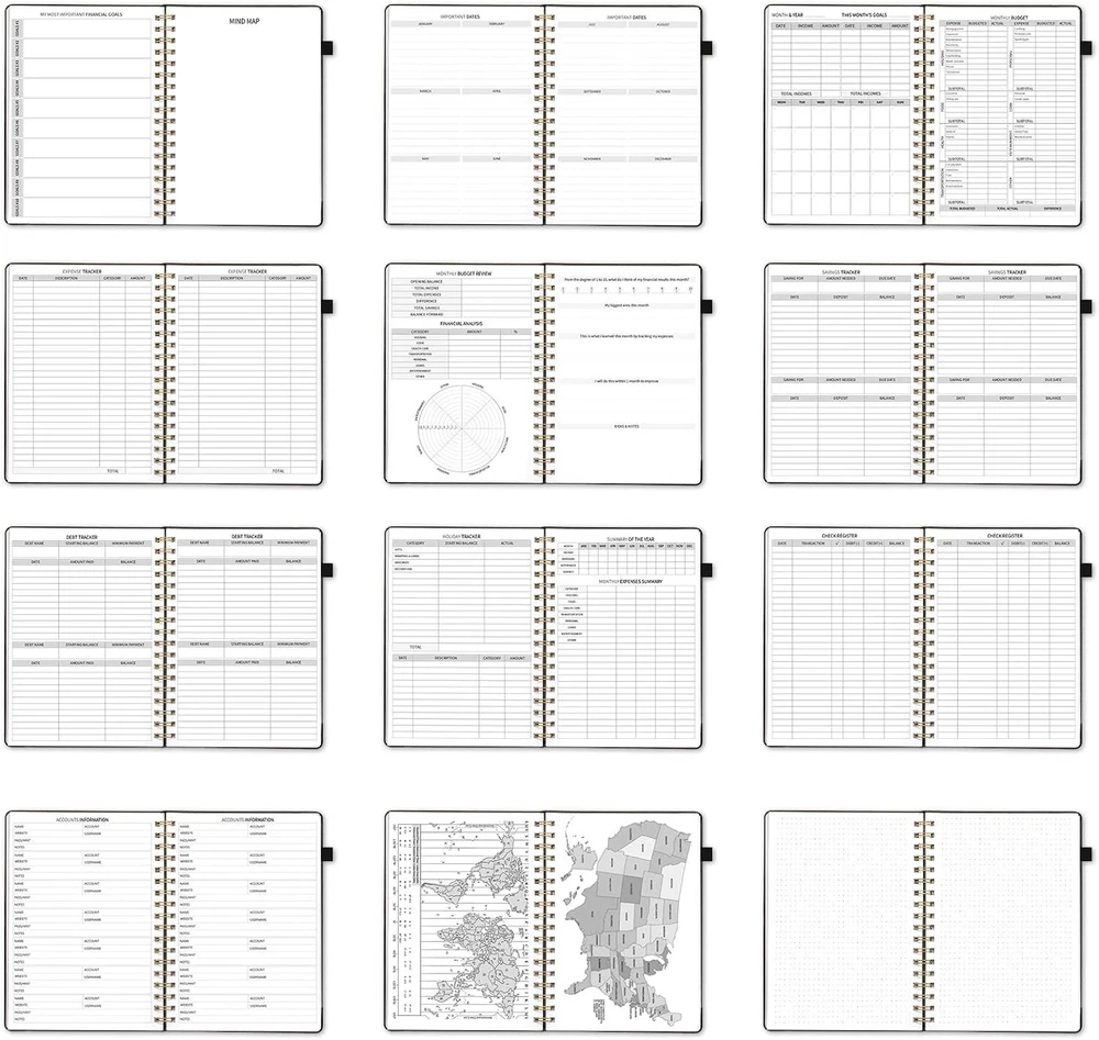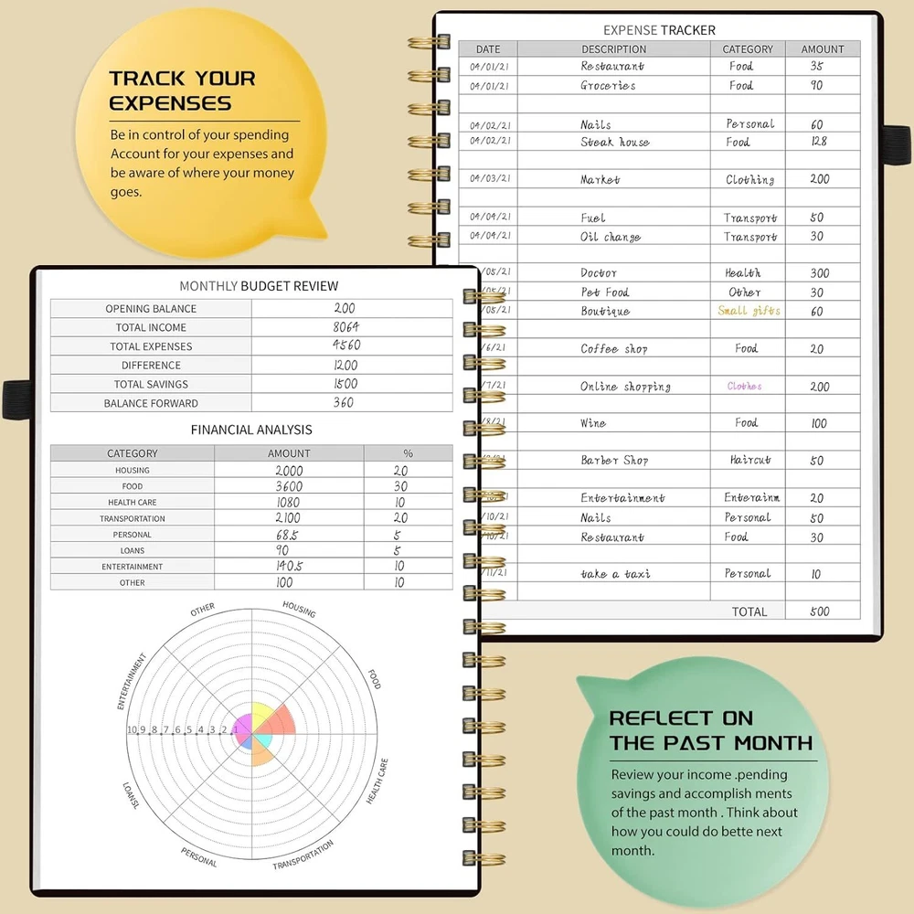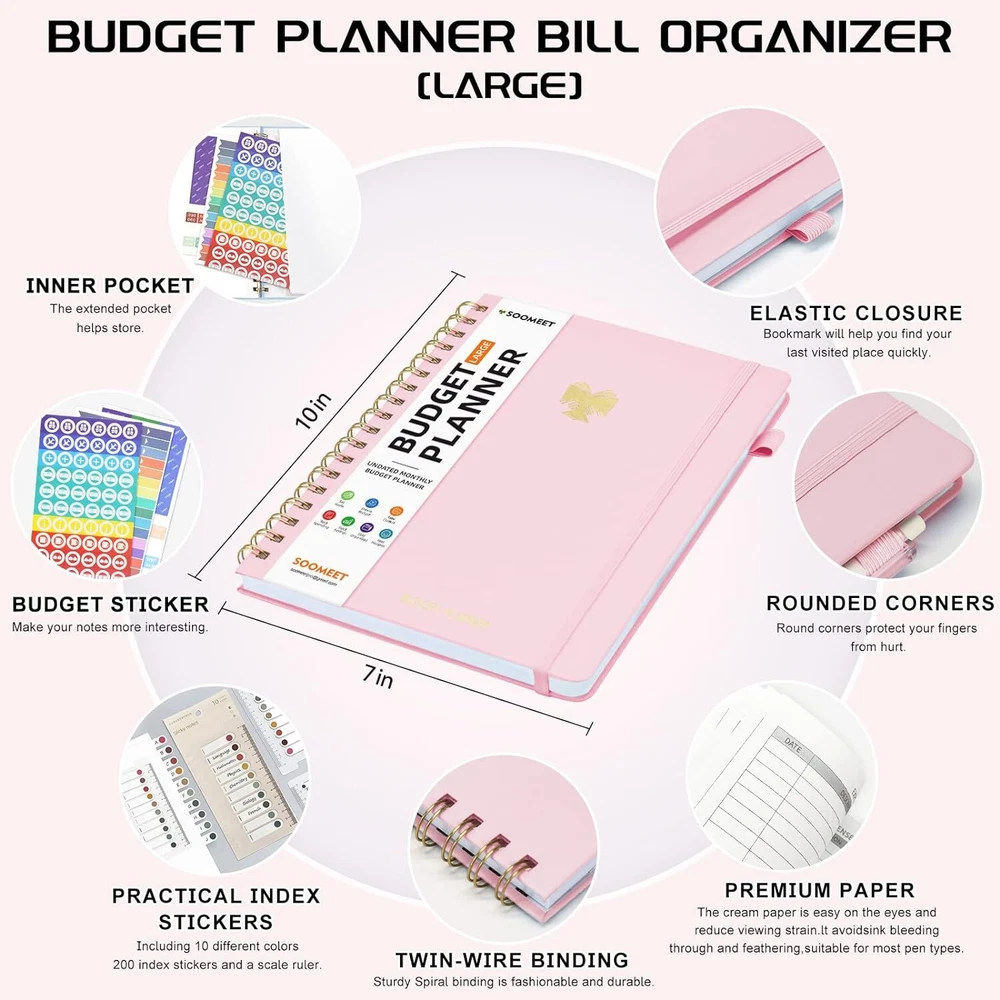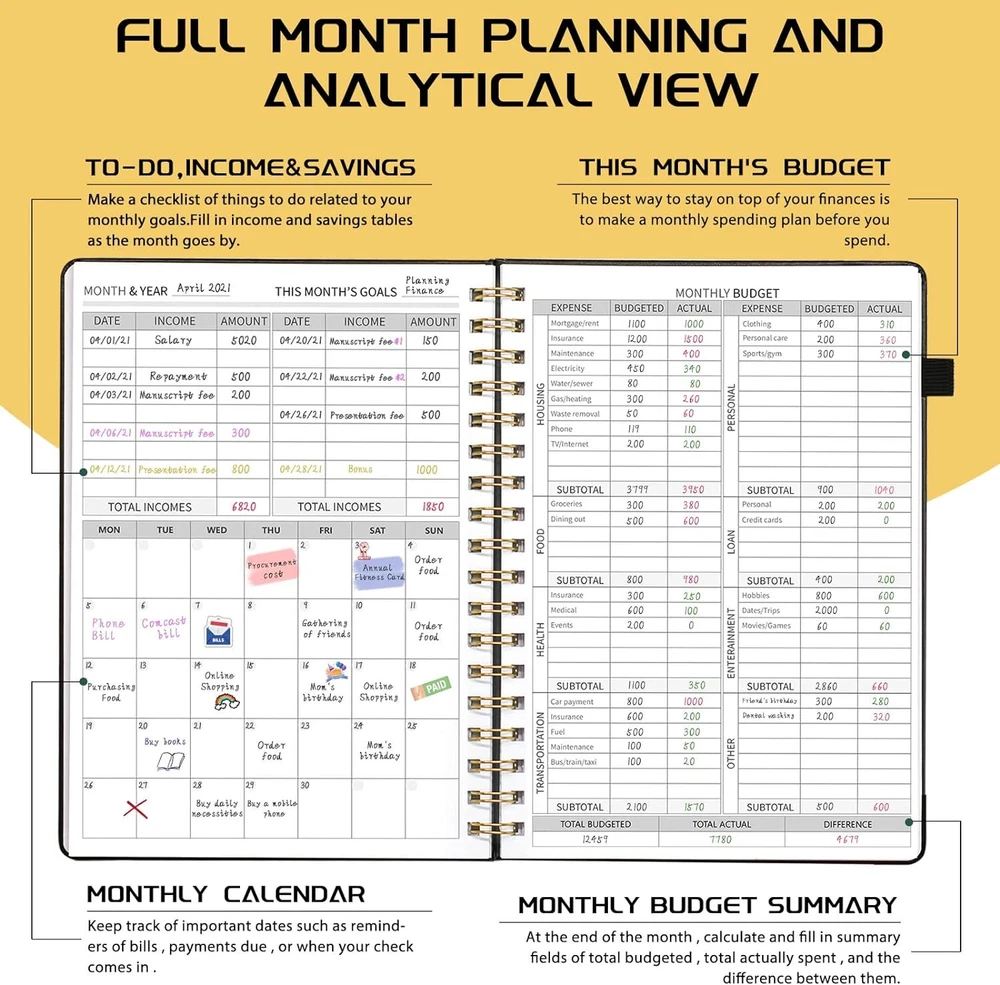About this item MANAGE YOUR MONEY EFFECTIVELY TO ACHIEVE YOUR FINANCIAL GOALS: This budget plan contains personal finances, savings, budgets, debts, payments, bills due, cash flow, and expense tracking. help you organize your money, by using this budget planner, you can become a personal finance and budgeting expert. SET GOALS AND STAY ON TRACK: The 12-month budget planner helps you set monthly goals, create a budget, review and develop monthly habits, monetary strategies, and action plans. plan your monthly budget with predefined expense categories, review your monthly budget at the end of the month, reflect on your achievements, and think about how to improve next month. ELEGANT AND FUNCTIONAL PERSONAL FINANCE: The financial ledger starts with 1 page of financial goals, 1 page of categorized financial strategies, 4 pages of expense tracker, 1 page of monthly reflection, 1 page of notes, through the 12 month plan, additional multiple layouts combined with annual summary to track progress throughout the year. PREMIUM QUALITY: Budget Planner is 7 x 10 inches, suitable for carrying, vegan leather hardcover with an elastic band, a pen holder, a pocket for bills and receipts at the back of the money planner, and thick 100gsm no-bleed paper. this budget plan and account book comes with 1 set of index stickers and 1 set of currency navigation stickers to help you use them better. Take control of your finances Do you try so hard to stick to your budget, often only to find that you’ve overspent again? You just need the right guidance to keep you on track. Use Budget Planner & Bill Organizer is designed to cover all of your financial bases so that you can set goals, spend well, and start saving. Keep important documents safe Set monthly goals, create budgets, review and develop monthly habits, monetary strategies, and action plans. 12 monthly bill pockets keep all your documents organized and always with you. Master money management and budget with ease Prepare for your financial future Start putting your finances in order today, a 12-month, undated financial plan. The 7" x 10" layout is full of planning prompts, leaving plenty of room for detailed planning. Exquisite Inner Pocket Hard Cover and Premium Paper Currency Budget Stickers 200 Index Stickers and A Scale Ruler Elastic Closure Rounded Corners Detail Protection Set financial goals Choose the financial goals you want to achieve in each segment over the next 12 months and outline the strategies and tactics that will help you achieve it. review your progress at the end of each month and find new ways to keep it going. Practical financial management It all started with a plan! Write down your monthly financial goals each month. Record reminders for bills and payments on your calendar. Before you spend, make a monthly spending plan. Plan your monthly budget with predefined expense categories. During the month, track your daily expenses. At the end of the month, review what happened, spot bad spending habits, and think about how to improve next month. Funny auxiliary stickers Fun stickers add spice to your financial projects, and whether you buy one for yourself or as a gift, it will feel like a treat.
