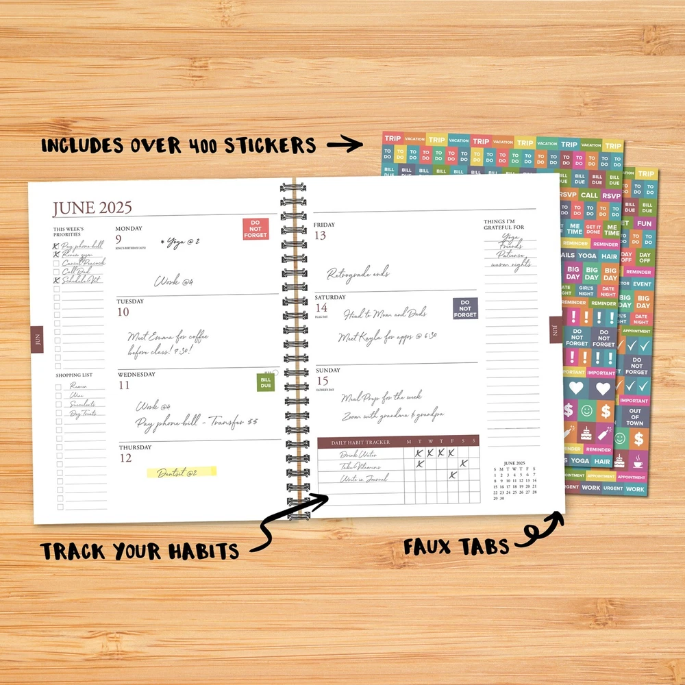This large-format 8.5”x 11” softcover weekly planner provides functional features that are ideal for laying out the year ahead. In addition to monthly snapshots with a sidebar to write down monthly priorities, there are two-page weekly spreads that provides ample space for detailed planning. Create weekly shopping lists, week's priorities, daily habit tracker and what your grateful for each calendar week. This planner includes a spiral binding, monthly faux tabs which make accessing information a breeze, and over 300 stickers to dress up special days like birthdays and other upcoming events on your social calendar. Never forget a password or important contact information, there is a special section in the back to help you keep organized. Protected by a durable, plastic-free cover, this planner also includes a handy storage pocket offering a secure space for papers, receipts, and other important items. Bonus pages include current year-at-a-glance view, along with a yearly overview for the upcoming / next year (2025 and 2026). Willow Creek Press is commitment to eco-friendly efforts to make our products more sustainable, our planners are printed with soy-based inks on high-quality paper. Date Range: January through December PLAN IN STYLE – This large-format 8.5” x 11” Weekly Planner combines fashion with fun, functional features, ideal for laying out the year ahead. The durable, plastic-free cover features a handy storage pocket for securing papers, receipts, and items of importance. PICTURE-PERFECT QUALITY – Printed with soy-based inks on high-quality FSC-certified paper, our Weekly Planners have a spiral binding, faux monthly tabs that make accessing information a breeze, and over 300 stickers to dress up special days and events on your social calendar. EFFORTLESS SCHEDULING – Monthly snapshots and two-page weekly spreads provide ample space for detailed planning. Our Weekly Planners also have sections for weekly shopping lists, personal goals, and handy habit trackers.