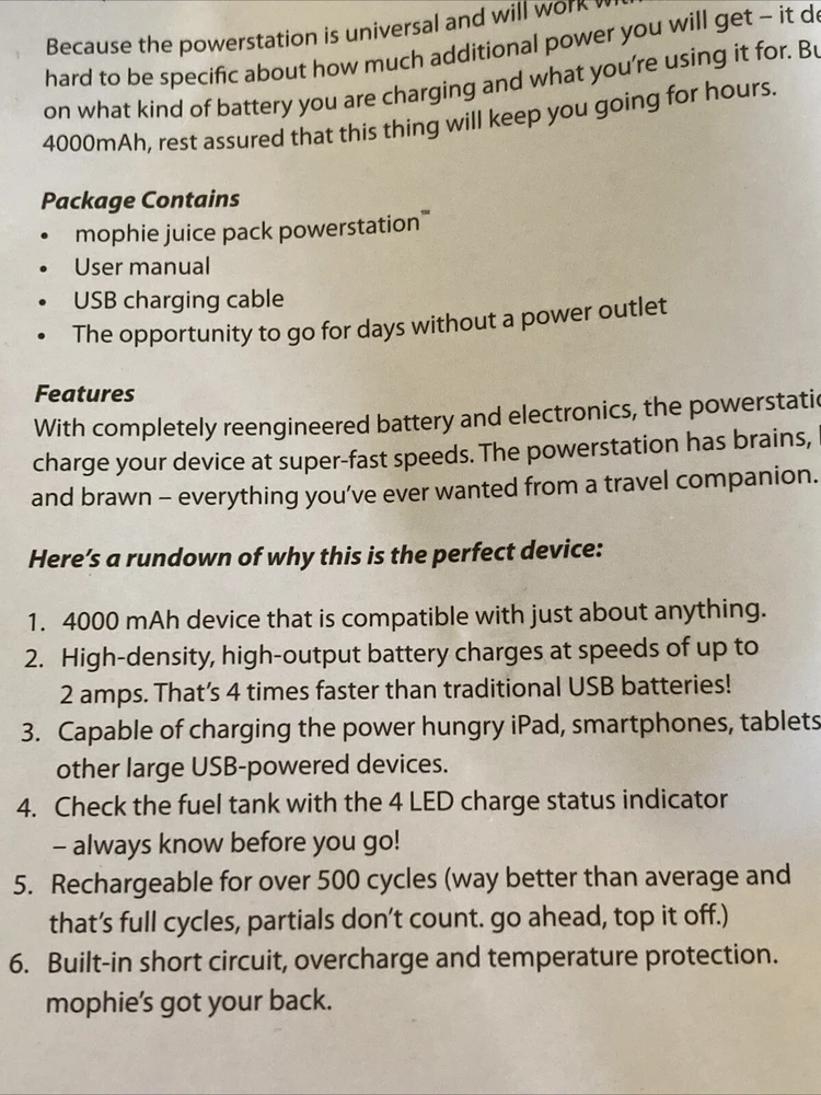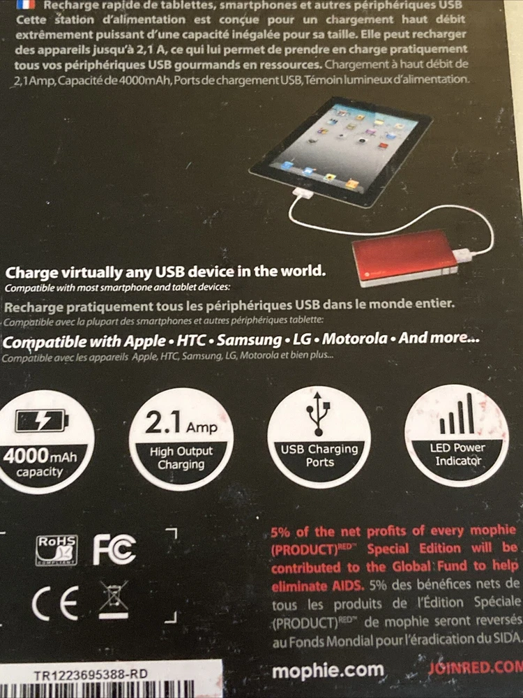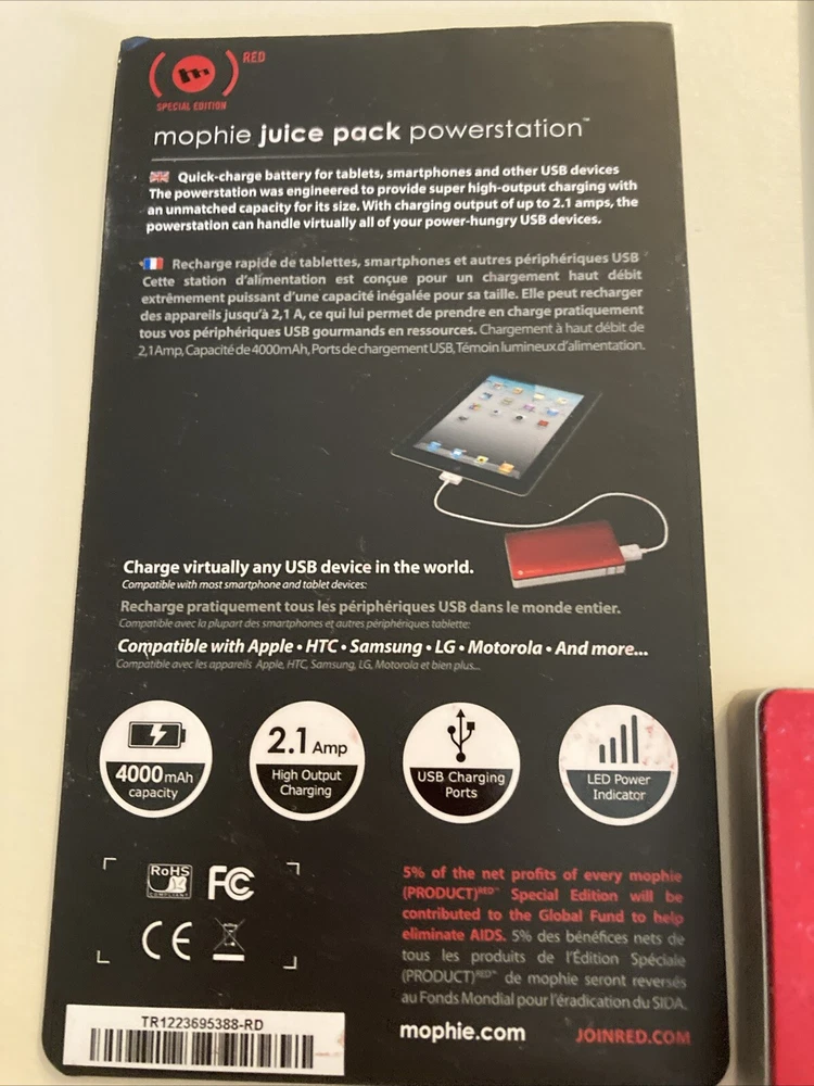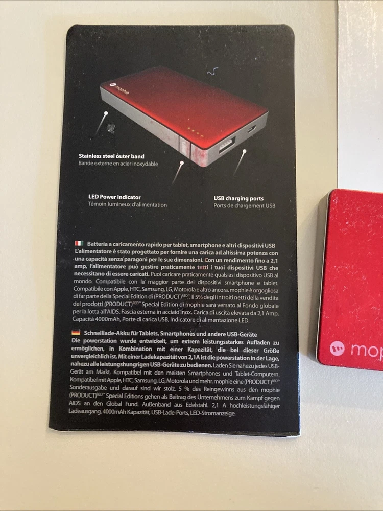Please read carefully before purchasing this item UNTESTED- sticky substance on exterior Up for sale today, A Mophie Power Boost XL 10,000 mAh portable battery. Cool Red Version. Please note as with all older discontinued electronics, I am selling this item AS-IS with No Returns or Refunds. There is No Warranty, written or implied with this sale. I am not responsible for any manufacturing defects which may have been caused by manufacturer during production of this item. Mophie juice pack Red Color USB cable NOT included Please ask any questions before you commit to your purchase. Sold AS-IS. No returns on this item.