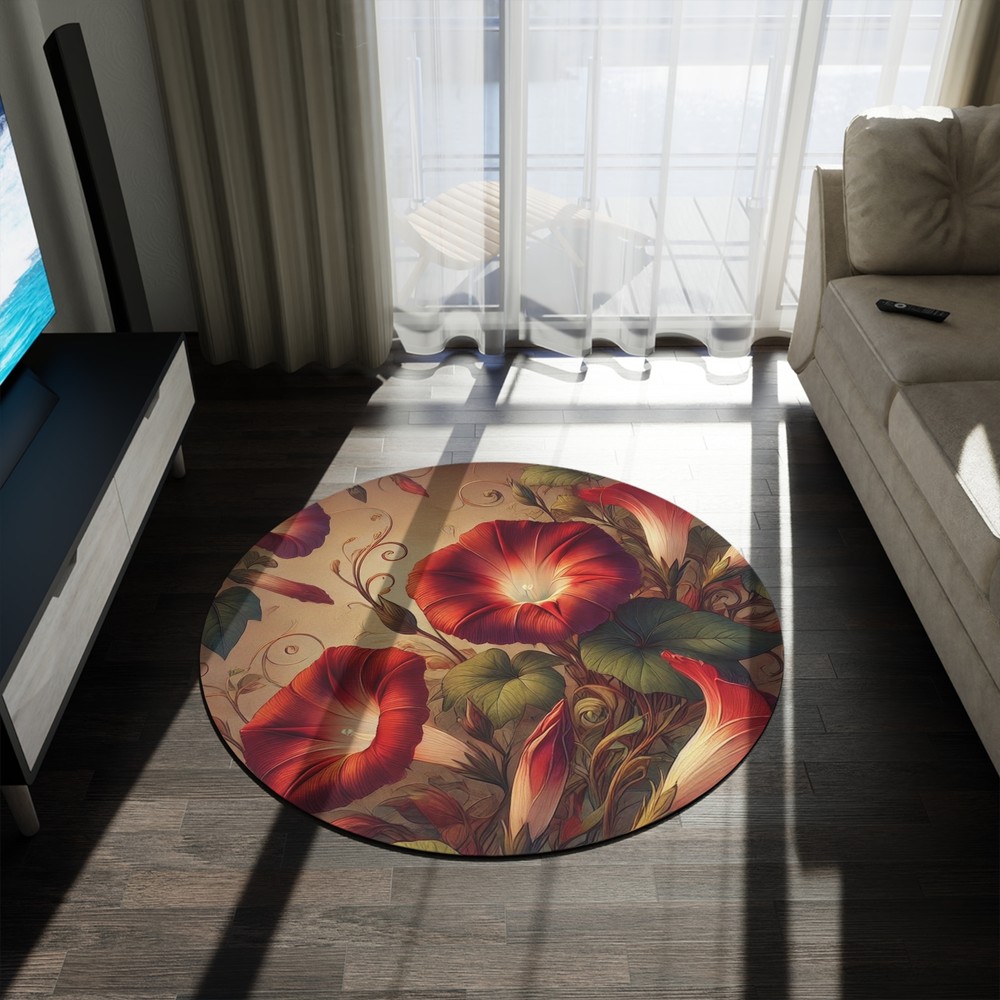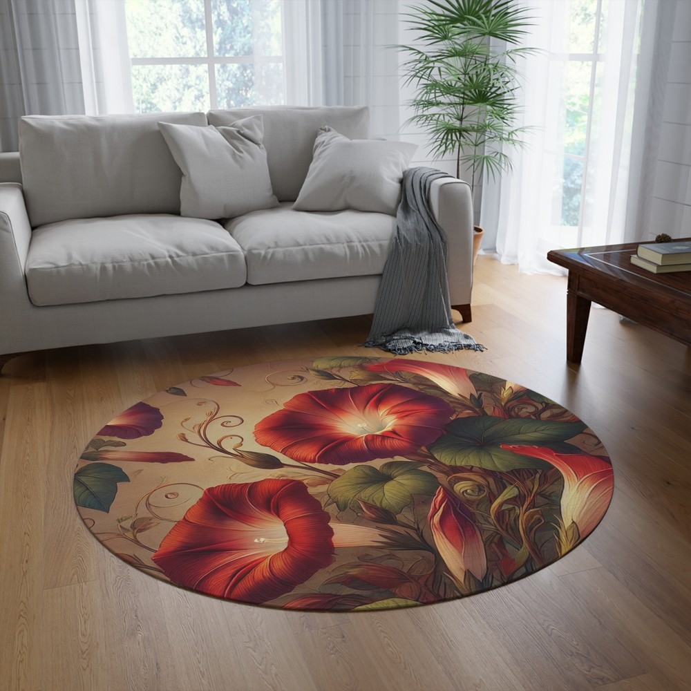 Transform your space with the "Morning Glories" Round Rug , a stunning decorative accent that brings the beauty of nature indoors. Featuring richly detailed red morning glories intertwined with lush greenery , this 60" ร 60" polyester chenille rug creates a warm and inviting atmosphere in any room. The intricate floral design, printed in picture-perfect quality , adds a touch of elegance and charm, making it a perfect statement piece for living rooms, bedrooms, or creative spaces. ๐ค Features: โ Vibrant & Eye-Catching Design โ Gorgeous red morning glories and swirling vines for a bold artistic touch. โ Soft & Durable Chenille Fabric โ A cozy, textured surface thatโs gentle underfoot. โ Coated Backing & Hemmed Edges โ Ensuring durability and a polished finish. โ Perfect Size (60" ร 60") โ Ideal for adding a natural element to your dรฉcor. โ Ultra-Thin Profile (0.2") โ Sleek enough to fit under furniture while still making an impact. ๐ฟ Bring the beauty of nature into your home with the "Morning Glories" rugโwhere art and comfort meet! โจ