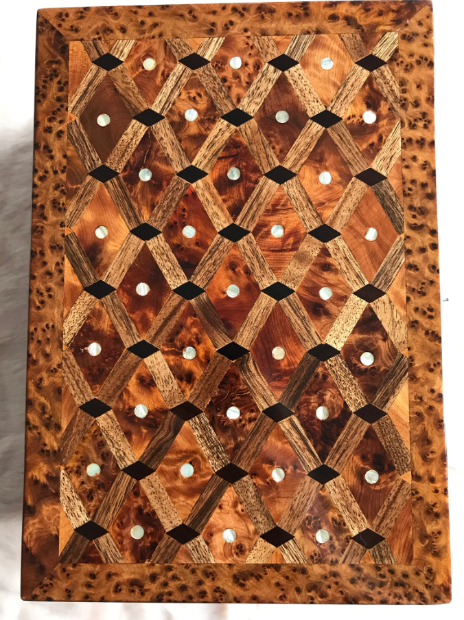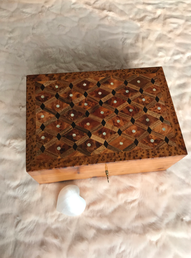 AtlasMuse Handmade Thuya Wooden Box β Crafted with Love by Moroccan Artisans AtlasMuse proudly presents its exquisite Thuya wooden box, meticulously handcrafted by skilled Moroccan artisans. Ideal for storing jewelry, cherished belongings, and important documents, this box combines functionality with timeless elegance. π‘ Quality Assured: Each box is crafted using the finest Thuya root burl wood, with careful moisture management to prevent deformation over time. β¨ Key Features: Three separated compartments inside, with spacious storage underneath (Two Storage Levels). Secure lockable design with a brass key. Customization available: engrave/print text on the lid, leather, or velvet interior lining. π Dimensions: Length: 20 cm / 7.9 inches Width: 13.5 cm / 5.3 inches Height: 8 cm / 3.1 inches π Shipping Details: Your order will be shipped within 1 day of purchase, with express shipping delivering in 3-5 business days. Experience the elegance and craftsmanship of AtlasMuse !