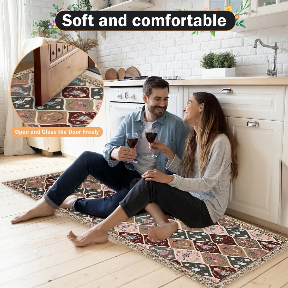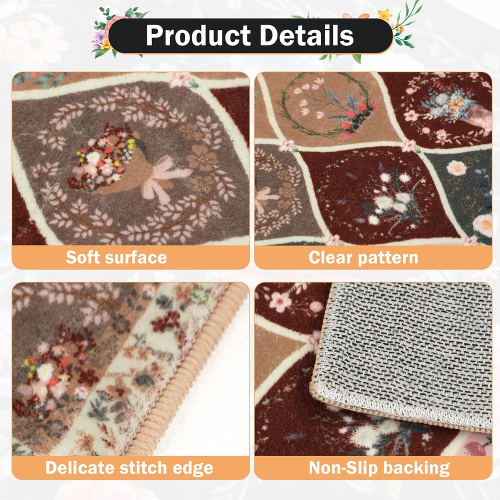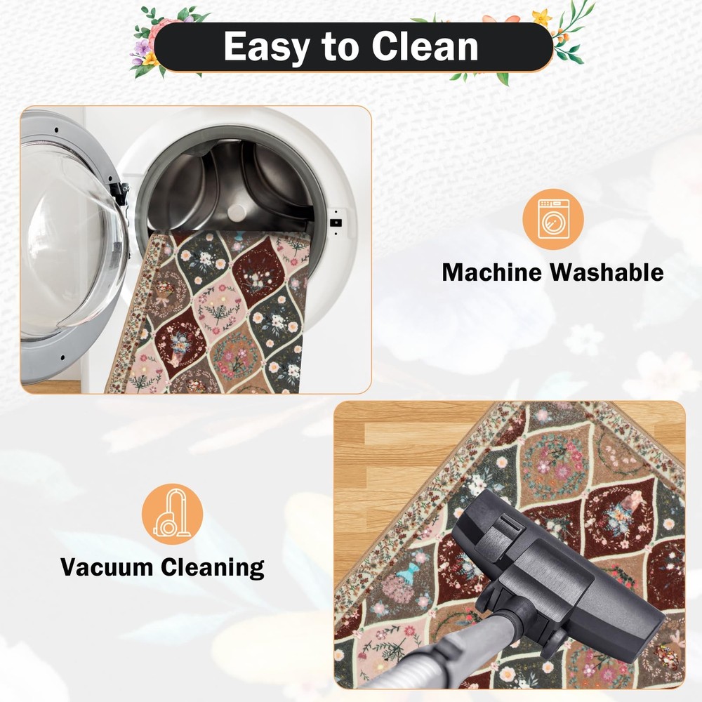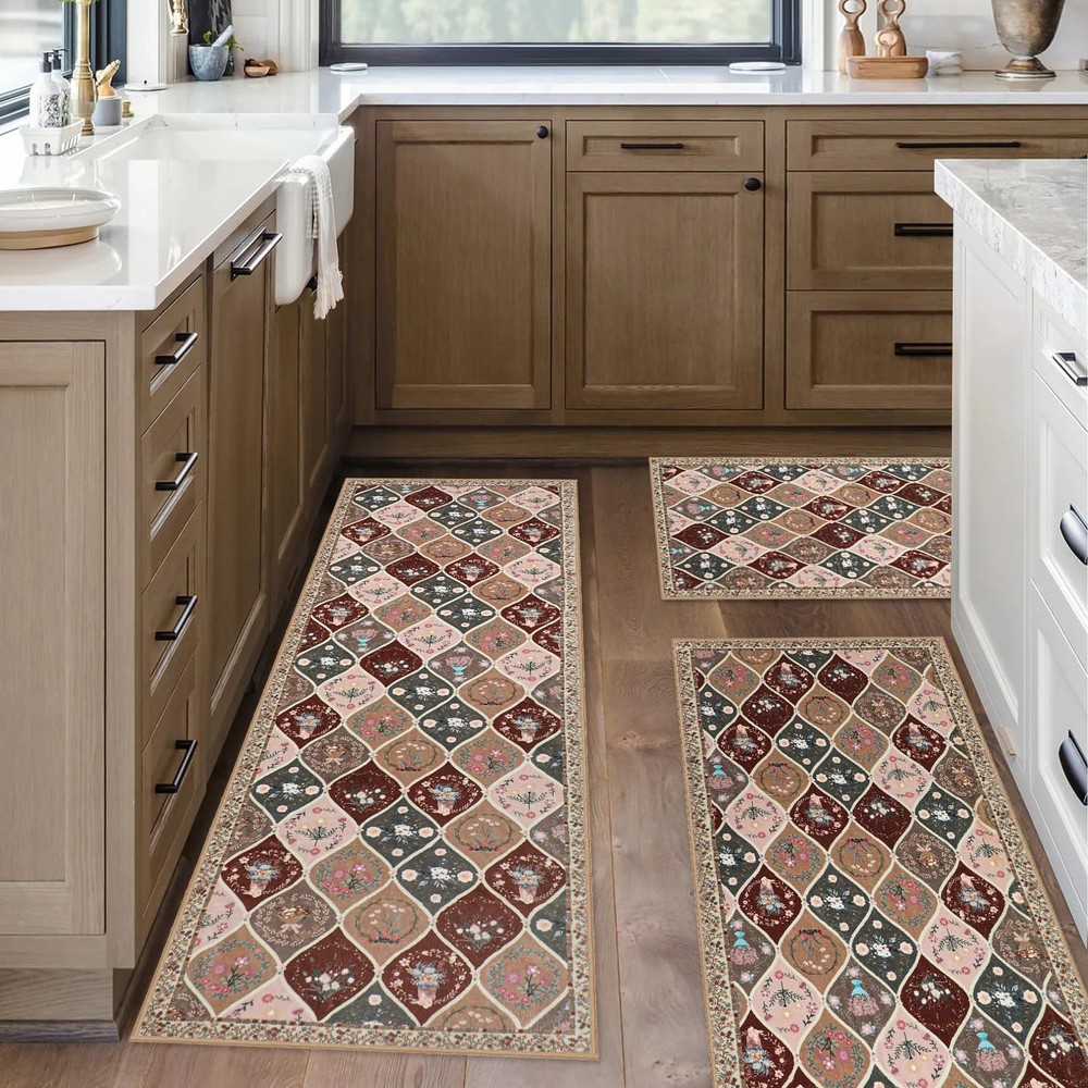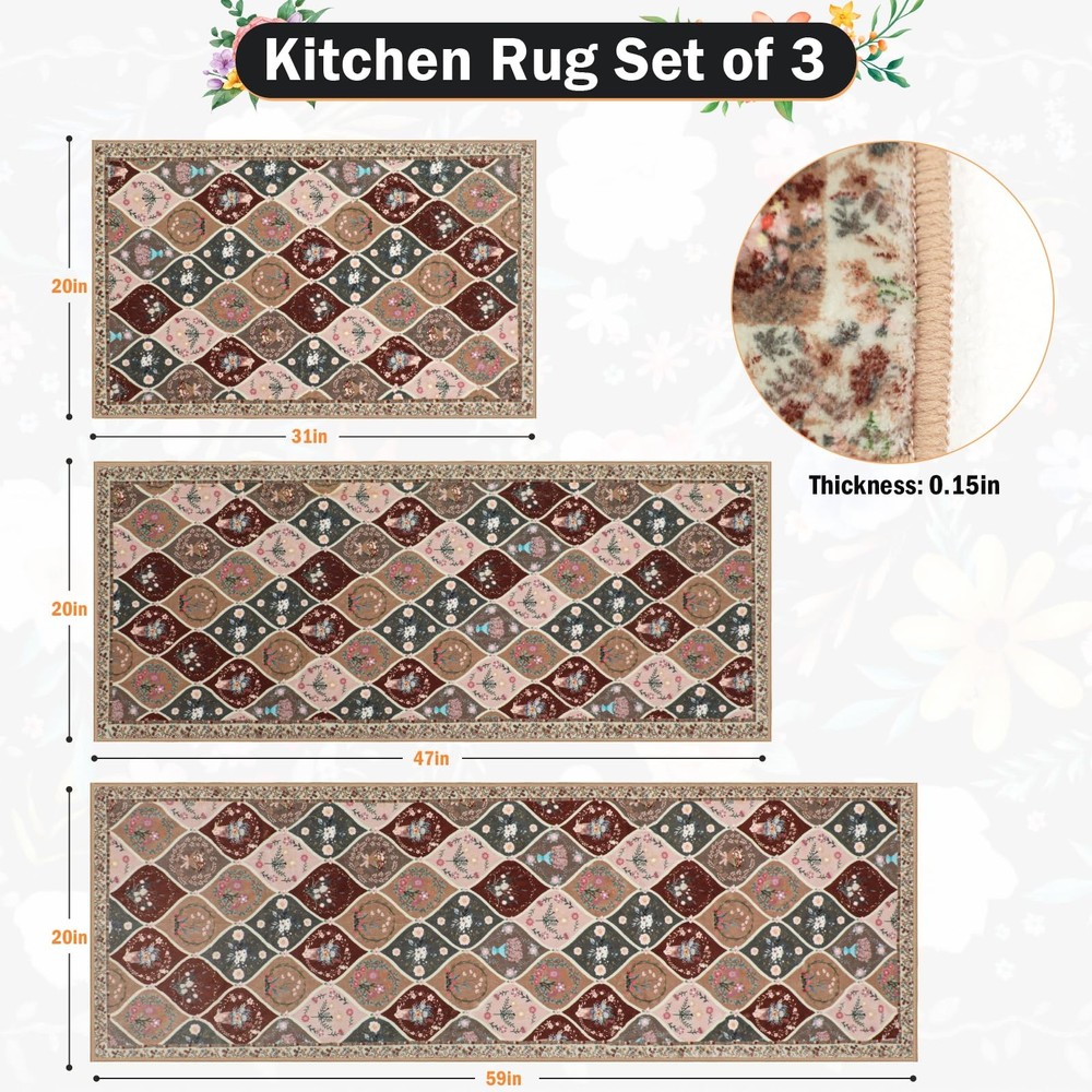 Product Description: Material: Polyester Color: Black, Pink, Green, Black/Multi, Yellow/Multi, Grey, Brown Size: 20"x32"+20"x47"+20"x59" Application: Kitchen, Dining Room,Laundry Room, Entryway, Front Door Package Included: 1 Set Kitchen Rugs Kitchen Rugs Sets 3 Piece with Runner: This vintage moroccan trellis kitchen rugs set includs 3 pieces,the size is 20"x32"+20"x47"+20"x59", Which is perfect for your kitchen, laundry room decor. This no slip kitchen mat rug set with runner will be very comfortable to stand on when you are cooking or baking or working. Non-slip Washable Kitchen Rugs Set: The floral kitchen floor mat set made of premium washed cashmere fabric material, TPR and Cotton Non-skid Backing, Which is very non slip and durable. Eye-catching design: This washable kitchen rug runner has a trendy fade style and floral pattern, the vintage elegant tones blend perfectly with different home designs, and the material of the surface is so soft and delicate, your feet will be very comfortable on it. Easy to clean and storage: This washable kitchen rug runner is very easy to clean, you can use hand-held vacumm to clean the dirt, for deeper clean, machine wash separately in cold water, using mild detergent. After machine cleaning,please hang it to dry or air dry. When you don't need to use it, just roll it up and put it in the utility room without taking up space. Versatile and Ideal for gift: The Farmhouse Kitchen Rugs Sets of 3 widely used for home decor, it can be used as kitchen rugs for floor, laundry room rug, indoor door mat, entryway rug, hallway runner rug, bathroom mats bedroom rug and etc. It is perfect as a gift for newlyweds or housewarming, as well as a birthday gift, holiday gift.