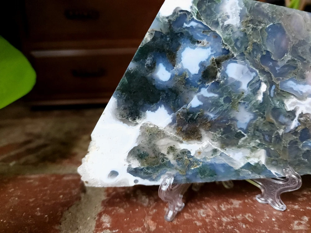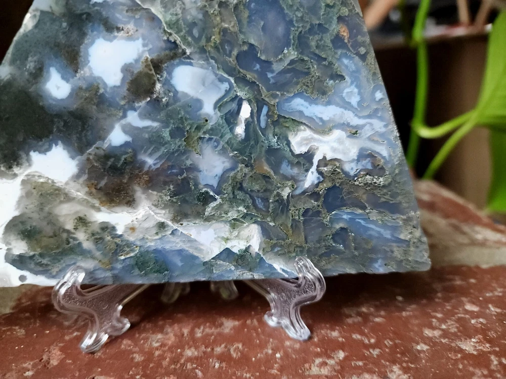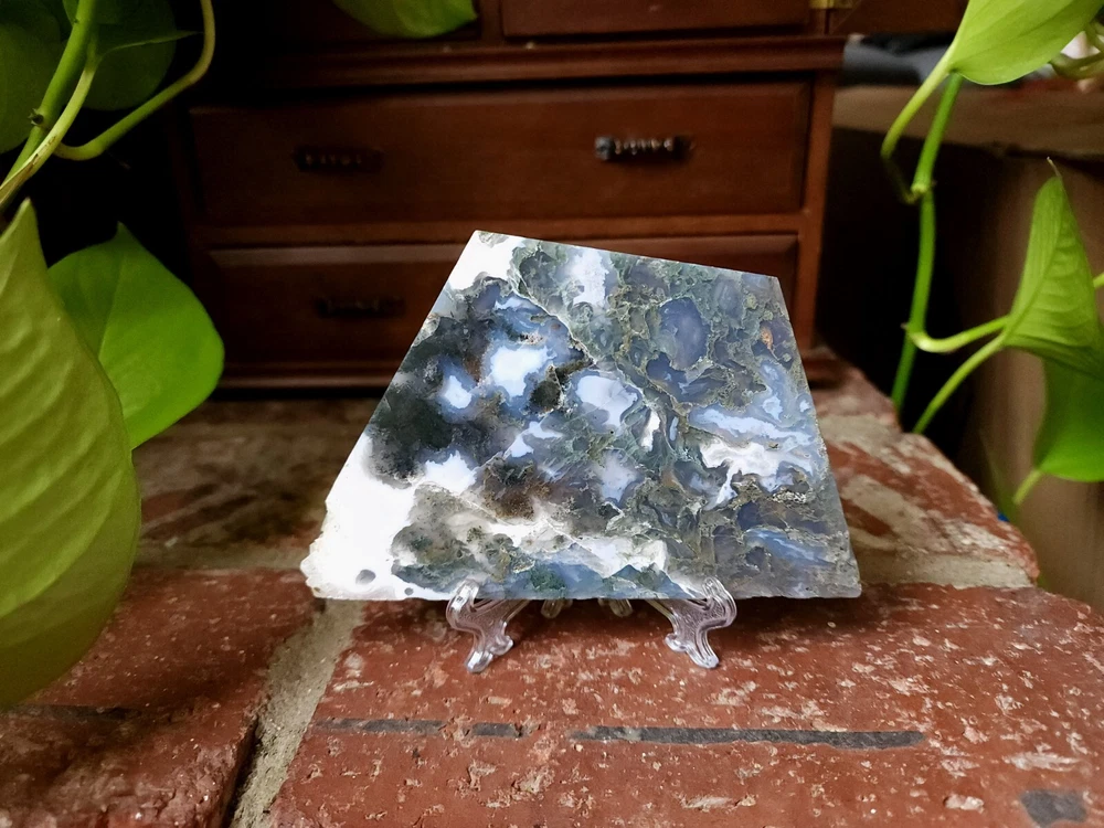 Moss Agate Crystal Slab Slice 8.8 oz 5.2 inches/ 3.3 inches Includes 1 clear display stand