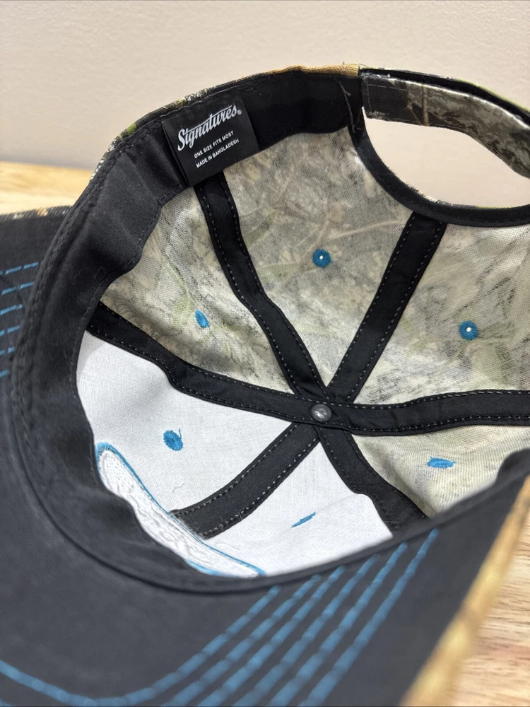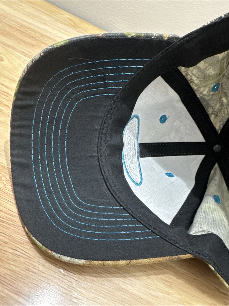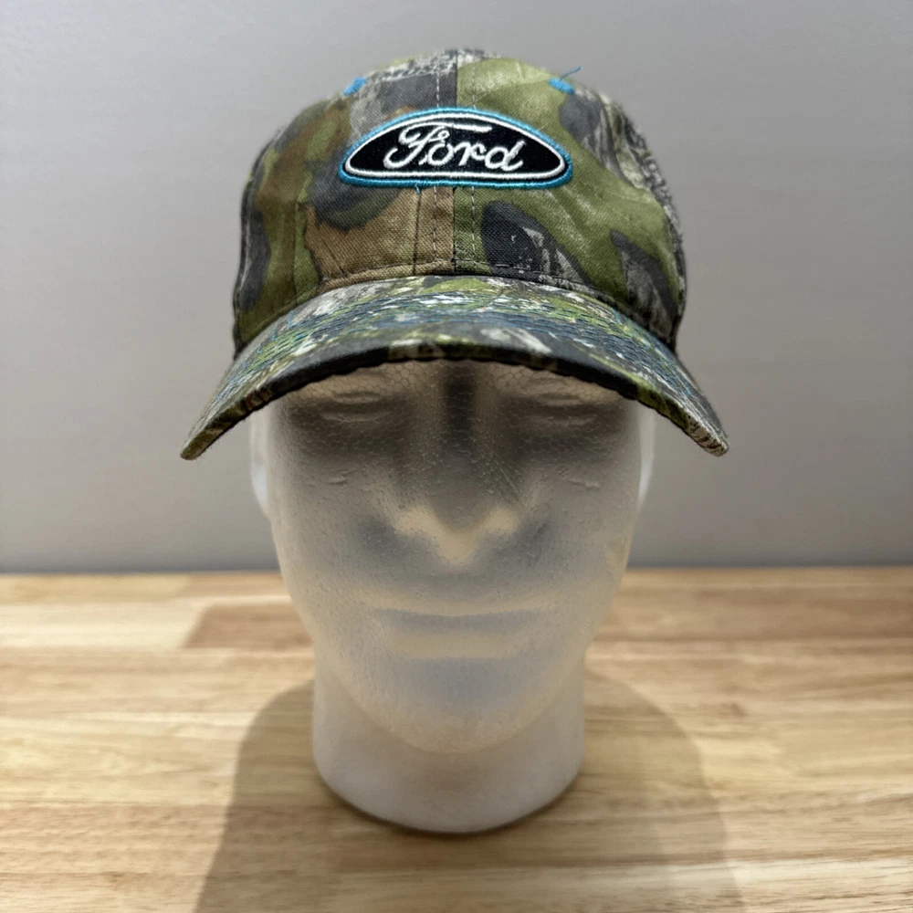Mossy Oak Camouflage SnapBack Hat With Embroidered Ford Logo One Size Fits Most. Hook and loop closure. Light blue thread accents on the logo, the bill and the ventilation holes. Clean and in great condition.
