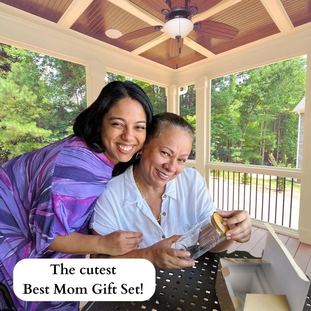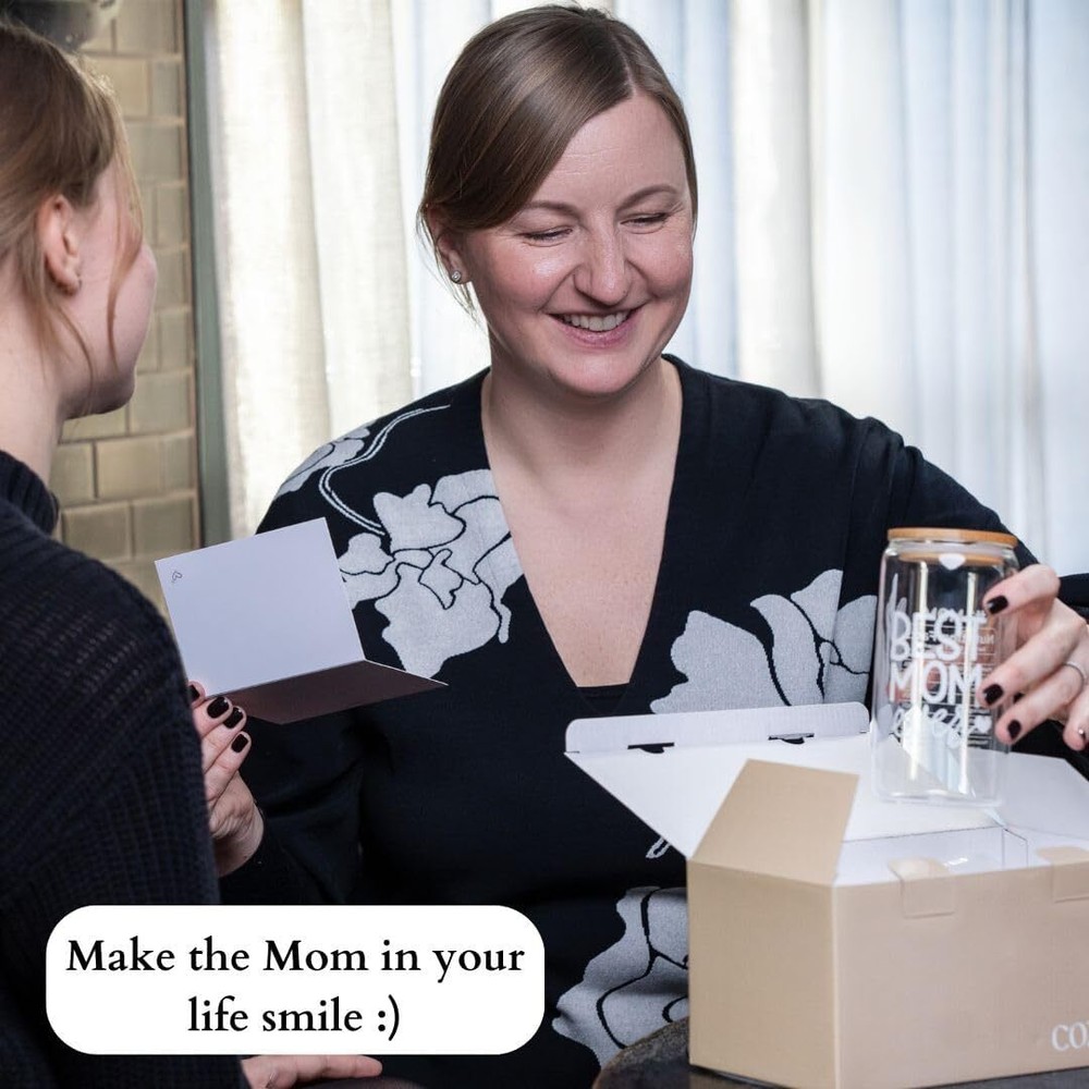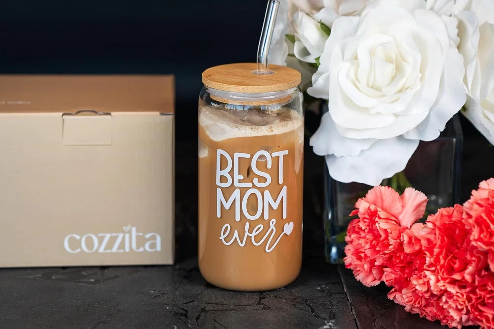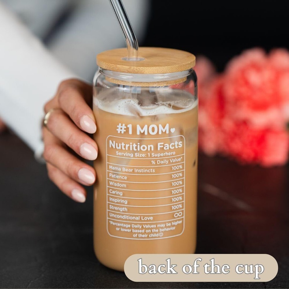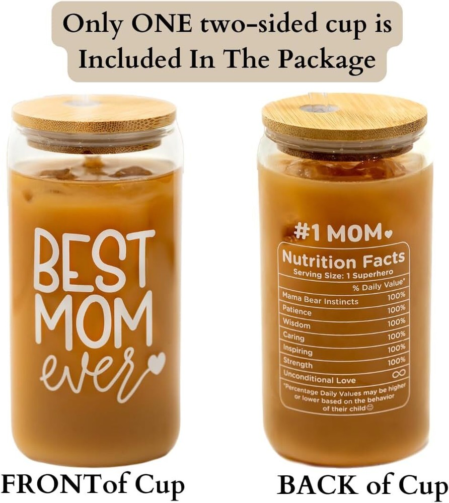 A FUNNY AND SWEET GIFT FOR MOM: Show mom how much you love her with this Mom Gift Set. Perfect as a New Mom Gift, First-Time Mom Gift, Gift for Mom from Son, Gift for Mom from Daughter, or Gift for Mother-in-Law. Also ideal for Bonus Moms or as Regalos para Mamá and Regalos para mi Madre. MOTHERS DAY GIFT FOR MOM: This Best Mom cup features loving and witty remarks designed to share smiles and laughter. It's ideal for Mom Gifts, Gifts for Mom, Best Mom Ever Gifts, Mom Birthday Gift for Mom, Funny Gifts Ideas For Mom. IN SLEEK PACKAGING: This gift set includes a beautifully designed gift box and one blank gift card, perfect for personalizing with your own thoughtful message. It also includes a 16 oz Glass Cup, a leak-proof Bamboo Lid, two reusable Glass Straws, and a Straw Brush Cleaner. PRACTICAL AND PORTABLE: Suitable for both hot and cold drinks, this cup is perfect for coffee, tea, smoothies, soda, beer, or cocktails. The bamboo lid and straw hole feature silicone seals to ensure leak-proof performance, whether at home or on the go. Fits in all cup holders! HIGH-QUALITY + NON-TOXIC: Made from 100% high-density borosilicate glass, this cup is free of lead, toxins, BPA, and BPS, ensuring safe use. The durable bamboo lid with a silicone seal enhances durability, while the reusable design helps reduce single-use plastic waste. Enjoy drinks free from harmful chemicals, with a pure, delicious taste.