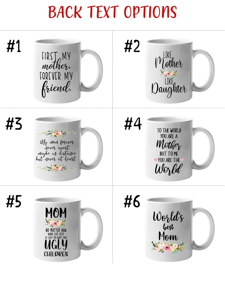 Mothers Day Personalized Mug Mother Daughter Gift Mom Gift Gifts For Mom Mothers Day Gift From Daughter Mothers Day Gift Product Details.. This high quality 11oz. ceramic white mug has a premium hard coat that provides crisp and vibrant color reproduction sure to last for years. Perfect for all hot & cold beverages. The highest quality printing possible is used. It will never fade no matter how many times you wash it. Material: 100% Ceramic. Print both sides. Dishwasher and Microwave Safe. High Gloss + Premium White Finish. Printed in the U.S.A. Personalized & Custom. We support personalized and custom mug to add custom, when placing an order, you can add notes to the "order note" in shipping address section. Also you can contact us directly via message. Shipping Info. Ready to ship in 1 to 2 business days, All products are made-to-order and proudly printed in the United States. Shipped by USPS and DHL, You will receive your order in 5-7 days. Replace & Refund. All products are defective during shipping broken, chipped will be replaced free of charge. You are not satisfied with the product, we will refund 100% money to you. If any other issues arise, please do not hesitate to message, we would be more than happy to assist you.