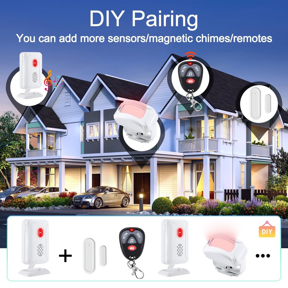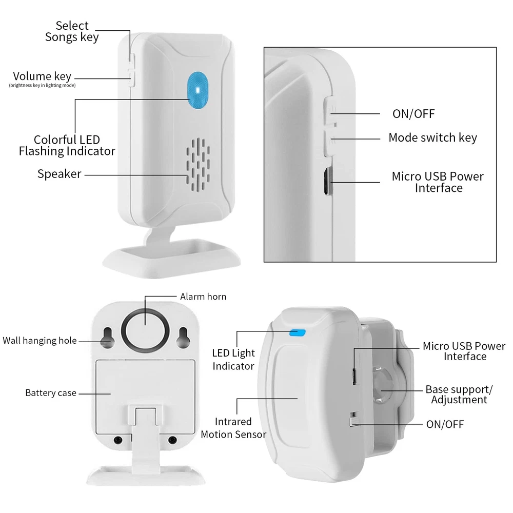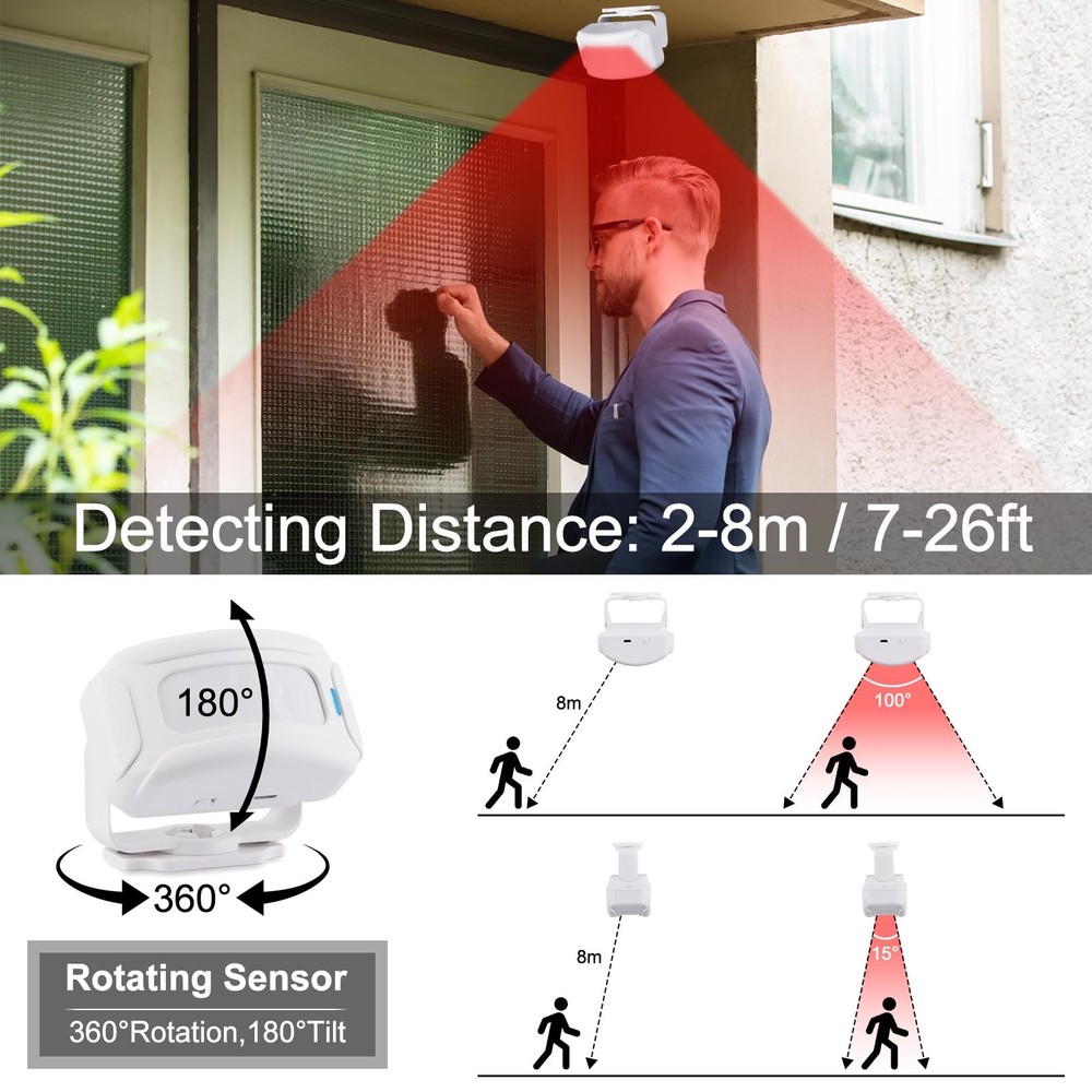 Specification: Material: ABS plastic Motion Sensor: 3xAAA(not included) Magnetic Sensor: 1xAAA(not included) Receiver: 3xAA(not included) Remote Controller: 1x12V 27A Power: 1W Battery lifespan: 5-7 months (based on 30 minutes per day) Low battery indication Sensing Distance: 8m Sensing Angle: 100°x15° Working Distance: 280m/918ft Ring Volume: ?113dB Receiver: Approx. 116x64x26mm/ 4.57x2.52x1.02inch Rmote Controller: Approx. 60x40x20mm/ 2.36x1.57x0.79inch Package include: 1xMotion Sensor,1xReceiver ✅【5 Modes Available】Not only serves as a motion sensor to detect alert but also has more other functions. With wireless motion sensor alarm various modes, it can also serve as a welcome message, alarm, doorbell, colorful light, and night light, 5 in 1 automatic door chime. Color/Red/Blue/Green, distinguish multiple entrances by different light colors. The door chime is a versatile and practical device that offers a range of features to enhance your home or business's security and convenience ✅【Melodies & Volume Adjustable】The receiver is a doorbell design with 36 ringtones and 5 welcomes doorbell sound for personal preferences. 4 levels volume adjustable(Loud/ High/ Middle/ Low ) from 113~25dB. Color light/ Lighting mode is silent and has 4 levels of brightness adjustable, great for people with hearing disabilities or there is sleeping baby in your house. The color light model also has 4 colors selectable. There are 4 levels of volume adjustable in welcome/doorbell/alarm mode. ✅【Sensitive & Wide Wireless Range】Motion sensor alarms with wide wireless range can communicate with other devices over a larger distance. The motion sensor catches movement from a broad scope of space, with working long-range transmission of up to 280m/918ft in open area between the receiver and motion sensor. The detection range of the motion sensor alarm dog barking is approximately 4-8m/13-26ft to keep you informed and safe. You can put it on the porch and put the receiver in your house. ✅【Wide Applications】Motion Alarms have a wide range of applications in various industries and settings and are essential in a home security system. It can detect movement in the surrounding areas - door entrance, gallery, gate, walking paths, apartment, office, hotel, store, and many other indoor places. And trigger alert to the linked receiver. It provides an added level of security and safety to your property and loved ones and can improve security, energy efficiency, and safety in homes. ✅【Easy Installtion】The device can be charged by micro USB or installed with batteries(infrared sensor needs three AAA batteries and receiver need three AA batteries) to make it work. Both the door motion sensor alarm and the receiver have a mounting base. The motion sensor doorbell can be rotated 360 degrees from left to right and 180 degrees from top to bottom. Easy installation makes the alarm more accessible to people. You can rotate to any position you need.