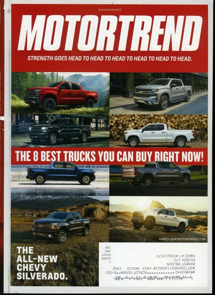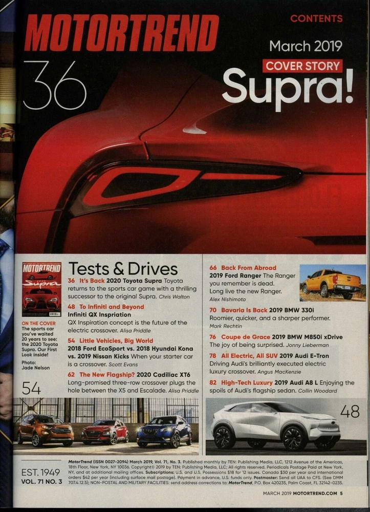 Motor Trend Magazine March 2019 8 Best Truck You Can Buy Now!, 2020 Supra Magazine is in very good condition. All pages are intact. Please see photos for more detailed description as the magazine in the photos is the magazine that you will receive. Shipping: Magazines are shipped securely in a cardboard mailer by first class mail or if multiple copies are bought possibly in a box or priority mail envelope with cardboard stiffeners marked do not bend. They are shipped to you as safely as they can be to prevent damage. We will not ship magazines Media Mail, which is illegal with magazines with advertising. United States Shipping, ** If you purchase more than one item, please request invoice before paying. This way shipping can be combined. If are items are paid for separately you will be charged shipping per item and no refund given for shipping. We have had to do this, as eBay charges sellers 10% fees on shipping per item and they will not refund our fees once payment is received. ** -------------------------------------------------------------------------------------- International shipments , we use eBay's Global Shipping Program. eBay sets the shipping on these and we cannot change shipping rates or send revised invoices. ------------------------------------------------------------------------------------------ On Buy It Now items if you are purchasing more than 1 item, add items to your cart that you want to purchase and then check out. This will allow you to pay for all of your items in one transaction and combine shipping. ** If you purchase more than one item, please request invoice before paying. This way shipping can be combined. If are items are paid for separately you will be charged shipping per item and no refund given for shipping. We have had to do this, as eBay charges sellers 10% fees on shipping per item and they will not refund our fees once payment is received. ** GUWIIGWU Listing and template services provided by inkFrog