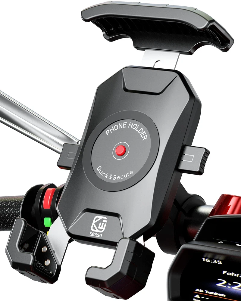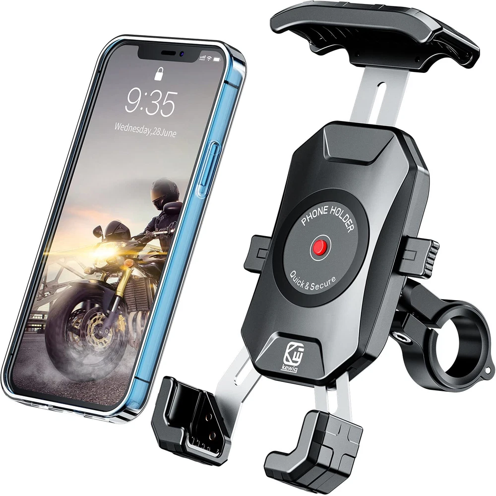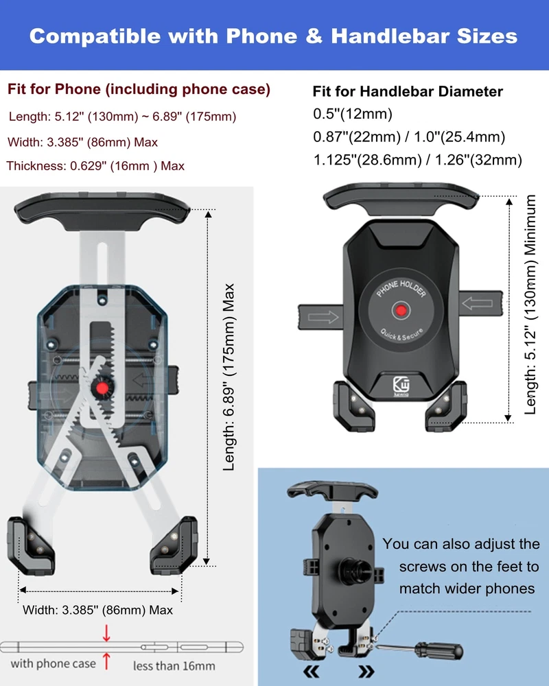 Bike phone holder for motorcycle & bike handlebars 1. With One-touch lock and quick release switch. 2. With aluminum alloy handlebar mounting base. 3. With stainless steel telescopic arms. 4. Built-in shockproof silicone. 5. 360 rotation design. 6. Can be mounting on handlebar and rear-view mirror frame. 7. Fit for 4''-7'' cellphones. 8. Compatible for handlebars 22mm to 32mm in diameter. One-handed operation: 1.Put the phone in motorcycle phone holder with just one hand, automatic lock your phone in one second when the central red button pressed. 2.You can pick up the phone as soon as you press the two telescopic module on motorcycle phone mount at the same time. Adopts ingenious design: The bike phone mount panel will not squeeze the phone camera, which can prevent the camera from being scratched. Package includes: 1* Motorcycle cell phone mount. 2* Rubber ring(diameter 22mm, 25.4mm). 1* Rear-view mirror mounting holder. 1* Allen wrench. 1* 80mm tape. 1* Using manual. One-handed Operation: The bike - motorcycle phone mount adopts one second automatically lock design. Put in or take out your phone with just one hand in one second, very convenient. 360 degree free rotation design, can be easy to adjust the mobile phone to horizontal or vertical screen. Enjoy a free and easy riding Sturdy and Safe: A special shape design of this bike phone mount can be wrapping four corners of your cell phone tightly. Adopts stainless steel telescopic arms and aluminum alloy handlebar mounting base, super sturdy! The bike phone holder holds your phone perfectly even riding on a bumpy road Shockproof Protection: The bicycle phone mount also built-in with soft silicone that keep your phone from scratches and vibration. Phone bike mount & phone camera features a non-contact designed to keep the phone camera from being squeezed and scratched while riding Easy Installation: This motorcycle cell phone mount can be installed on the handlebar or rear-view mirror frame. Come with two rubber ring inserts to provide a snug fit and protection of the mounting surface. You can add or remove the rubber ring inserts according to the diameter of handlebar. Equipped with a rear-view mirror mounting base, which is convenient for you to install the motorcycle phone holder on the rear-view mirror frame Compatible with Phone & Handlebar Sizes: This Motorcycle Phone Mount Holds Phones (Case Included) Dimensions: Length 5.12'' (130mm) - 6.89'' (175mm), Width 3.385'' (86mm) Max, Thickness 0.629'' (16mm ) Max. Compatible Handlebar Diameter: 0.5''(12mm) / 0.87''(22mm) / 1.0''(25.4mm) / 1.125''(28.6mm) / 1.26''(32mm). Suitable for installation on bike, bicycle, motorcycle, stroller, mountain bike, dirt bike, trek bike, road bike, golf cart, electric scooter, ATV, etc.