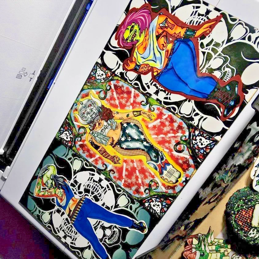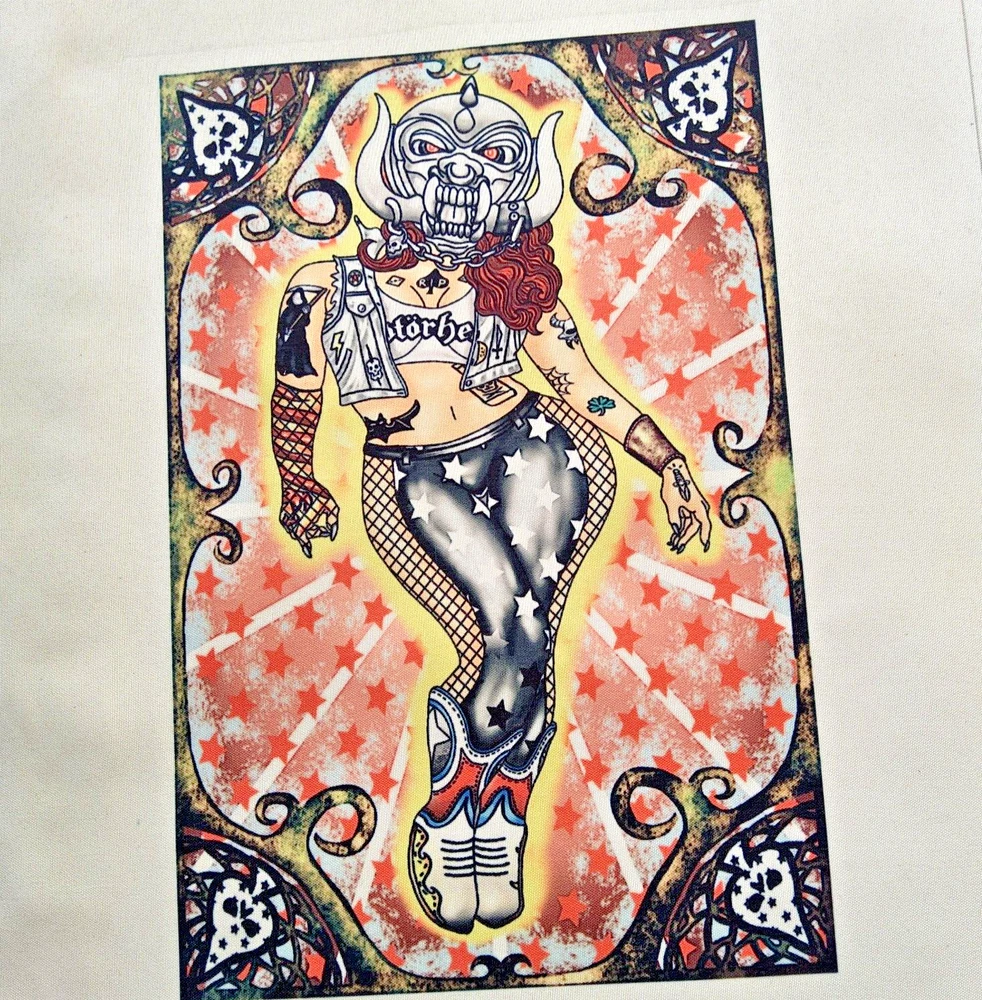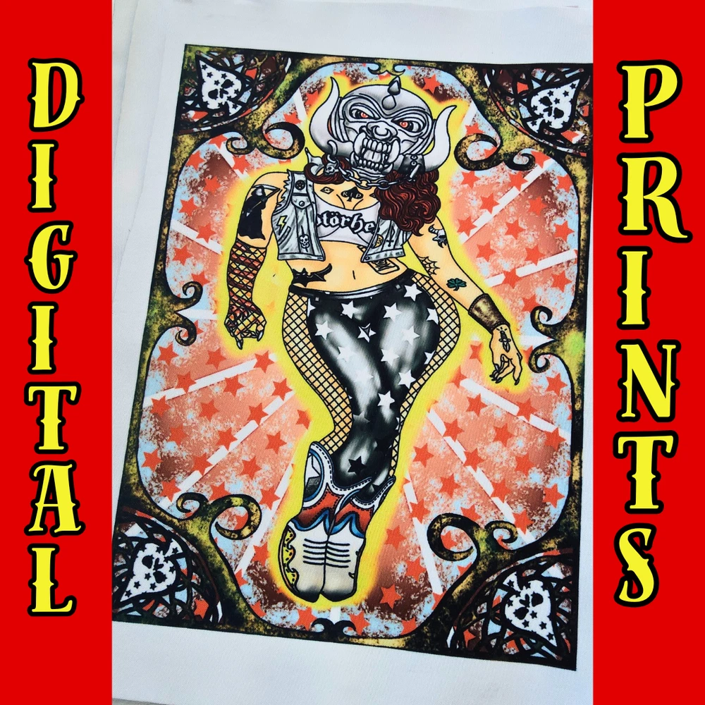 ***Treasure Suite offers you many pieces of my art prints now*** ###This section is for large sized sublimation prints of my digital art. measurements are 15"hx12"w. ### Up for grabs is a physical print of a curvy motorhead fan girl i drew up. Complete with Lemmy type boots,warthog mask,and tons of tattoos. *Welcome to my unique collection of digital art, where creativity meets craftsmanship! Each piece in this category features my original designs, heat pressed into vibrant sublimation prints on polyester canvas material. These art pieces are not just decorations, they are collectibles that bring a touch of gothic, rock and roll, horror, pin-up, and lowbrow art into your space. *I leave extra fabric border so you can gallery wrap on frame,cut to size, or sew onto clothes. Sublimation printing is what's done on clothing, like all over sweaters,tshirts,banners,etc. So that means it can be used on clothing and washed. If print gets wrinkled, you can steam it. *These pieces are perfect for adding a distinctive edge to your home or office, and they make fantastic gifts for art enthusiasts and collectors alike. Who doesn't enjoy vibrant digital art of out of this world space huntresses, demon witches, cyberpunk vixen cyborgs, spooky mistresses,and so on?
