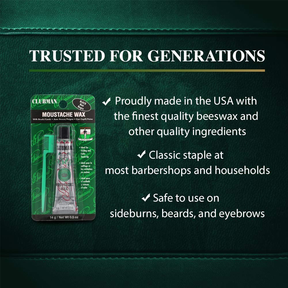 Moustache Wax Hang Pack Black 0.5 oz x 3 packs FLAUNT SOME MUSTACHE COLOR: Flaunt some color or just keep that prized moustache in place by getting this wax hang. The Moustache Wax Hang Pack Black is ideal for moustache styling and color touch up. Just be careful and don’t let the colored blends touch your skin or clothes, as it will stain on contact. This premium mustache wax should be included in your daily routine to achieve that godly 'stache. TAKE THAT STACHE INTO SHAPE: The untamed mustache can be problematic. Knockout everyone with your fresh macho look all the time with this wax from ! This will leave your beard looking well-groomed and maintained. You spent the time to grow that manly beard, and now it’s time to give that lumberjack face some style! NO FLAKING: Coming in a handy tube for hassle-free and no-mess stache styling that’s suitable for everyday use, this facial hair wax is water-soluble so it’s incredibly easy to wash out that you won’t even need to use a lot of soap. Just one lather is enough for the product to get rinsed out of your hair. It can also be reapplied with no build-up. HANDY, PERFECTLY SIZED FOR TRAVEL: Coming in a handy 0.5-ounce tube for hassle-free and no-mess styling that’s suitable for everyday use, the Moustache Wax Hang Pack - Black is made to go everywhere you do, so your mustache will look good even when you’re operating at travel size. It fits in your bag to provide quality shiny styling products when you’re on the go which makes it a great bargain buy that goes a long way! HIGH-QUALITY MEN’S GROOMING PRODUCTS: A true neighborhood barbershop staple, the Pinaud brand and its line of fine men’s toiletries have been the go-to brand for men’s grooming products since 1810. Pinaud makes products without compromise by focusing on only the finest ingredients to cleanse, nourish and protect. They offer a wide range of men’s grooming products that remain true to the brand’s heritage while bringing to market must-haves driven by market trends. Moustache Wax Hang Pack Black 0.5 oz x 3 packs All Natural Moustache Wax Hang Pack - Black is creamy and packed with volumizing and moisturizing ingredients, so the stache stays healthy-looking instead of crispy. It is easy to rework throughout the day so your style always looks fresh no matter what happens to it. This has all the nourishment for healthy, hydrated facial hair and is directed at the man who is looking for a simple, comfortable daily regimen that offers basic, no-frill products that has a subtle scent. Easy To Apply The brush included in this pack has the backbone of boar yet the softness of badger. Feels great on your face and whips up the wax fast. This is also great especially for men who prefer a firmer feel during the facial hair wax application process. It fits comfortably in your hand and provides good control and its size also makes it an excellent stache brush. Shipping We offer FREE shipping on all orders! We ship within Three business days of payment, usually sooner. We use a selection of shipping services such as UPS, FedEx, USPS etc. We only ship to the lower 48 states, no APO/FPO addresses or PO Boxes allowed. Local pickups and combined shipping options are not provided at this time. Return You can return a product for up to 30 days from the date you purchased it. Any product you return must be in the same condition you received it and in the original packaging. Please keep the receipt. Payment We accept payment by any of the following methods: PayPal Please pay as soon as possible after winning an auction, as that will allow us to post your item to you sooner! Feedback Customer satisfaction is very important to us. If you have any problem with your order, please contact us and we will do our best to make you satisfied. Contact Us If you have any queries, please contact us via ebay. We usually respond within 24 hours on weekdays. Please visit our eBay store to check out other items for sale! Thank you for shopping at our store.