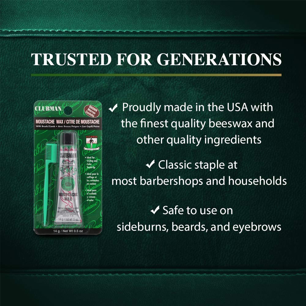 Moustache Wax Hang Pack Brown 0.5 oz x 3 packs FILL IN A TOUCH OF COLOR TO YOUR MUSTACHE: Flaunt some color to your stache! Moustache Wax Hang Pack comes in a brown colored formula that will help cover up grey beard hairs! Just be careful and don’t let the colored blends touch your skin or clothes, as it will stain on contact. Never greasy nor hard, your facial hair will look and feel healthier, thicker and stronger! HYDRATES AND MOISTURIZES FACIAL HAIR: This facial hair styling wax is creamy and packed with volumizing and moisturizing ingredients to keep the stache stays healthy-looking instead of crispy. It is easy to rework throughout the day so your style always looks fresh! This has all the moisture for healthy, hydrated facial hair. Directed at the man who is looking for a simple, comfortable daily regimen that offers basic, no-frill products that has a subtle scent and gets the job done! MOUSTACHE WAX WITH COMB / BRUSH: The brush included in this pack has the backbone of boar yet the softness of badger. Feels great on your face and whips up the wax fast. This is also great especially for men who prefer a firmer feel during the facial hair wax application process. It fits comfortably in your hand and provides good control and its size also makes it an excellent stache brush. PERFECTLY SIZED FOR TRAVEL: Coming in a handy 0.5-ounce tube for hassle-free and no-mess styling that’s suitable for everyday use, the Moustache Wax Hang Pack - Brown is made to go everywhere you do, so your mustache will look good even when you’re operating at travel size. It fits in your bag to provide quality shiny styling products when you’re on the go which makes it a great bargain buy that goes a long way! QUALITY MEN’S GROOMING PRODUCTS: is committed to excellence in men's grooming and works to provide professional products at affordable prices. Approved and favored by professional hairstylists and local barbers. Founded in France in 1810, offers fine shaving and grooming products for the modern gentlemen. Shipping We offer FREE shipping on all orders! We ship within Three business days of payment, usually sooner. We use a selection of shipping services such as UPS, FedEx, USPS etc. We only ship to the lower 48 states, no APO/FPO addresses or PO Boxes allowed. Local pickups and combined shipping options are not provided at this time. Return You can return a product for up to 30 days from the date you purchased it. Any product you return must be in the same condition you received it and in the original packaging. Please keep the receipt. Payment We accept payment by any of the following methods: PayPal Please pay as soon as possible after winning an auction, as that will allow us to post your item to you sooner! Feedback Customer satisfaction is very important to us. If you have any problem with your order, please contact us and we will do our best to make you satisfied. Contact Us If you have any queries, please contact us via ebay. We usually respond within 24 hours on weekdays. Please visit our eBay store to check out other items for sale! Thank you for shopping at our store.