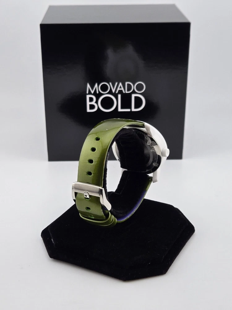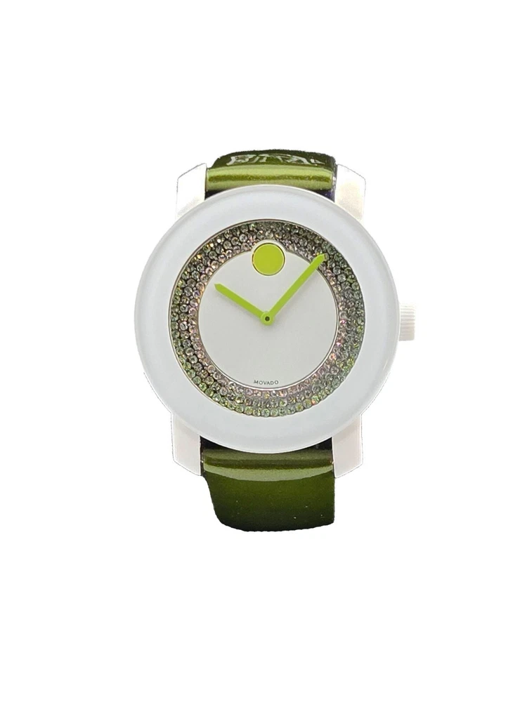 Movado Bold Women's White Crystal Dial Leather Band Watch - 3600316 ($495 MSRP) With Original Box! This watch is a Shelf Pull from one of the Major Department Stores. Watch has scratches on the watch case/band. The Movado Bold Women's White Crystal Dial Leather Band Watch (Model 3600316) effortlessly combines elegance and contemporary style. Featuring a white TR90 composite material and stainless steel case, this timepiece offers both durability and sophistication. The eye-catching light green leather strap complements the white dial, creating a fresh, modern look. At the heart of the design, the dial is adorned with light green pave crystals that catch the light with every movement, while the silver-tone hands provide a sleek contrast, making it easy to tell time at a glance. The watch also includes a fixed bezel and a scratch-resistant K1 crystal, ensuring longevity and clarity. This watch is powered by a reliable quartz movement, offering precise timekeeping and exceptional accuracy. The 36 mm round case fits comfortably on the wrist, making it perfect for both casual and formal occasions. The solid case back and pull/push crown add to the sturdy design, while the water resistance up to 30 meters (100 feet) provides additional practicality for everyday wear. With its combination of classic aesthetics and modern functionality, the Movado Bold watch is the perfect accessory for any woman who values both style and performance. Whether dressing up for a special event or adding a touch of sophistication to a casual outfit, this Movado Bold Women's Watch is sure to turn heads. Its timeless design and high-quality craftsmanship make it a perfect addition to any jewelry collection. The buckle clasp ensures a secure and comfortable fit, while the hour and minute functions keep you on time for every occasion. The Movado Bold 3600316 is a statement piece that reflects a blend of luxury, practicality, and modern style. Features White tr90 composite material and stainless steel case with a green leather strap. Fixed bezel. White with light green pave crystals dial with silver-tone hands. Dial Type: Analog. Quartz movement. Scratch resistant k1 crystal crystal. Pull / push crown. Solid case back. Case size: 36 mm. Round case shape. Buckle clasp. Water resistant at 30 meters / 100 feet. Functions: hour, minute. Fast and Free Shipping You're already purchasing the item. Why pay additional for shipping, especially slow shipping? We get your order shipped out within 1-business day and delivered to your doorstep as quickly as possible. Competitive Pricing With our dynamic pricing model, our prices are always competitive. Our prices are some of the lowest that you will find on the internet. Rest assured that you're getting a good deal when purchasing with us. 30-day Money Back Guarantee We are committed to making sure that you leave this transaction satisfied. If you're unhappy with the product for any reason, you may return it back for your money-back or a replacement within 30 days. No questions asked!