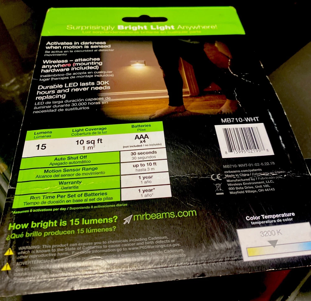 Bulb Life Hours:30KSensor Type:MotionMPN:MB710-WHTFeatures:Wireless Installation, Detects Motion From Up To 10 ft. Away, 30-Second Auto Shut Off, Mounting Hardware IncludedType:LED Night LightMaterial:PlasticBrand:Mr. BeamsLumens:15 LumensPower Source:BatteryCountry/Region of Manufacture:ChinaMounting:Wall MountedLight Color:Warm WhiteUPC:815995021998Installation Area:IndoorModel:Mr Beams MB710-WHTLighting Technology:LEDColor:Whitegtin13:815995021998Number of Lights:1Item Width:4.23 in.Item Height:2.48 in.