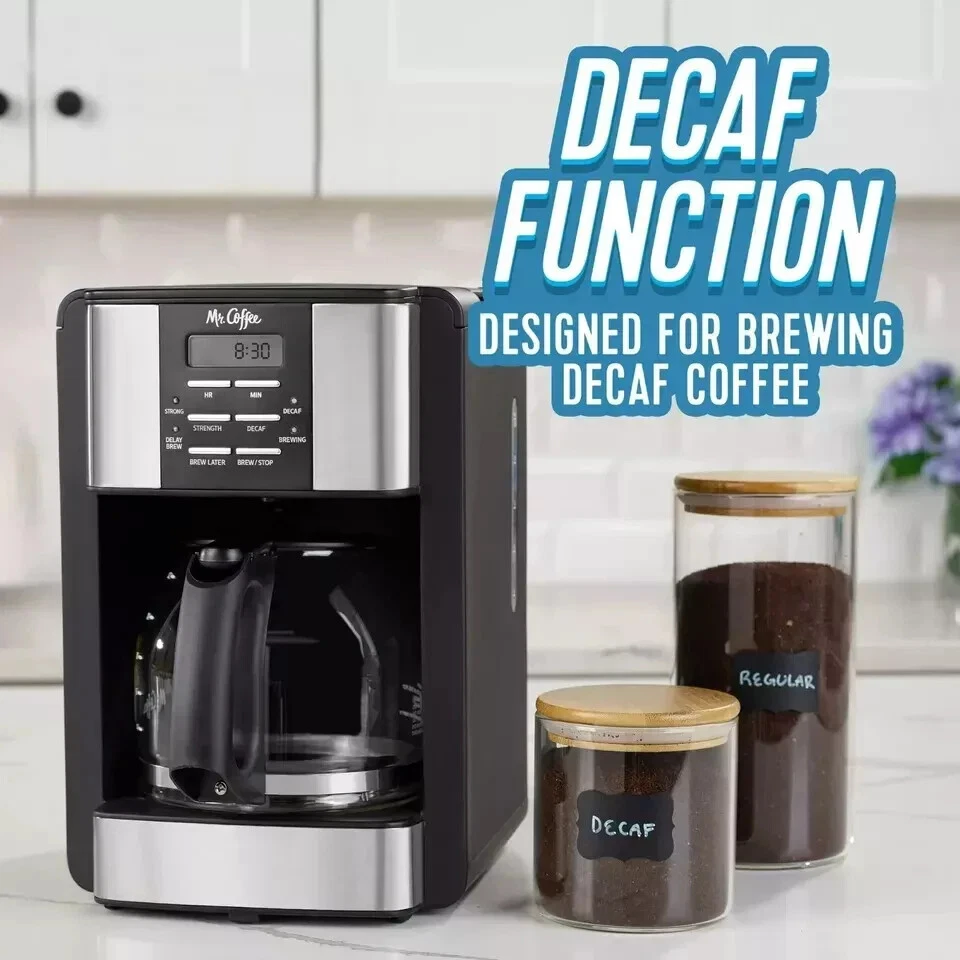 Mr. Coffee Programmable 3-Way Brewing System 12-Cup Drip Coffee Makers, New Product details Perfect for busy days, this sleek, stainless steel Mr. Coffee 12-Cup Programmable Coffee Maker features a flexible 3 Ways to Brew System that makes it easy to brew a delicious cup of coffee exactly how you like it. With the touch of a button, choose between Regular, Strong Brew, and Decaf, and enjoy your coffee in minutes! Just add your coffee, use the Water Window to check the water levels, and you’re good to go! The Delay Brew setting makes it easy to schedule brewing ahead of time, so you can wake up to a fresh cup. Want your coffee right away? Grab-a-Cup Auto Pause lets you get a cup before the brewing cycle is over. The convenient 4-Hour Auto-Shutoff function automatically turns off the coffee maker, so you don’t have to. Whether you’re brewing coffee for yourself or for a crowd, this feature-packed coffee machine is a great addition to your kitchen coffee station. Mr. Coffee Programmable 3-Way Brewing System 12-Cup Drip Coffee Makers Brew Selector: Choose between Regular, Strong Brew, or Decaf coffee at the touch of a button for a personalized brewing experience Lift & Clean Filter Basket: The filter basket lifts out for fast and easy cleanup Water Window: The easy-view Water Window allows you to see the water level to prevent overflow Auto-Pause: Grab-a-Cup Auto Pause stops the brewing cycle, allowing you to pour a cup before brewing is finished Auto-Shutoff: The 4-Hour Auto-Shutoff feature automatically turns off the coffee maker for added safety Specifications Features: Automatic Shut-Off, Programmable, Temperature Control, Water Level Indicator Brand: Mr. Coffee Assembled Product Dimensions (L x W x H): 9.30 x 11.10 x 14.60 Inches