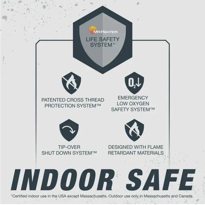 About this item Radiant propane heater in a portable, indoor safe design 3,800 BTUs heats up to 95 square feet by Mr. Heater Tip over safety shut off switch and low oxygen safety shut off sensor Runs 5.6 hours on standard 1 lb propane cylinder