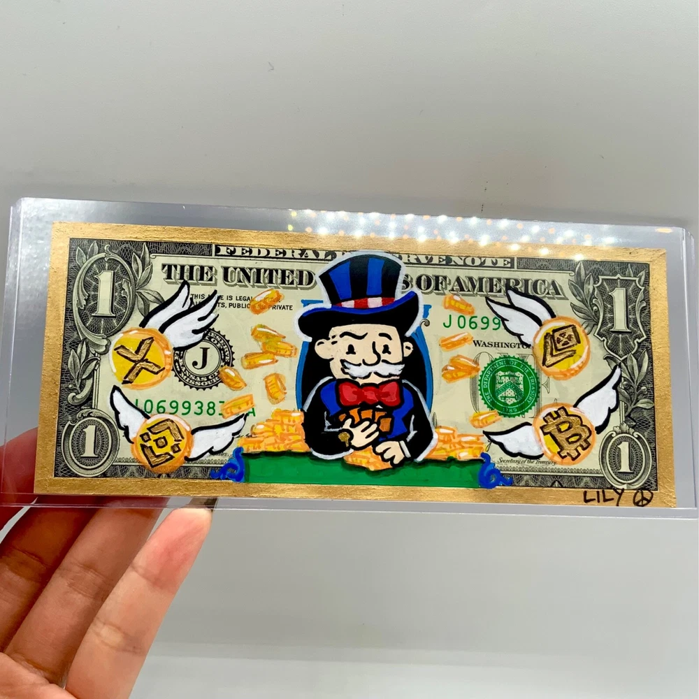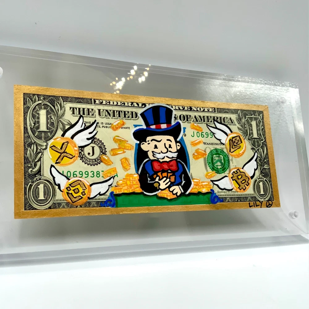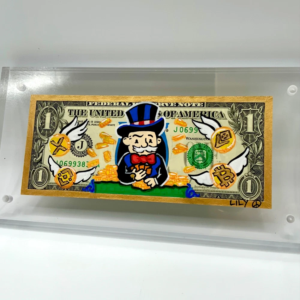 Mr Monopoly betting all his coins for that cryptocurrency. Blending that old money with that new money. Inspired by nostalgia, pop culture and currency. Hand-painted acrylic and gold lustre on usd. Packaged with care and comes in a 7”x3” plastic protective sleeve.