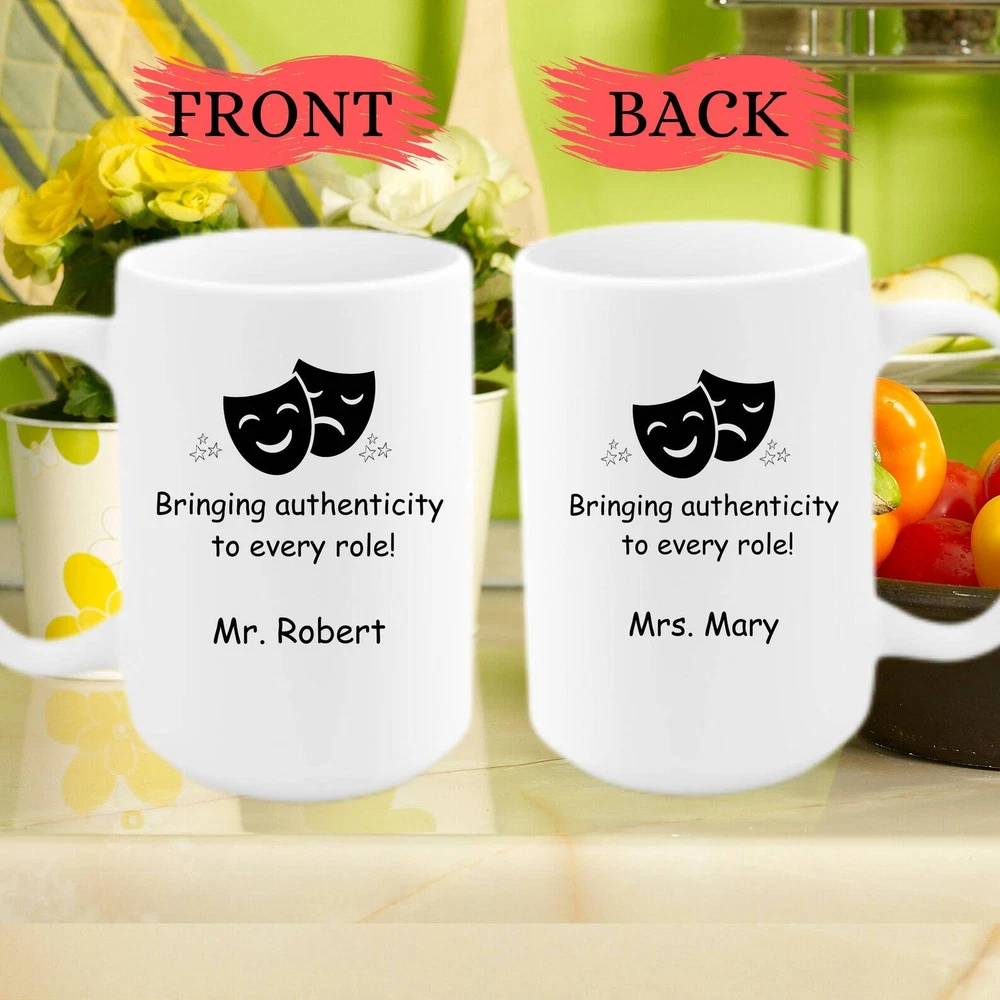 Mr Mrs Theater Teacher Gift Theatre Custom Mug Giftdrama Teacher Theater Acting Lover Actor Tumbler Actress Gift Gift For Her Or Him Product Details.. This high quality 11oz. ceramic white mug has a premium hard coat that provides crisp and vibrant color reproduction sure to last for years. Perfect for all hot & cold beverages. The highest quality printing possible is used. It will never fade no matter how many times you wash it. Material: 100% Ceramic. Print both sides. Dishwasher and Microwave Safe. High Gloss + Premium White Finish. Printed in the U.S.A. Personalized & Custom. We support personalized and custom mug to add custom, when placing an order, you can add notes to the "order note" in shipping address section. Also you can contact us directly via message. Shipping Info. Ready to ship in 1 to 2 business days, All products are made-to-order and proudly printed in the United States. Shipped by USPS and DHL, You will receive your order in 5-7 days. Replace & Refund. All products are defective during shipping broken, chipped will be replaced free of charge. You are not satisfied with the product, we will refund 100% money to you. If any other issues arise, please do not hesitate to message, we would be more than happy to assist you.